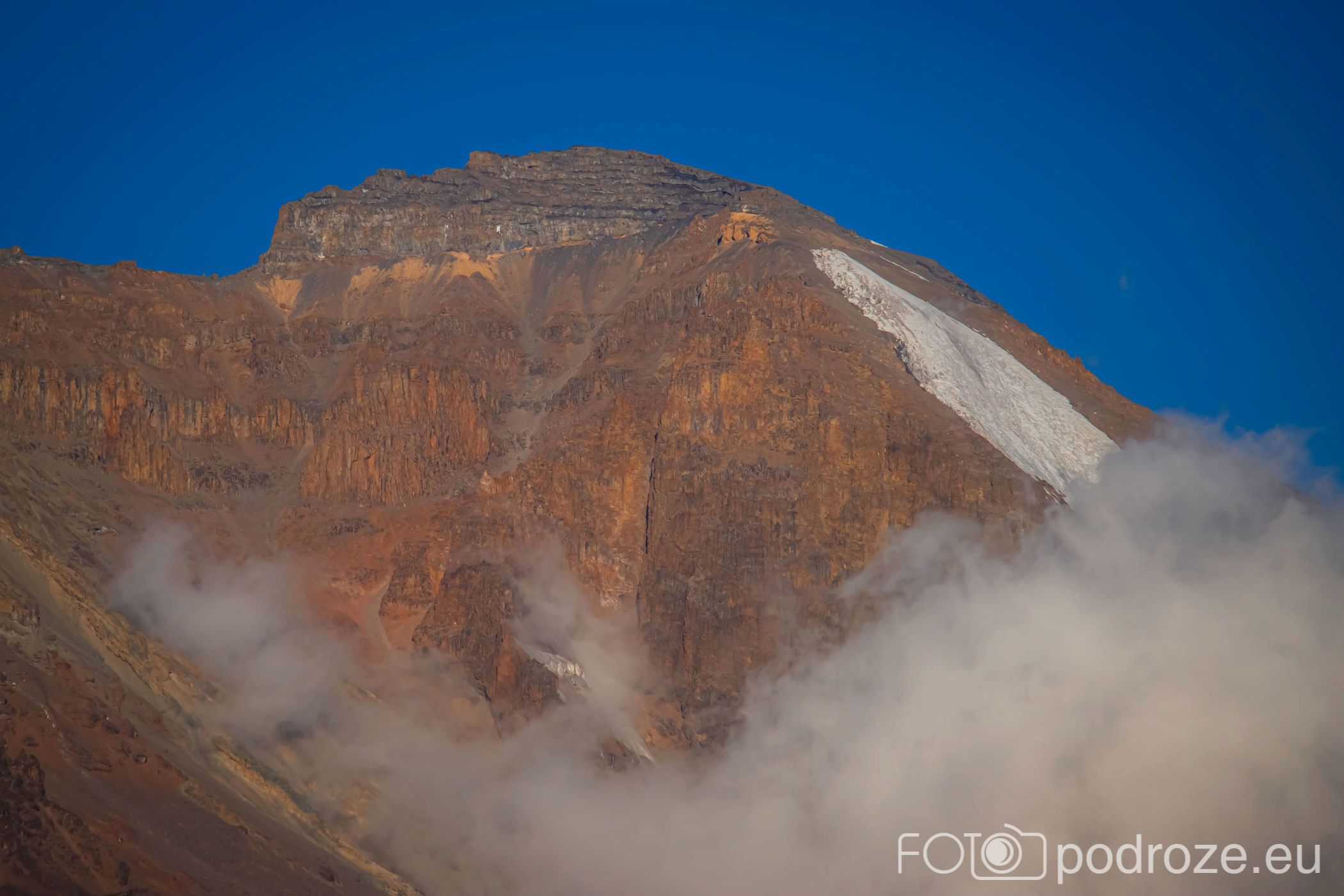 Oznacza „wolno, wolno” … to nasze hasło na całą wyprawę. Bo tu się nie da szybko z wielu powodów. A nasz główny to brak aklimatyzacji. Kolejny, ostatni przed obozem odcinek drogi odkrywa przed nami prawdę, czyli fakt, że znajdujemy się na wulkanie. Widoki po prostu stają się coraz bardziej surowe, a skały typowo wulkaniczne.