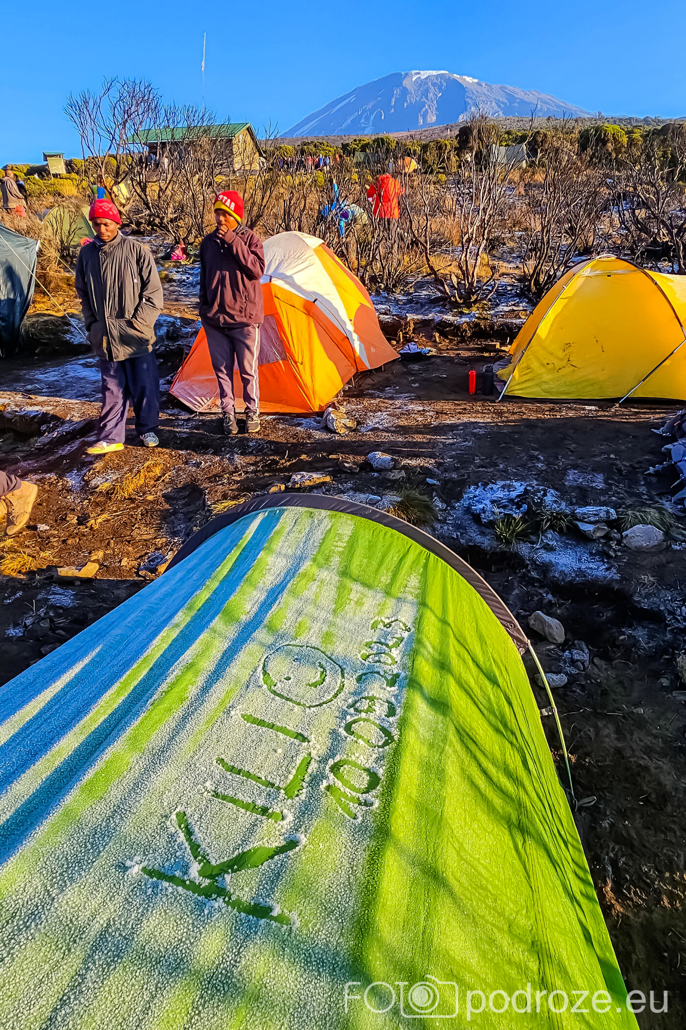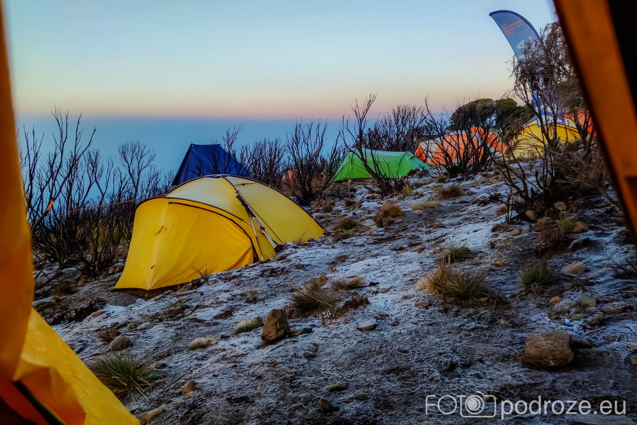 Bladym świtem budzi nas okropny mróz, Ostatni obóz na trasie okazuje się najzimniejszy. Strącam z namiotu grubą warstwę szronu i odbieram ostatnią herbatkę przyniesioną do namiotu.