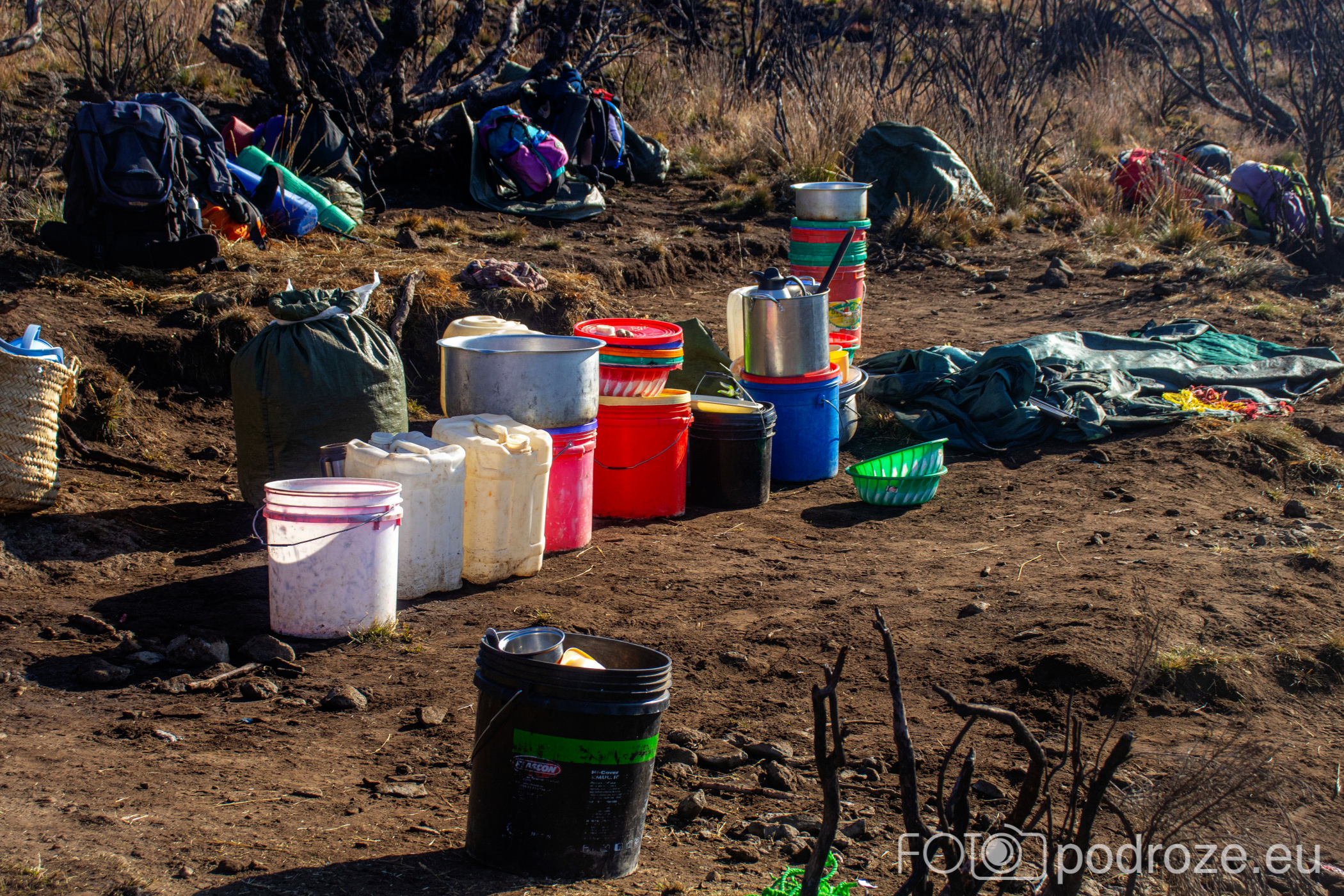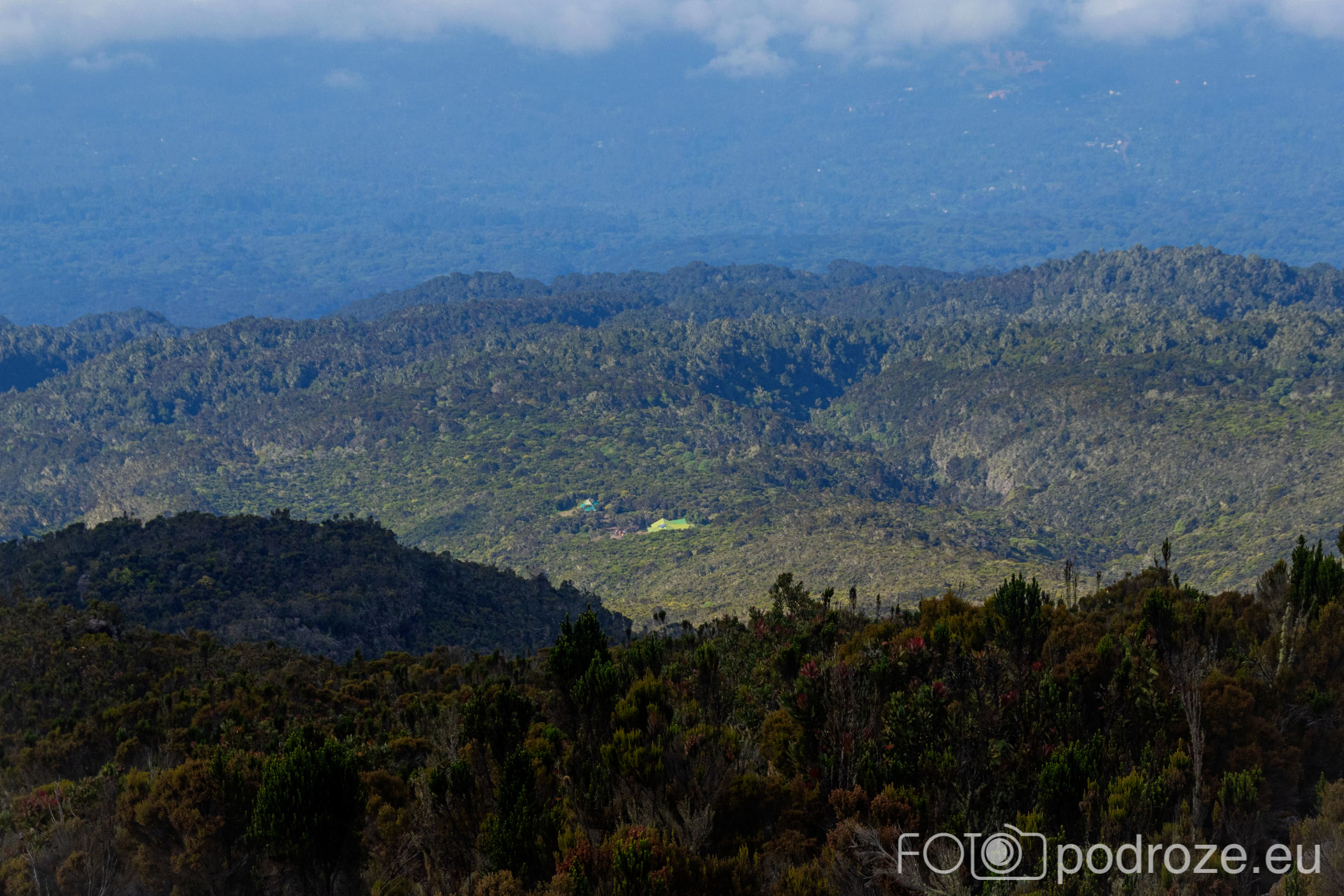 Po jakichś 2 godzinkach zejścia meldujemy się w campie pośrednim. Camp jest o tej porze opuszczony, ale wydaje się być bardzo przytulny, wokół mnóstwo wysokiej już roślinności, a miejsca na namioty poukrywane są między drzewami. Tu robimy dłuższą przerwę, posilamy się i pijemy, choć organizmy już nie mają takiej potrzeby jaka towarzyszyła nam cały czas w górę.