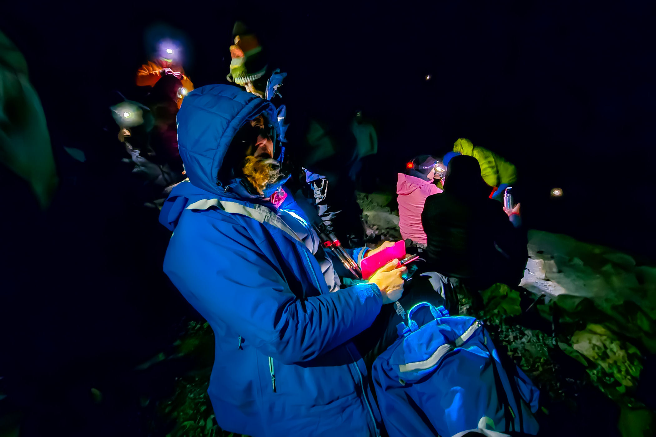 Chwilę po północy w końcu wszyscy dostali swoje napełnione termosy i wygramolili się z jadalni. Ubieramy na siebie co się da. Ja mam na sobie cienka bluzę, na to gruby polar, kurtka puchowa i jeszcze kurtka goreteks, do tego 2 pary rękawiczek, 2 pary skarpetek, 2 pary legginsów plus spodnie wiatrochronne, na głowie opaska i 2 kaptury. I wcale nie jest mi za ciepło. W rękach każdy obowiązkowo kije trekkingowe, a na głowie czołówka. Przez najbliższe 6 godzin będziemy szli w kompletnej ciemności.