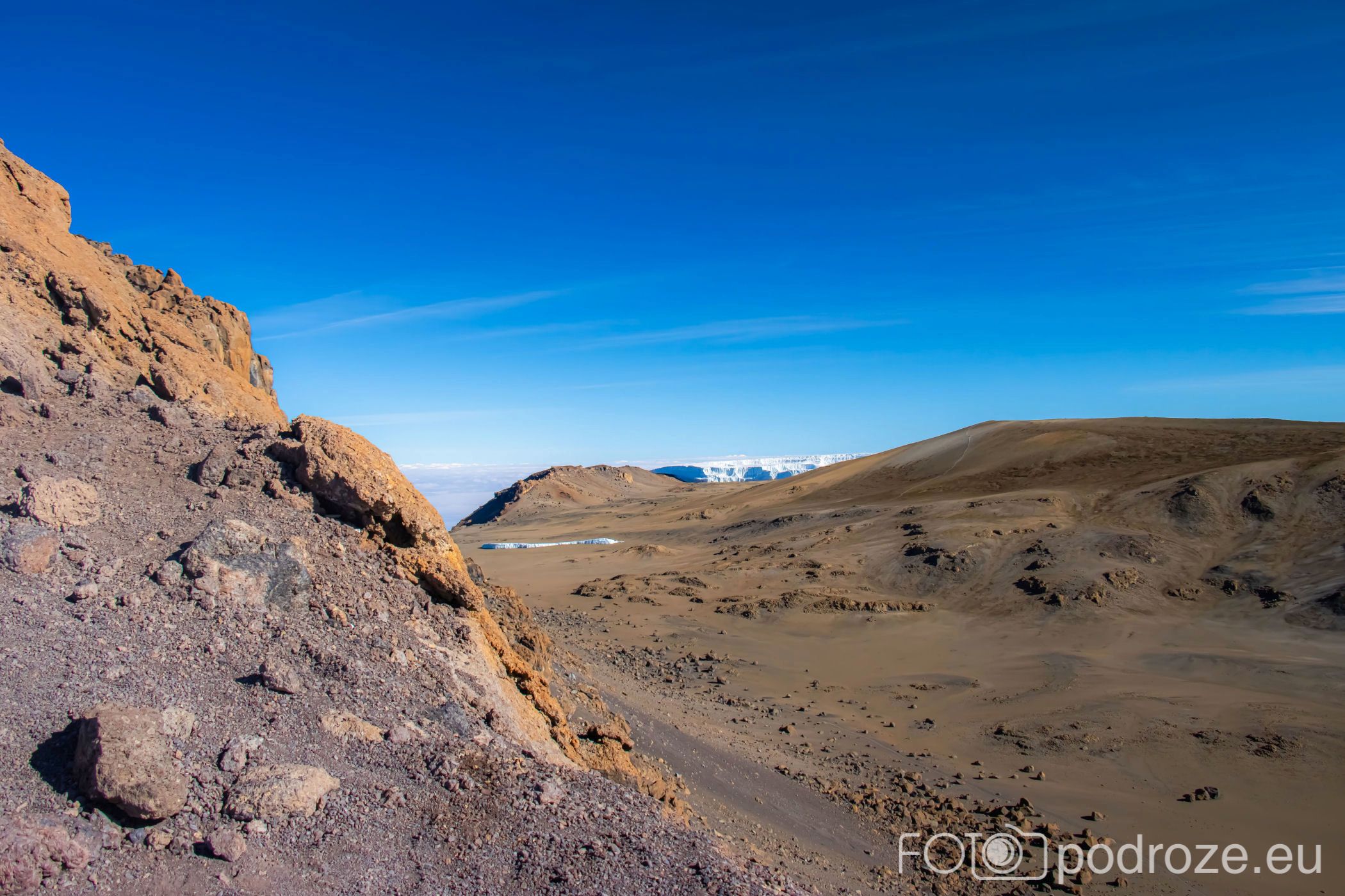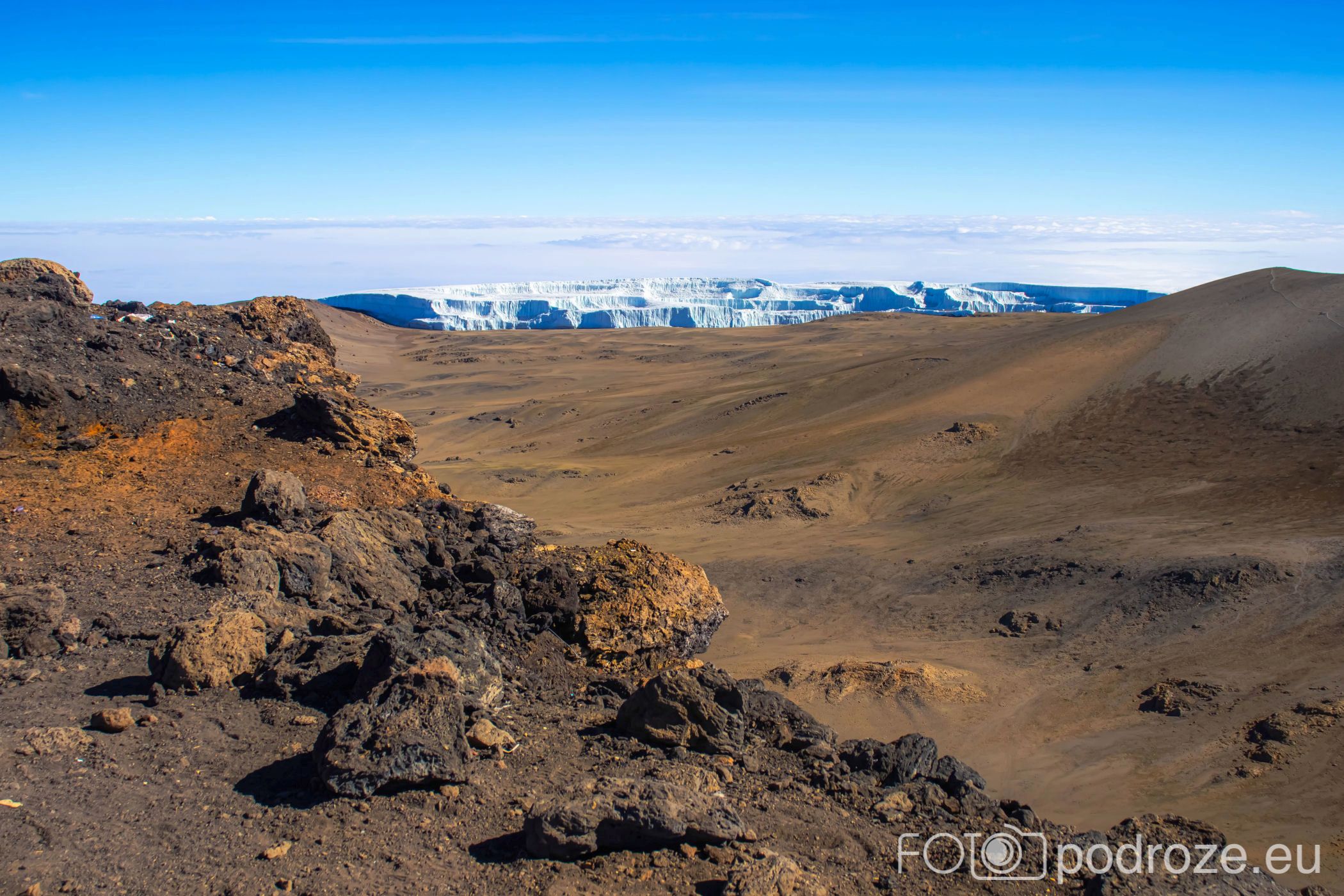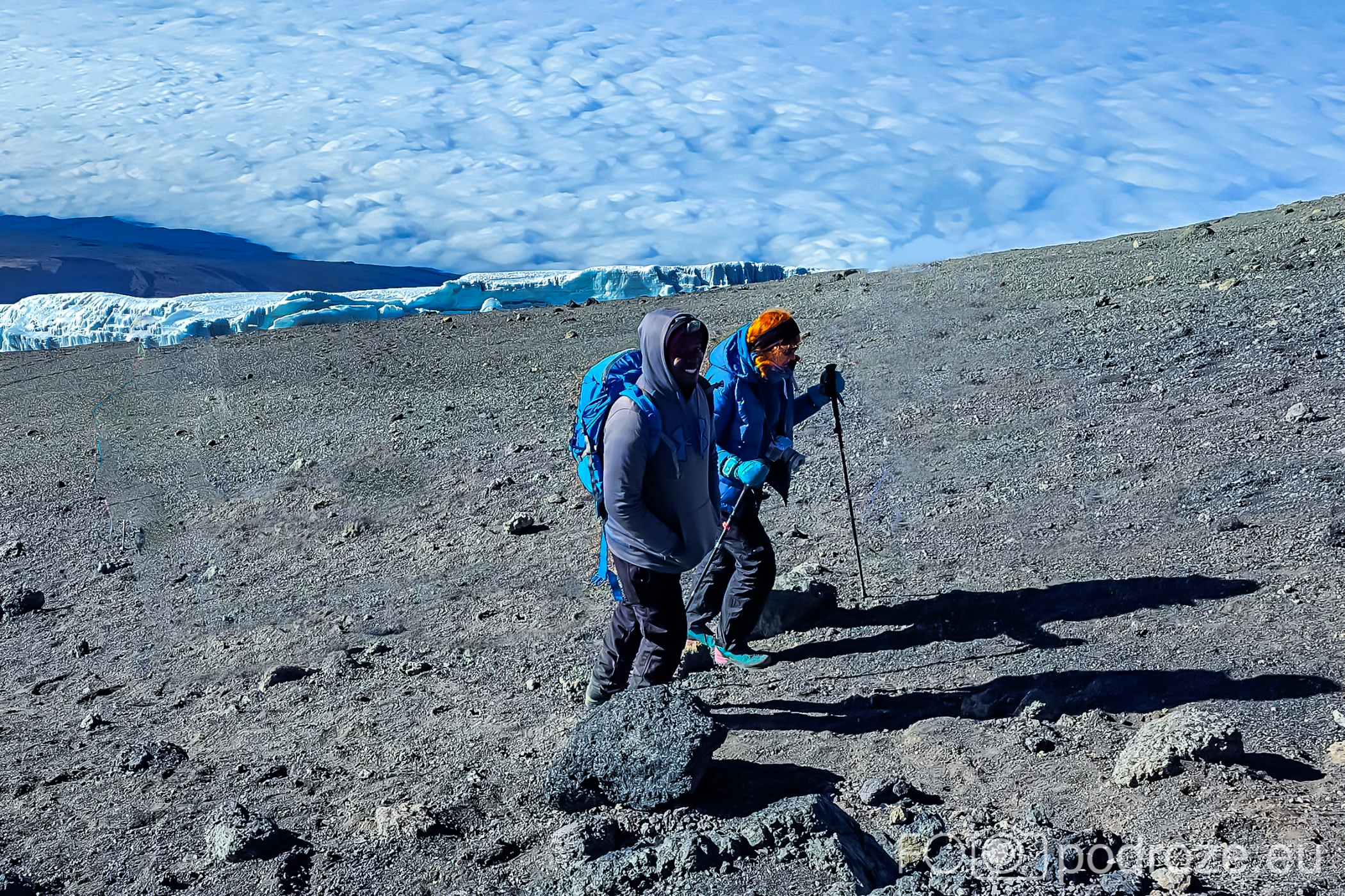 Jeśli spojrzymy do wnętrza krateru, nikt nie może mieć wątpliwości, że jesteśmy na wulkanie. To wulkan Kibo, którego Uhuru jest najwyższym szczytem znajdującym się od jego południowej strony. Od północnej strony krateru znajduje się kilka fragmentów lodowca. Z oddali wyglądają na maleńkie, z bliska pewnie robią wrażenie.