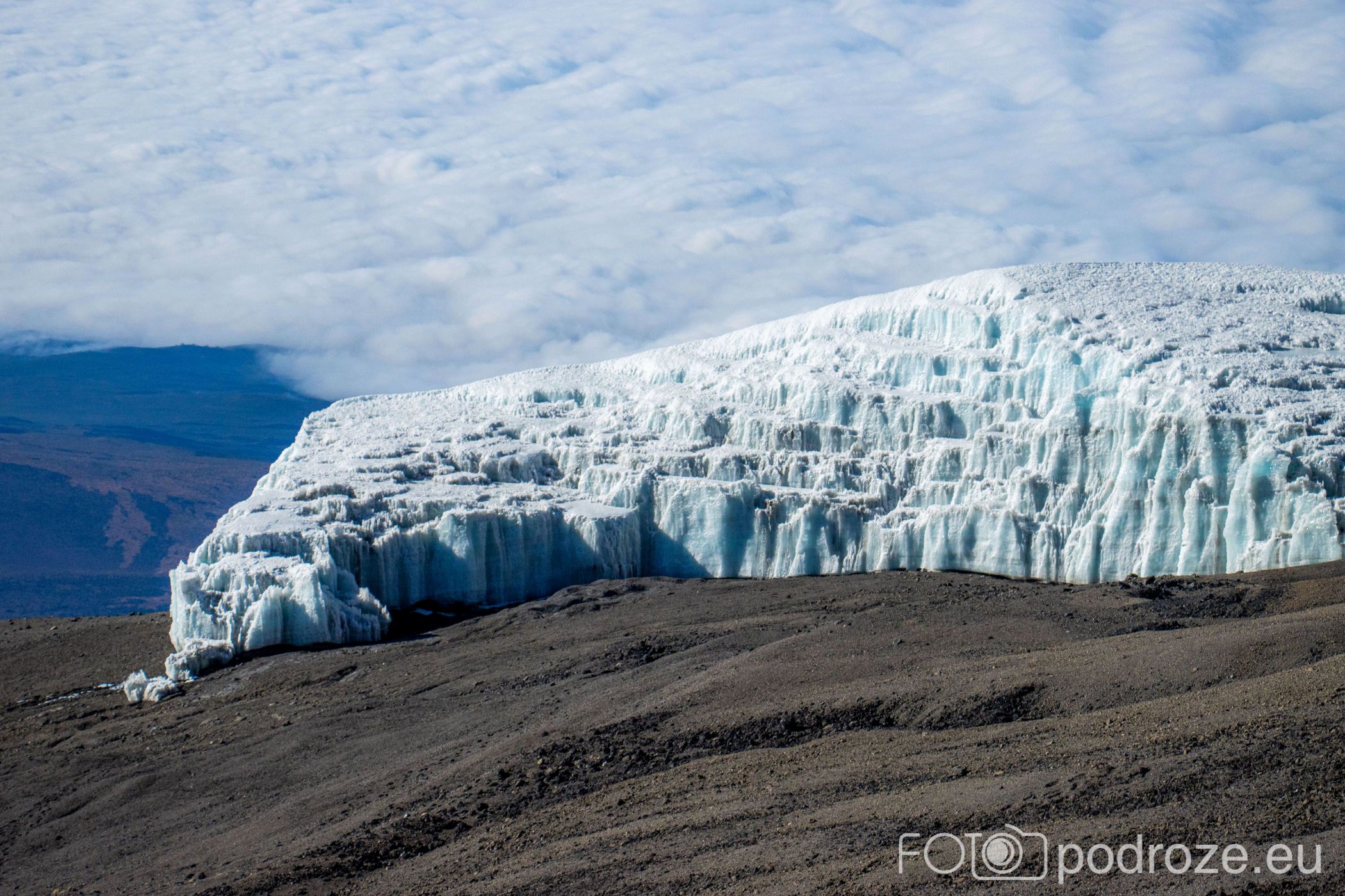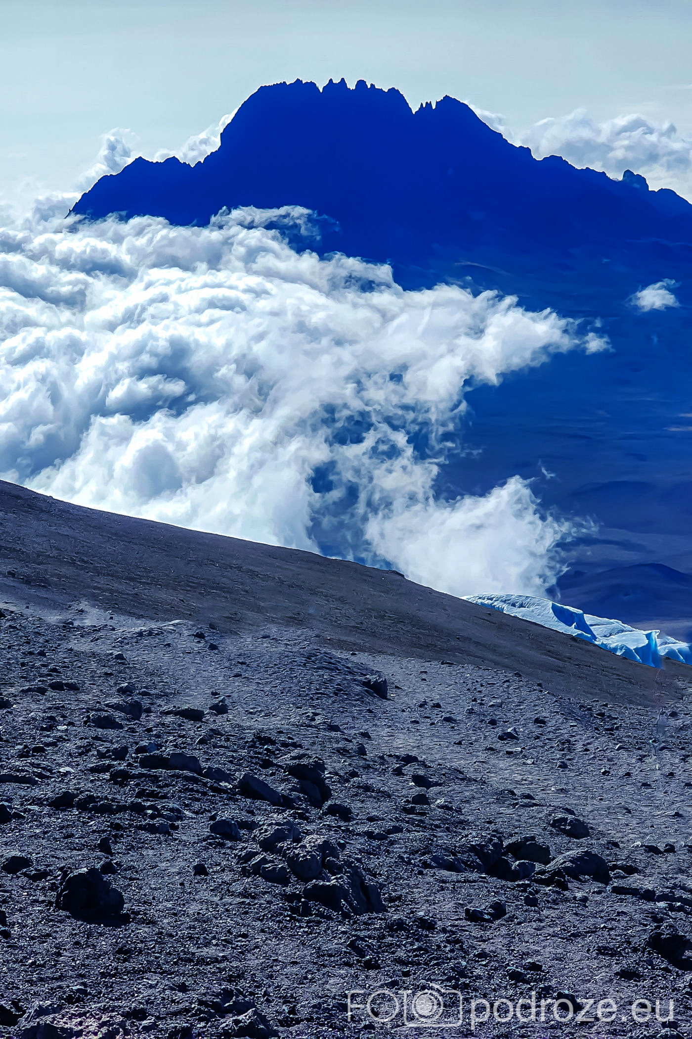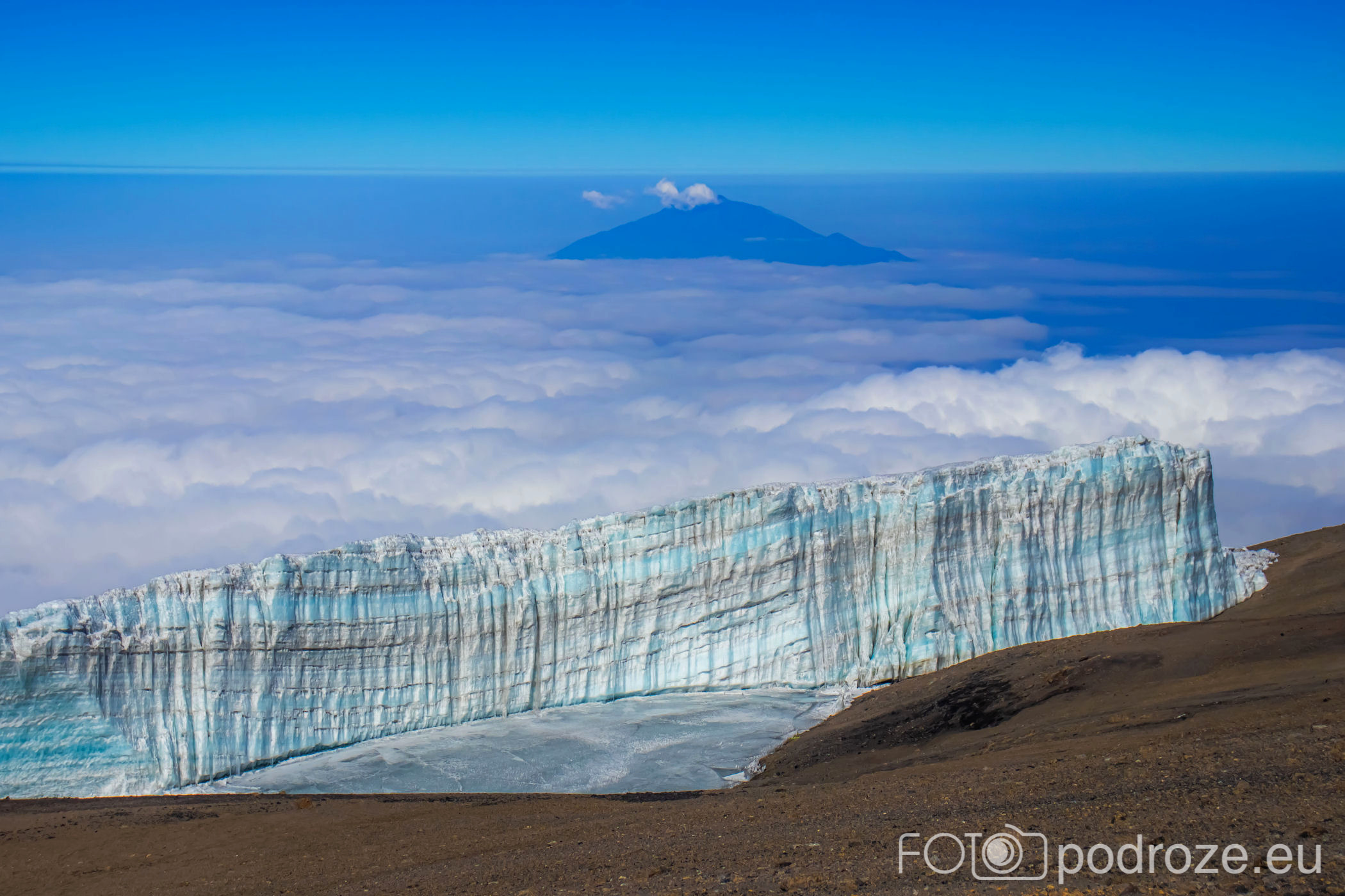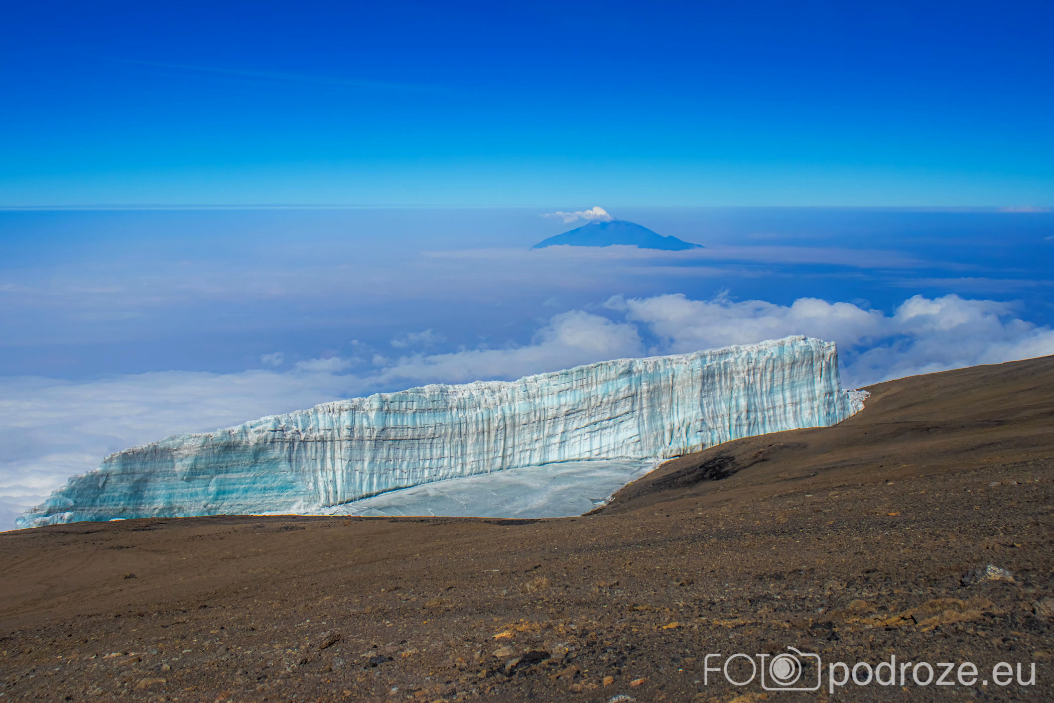 A za lodowcem, w oddali wyłania się z morza chmur bajeczna góra Meru – 4566 m n.p.m., czwarta co wielkości góra Afryki.