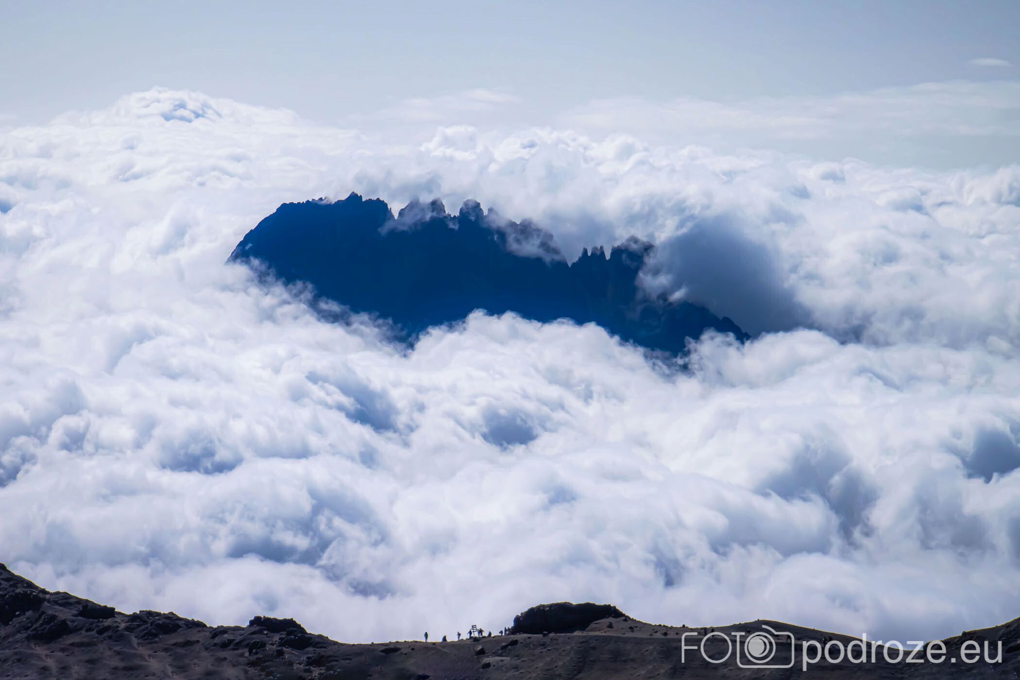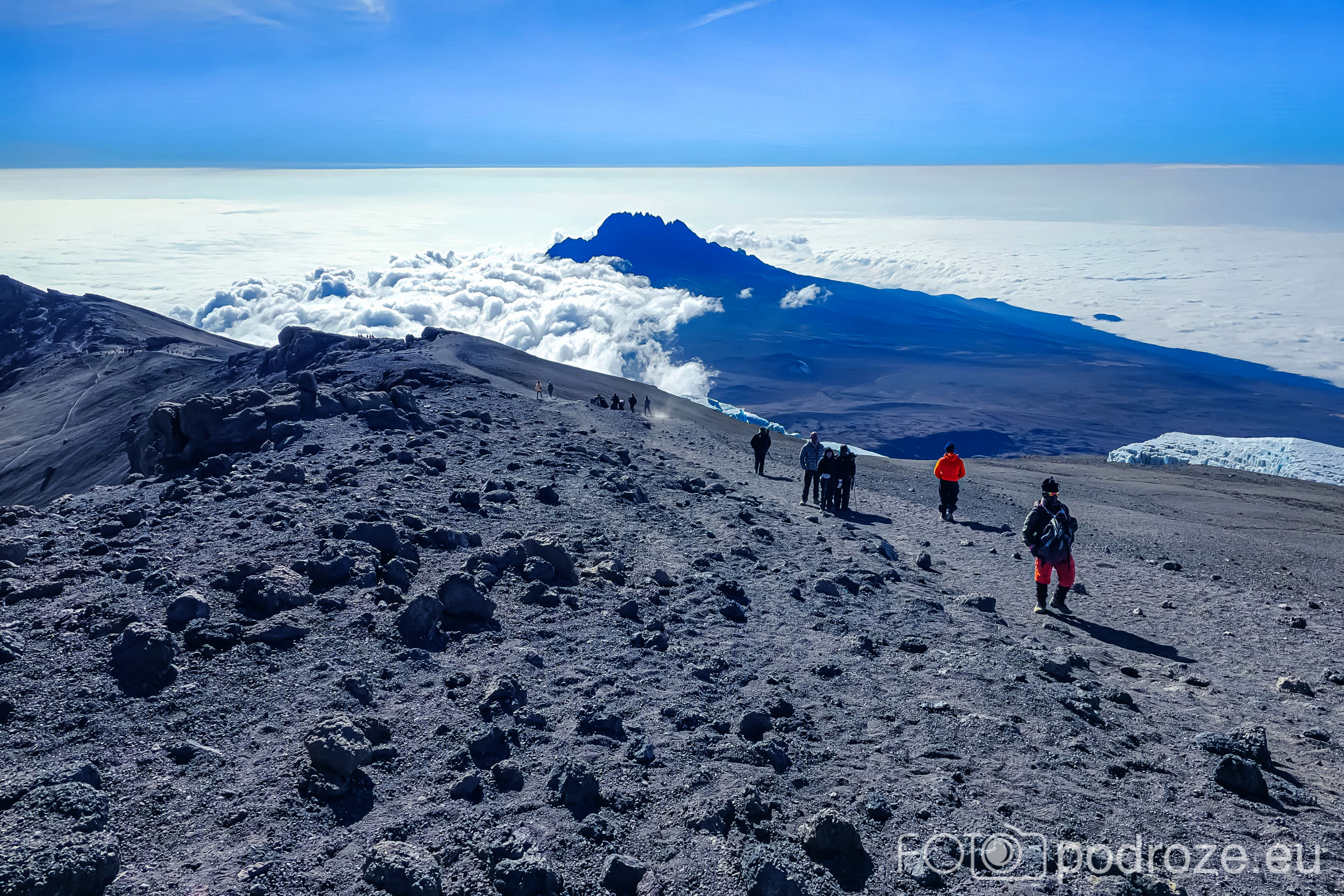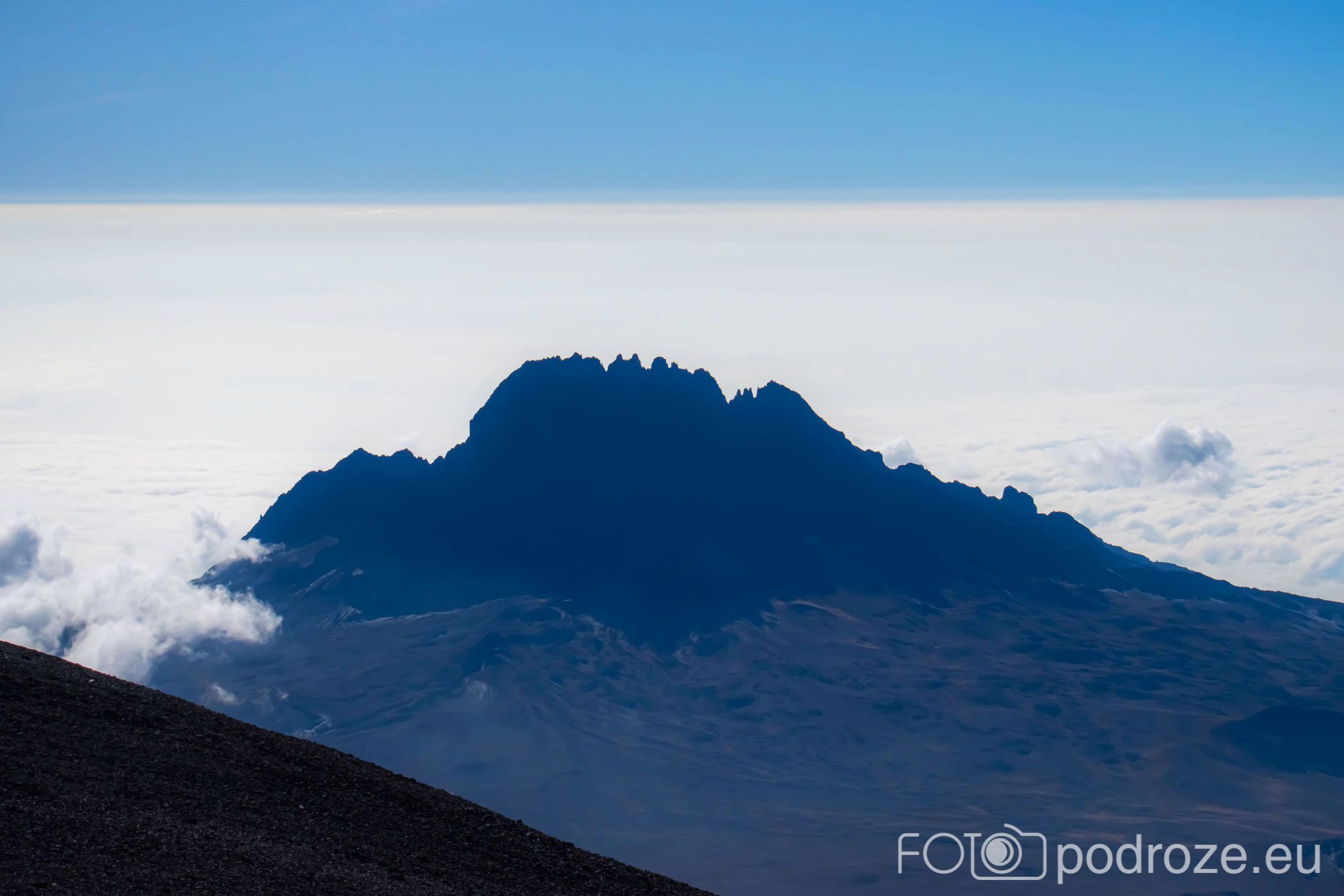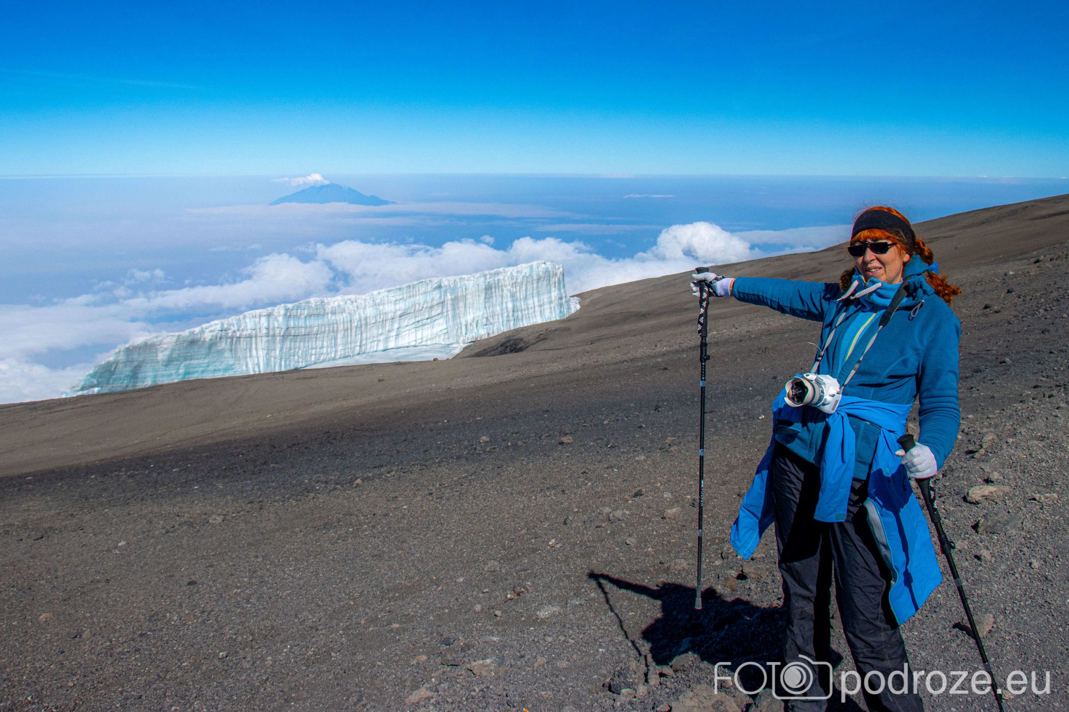 A za lodowcem, w oddali wyłania się z morza chmur bajeczna góra Meru – 4566 m n.p.m., czwarta co wielkości góra Afryki.