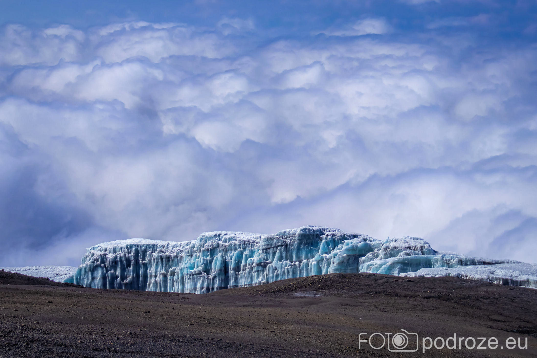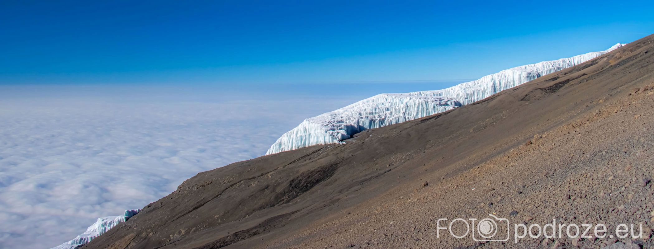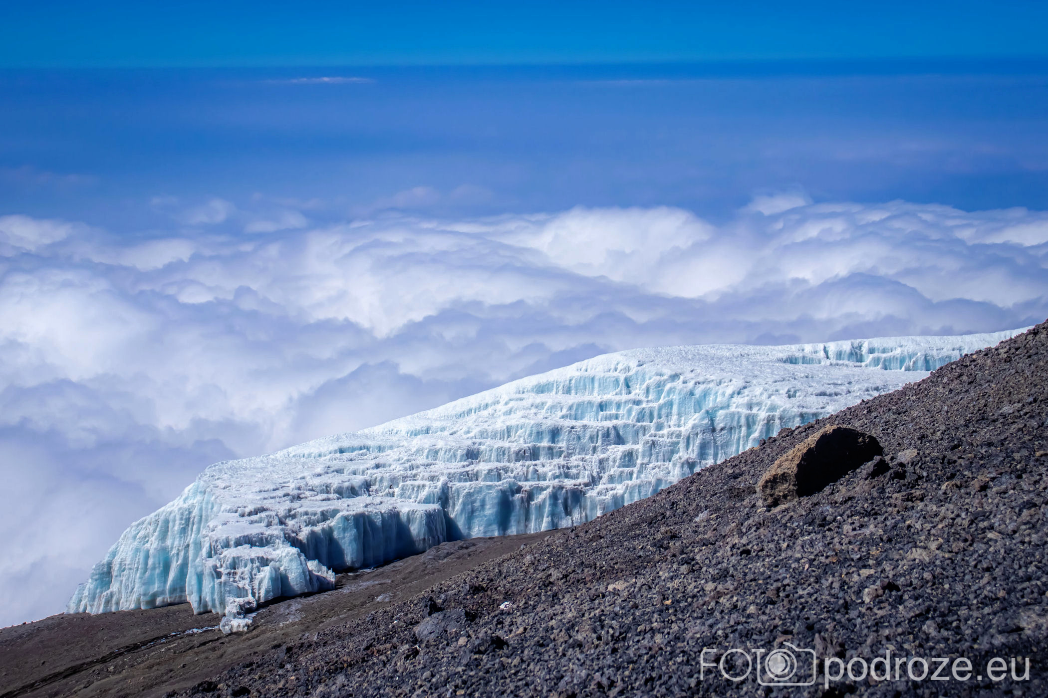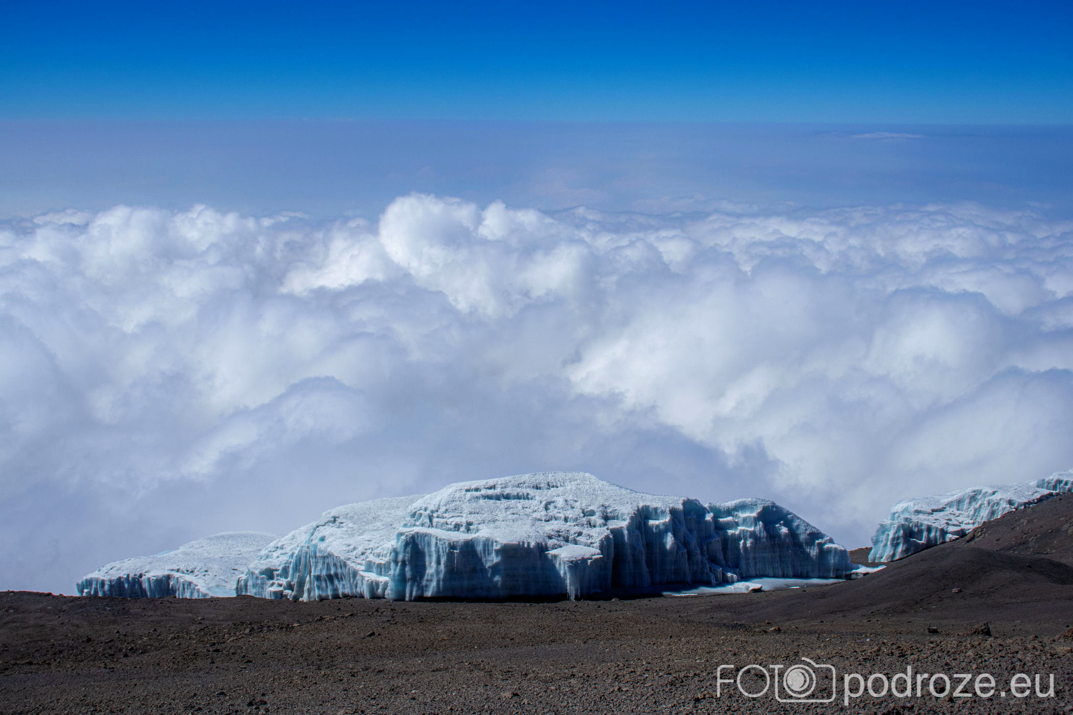 A za lodowcem, w oddali wyłania się z morza chmur bajeczna góra Meru – 4566 m n.p.m., czwarta co wielkości góra Afryki.