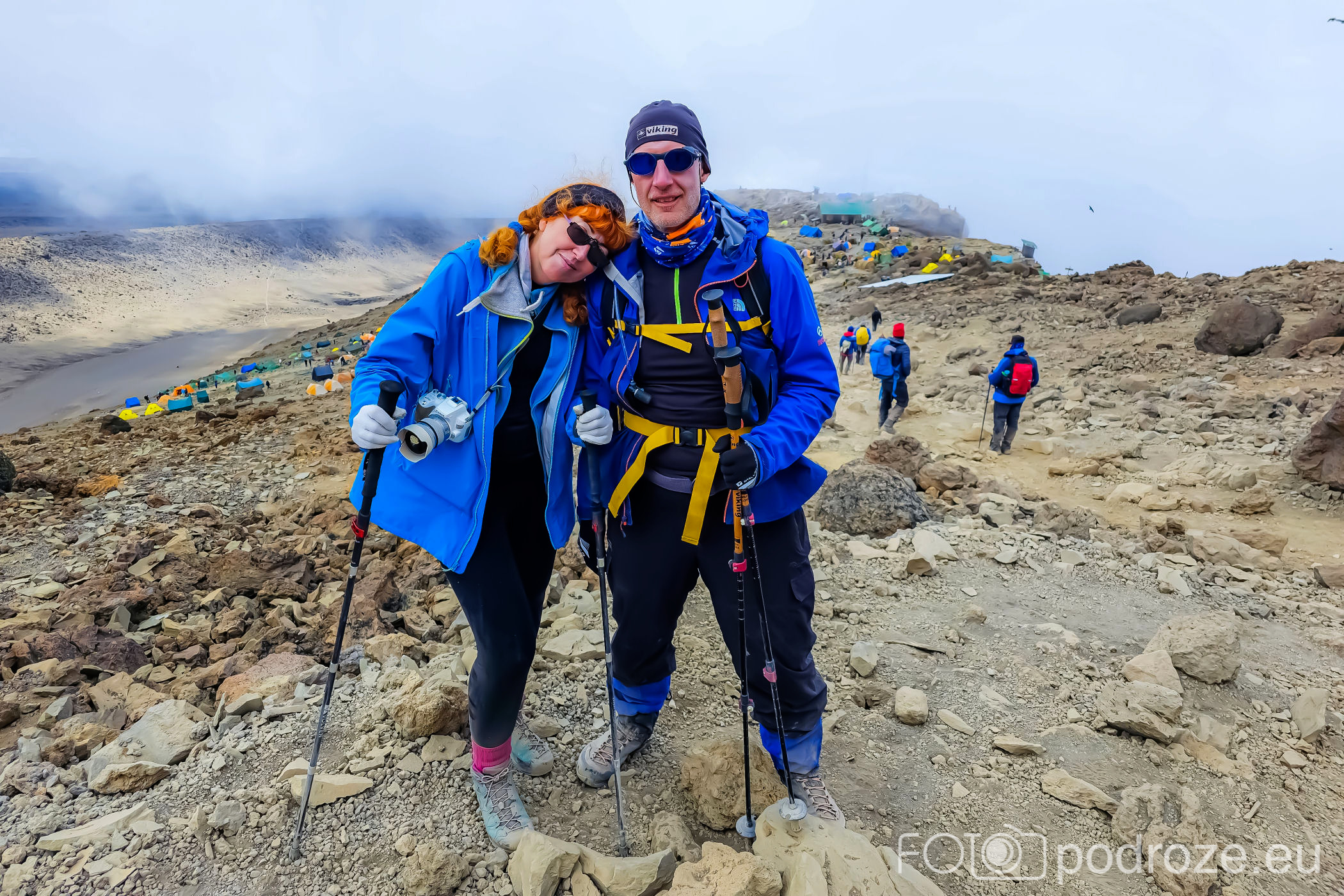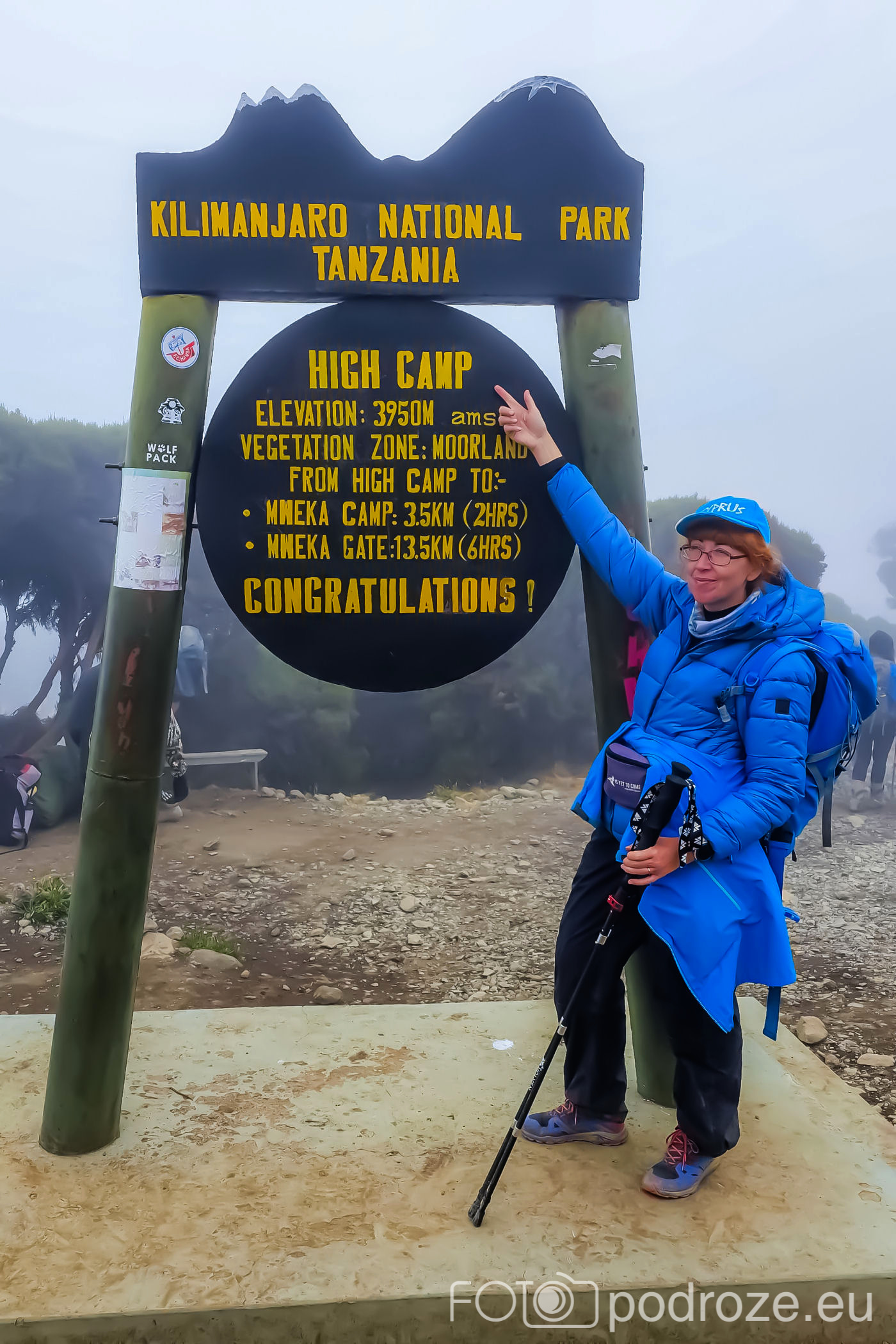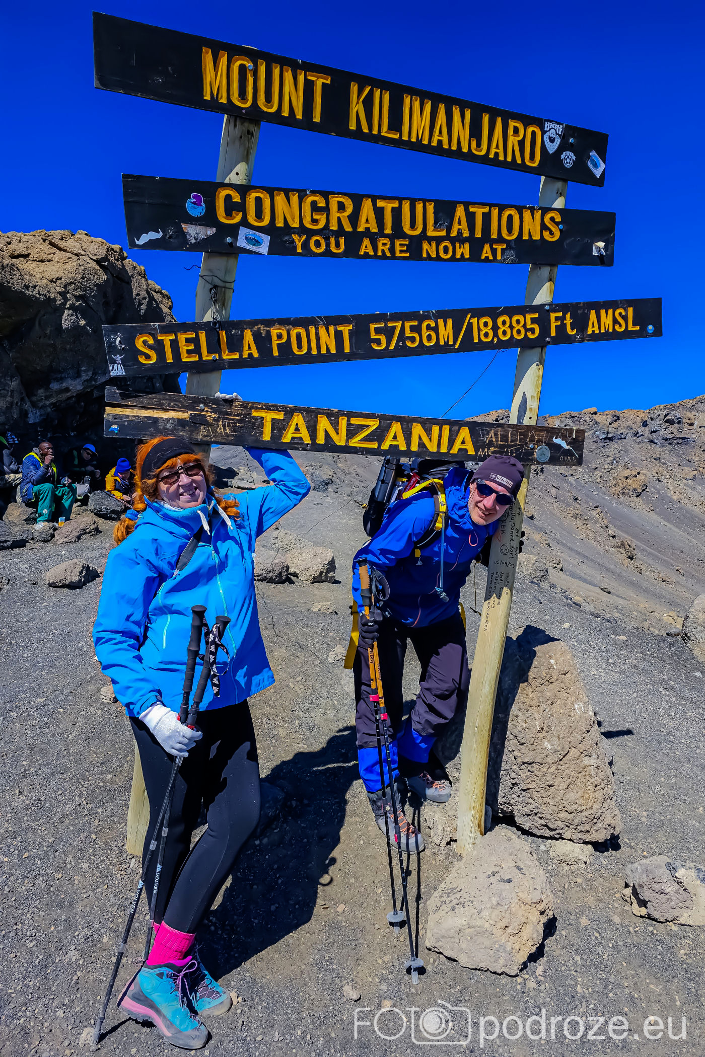 Po zaledwie 6 godzinach jesteśmy w kraterze całą grupą. Stella Point jest już miejscem, które uznaje się jako zdobycie Kilimandżaro. Jestem tak wykończona, że nie widzę się w dalszej wędrówce. Jestem nawet zdecydowana zawracać. Myślę tylko o jednym, udokumentować, że tu doszłam i pędzić w dół. Prosimy osoby obok o zrobienie nam zdjęcia pod tablicą. Wszyscy siedzą zieloni i nie są w stanie się ruszyć. Mąż lituje się więc i robi mi zdjęcie, a ja jemu. Dopiero w drodze powrotnej udaje się zrobić to wspólne zdjęcie.