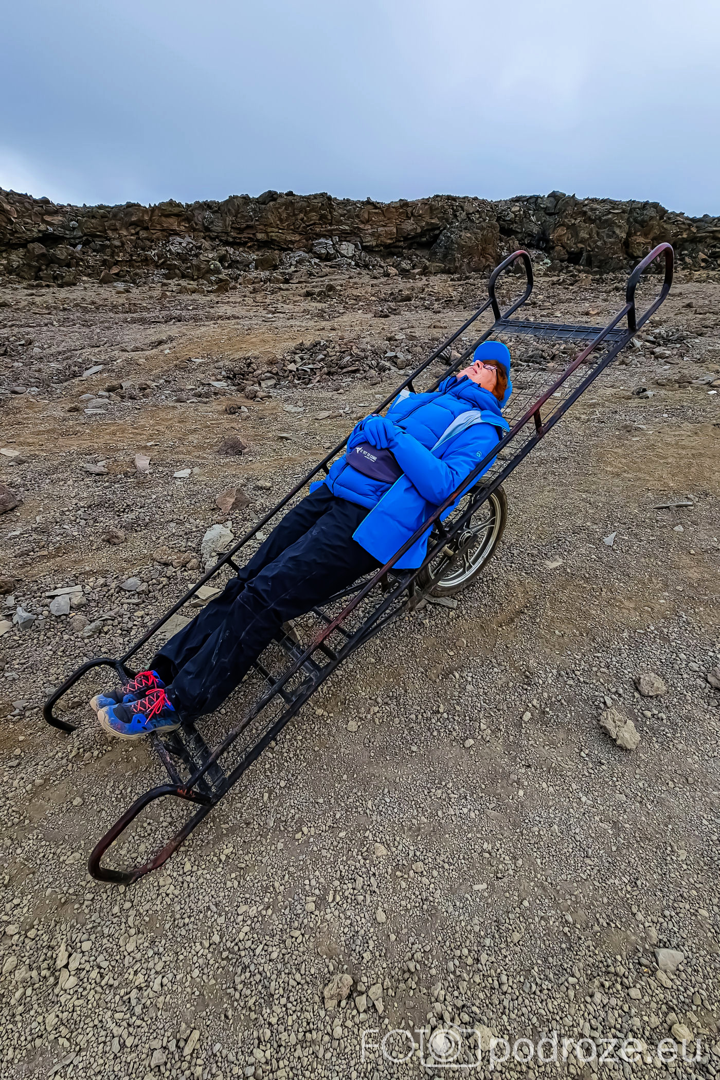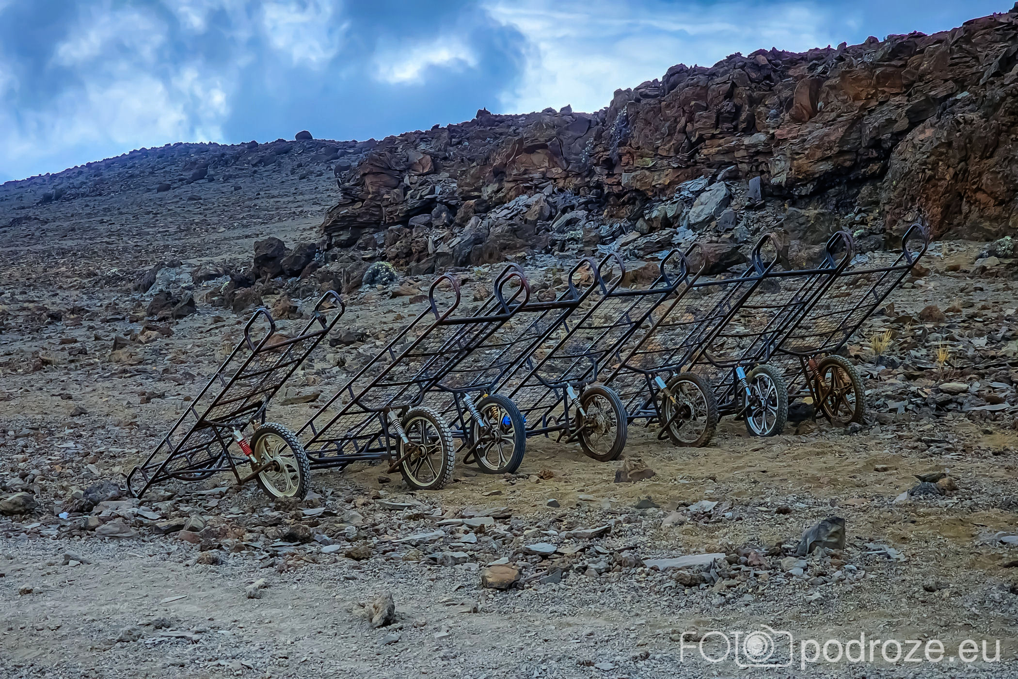Ten odcinek na szczęście nie jest bardzo stromy, ale idziemy już w chmurach więc widokowo nie jest zbyt ciekawie. Mijamy w pewnym momencie dziwne taczki. To wózki ratunkowe jakim zwozi się stąd chorych, połamanych, lub niestety też i martwych. Oj, nie chciałabym tak skończyć. Bogu dzięki, ze nikomu nic się nie stało i wszyscy dotarli cali i zdrowi.