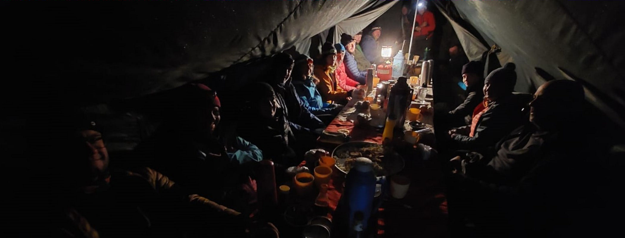 23.00 stawiamy się w jadalni zwarci i gotowi, ubrani na cebulkę, czyli prawie we wszystko co mamy ze sobą. Jest okropnie zimno, temperatura -10 stopni, ale noc jest na szczęście bezwietrzna, gorzej więc może już nie będzie. W jadalni czeka na nas ciepła woda na herbatkę lub kawkę, popcorn i ciasteczka. Ładujemy więc baterie i dajemy naszej ekipie tanzańskiej termosy, aby mieć na drogę też coś ciepłego.