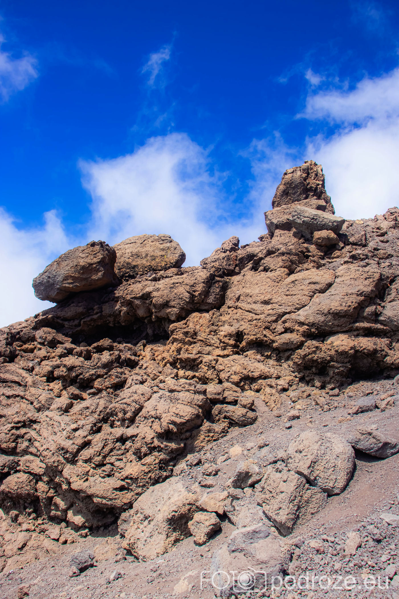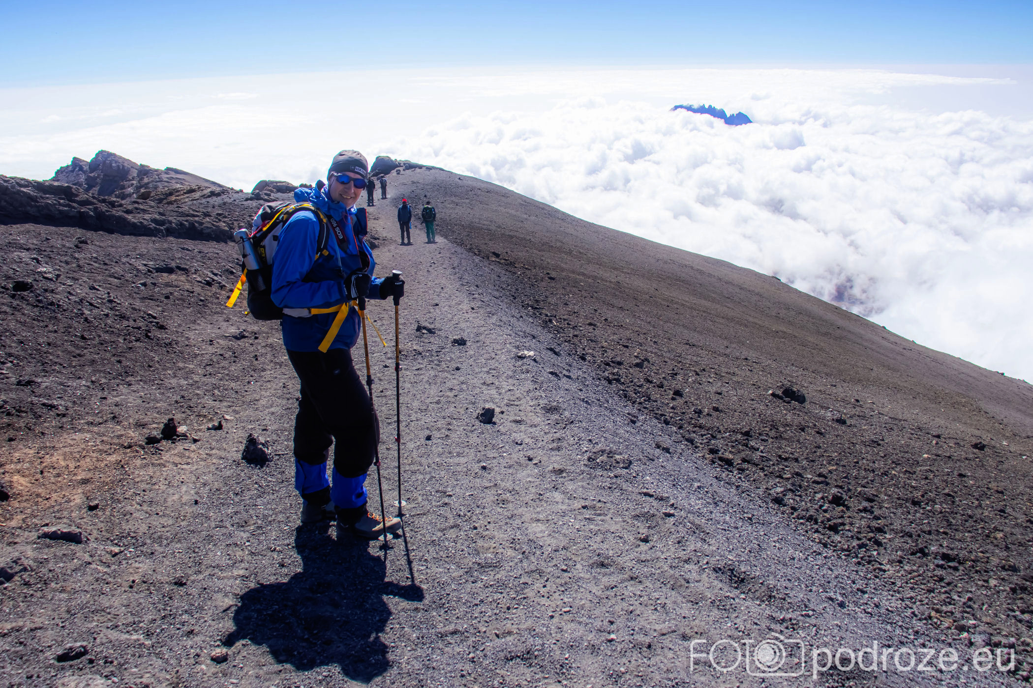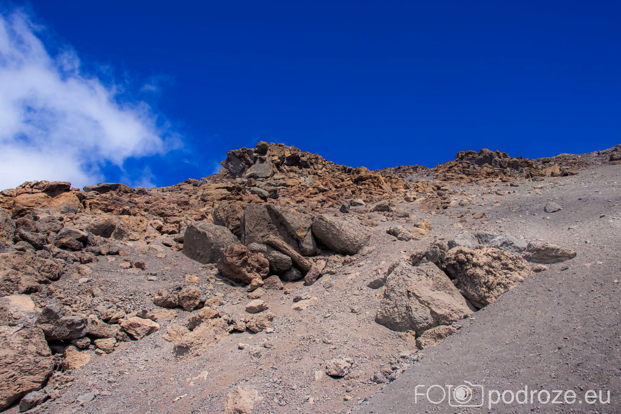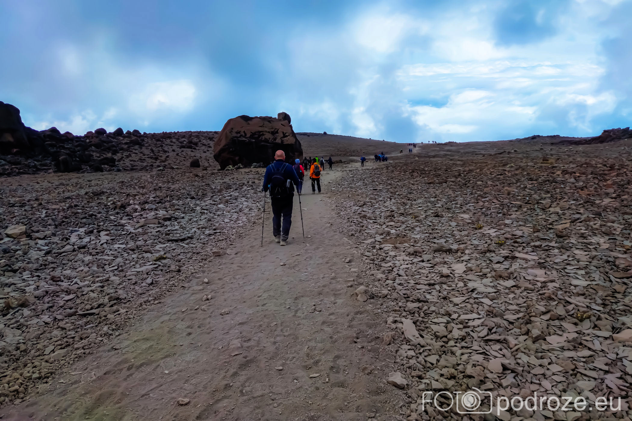 Jeszcze pamiątkowe zdjęcia i przedostatni odcinek drogi przed nami. zdecydowanie ten najmniej przyjemny. Do góry szliśmy wolno i bokiem, przy skałach. Teraz schodzi się po zwałowisku żwiru wulkanicznego. Wokół każdego unosi się dosłownie chmura pyłu. Staram się więc trzymać jak najdalej od wszystkich, żeby nie zapylić płuc całkowicie. I tak wszyscy wyglądamy po zejściu jednokolorowo – szaro – buro. Teraz świcie piękne słońce, jest siła i energia, można więc sfotografować to czego nie dało się idąc do góry.