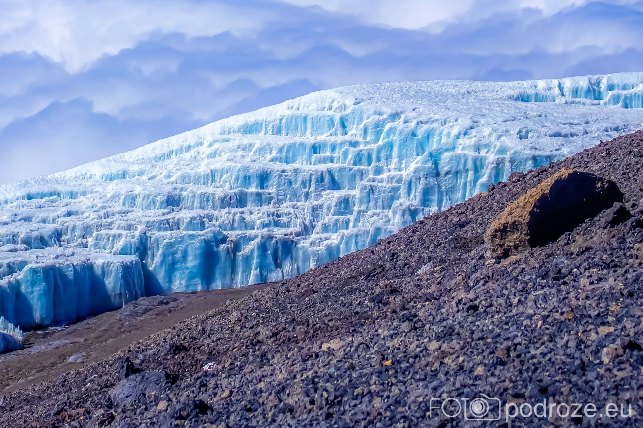 Idąc w dół możemy przyjrzeć się lodowcowi od południowej strony. Nie jest też zbyt imponujący, ale kolory bajeczne. Jeśli do tego dołożymy morze chmur w tle, to mamy przepis na bajeczne zdjęcia.