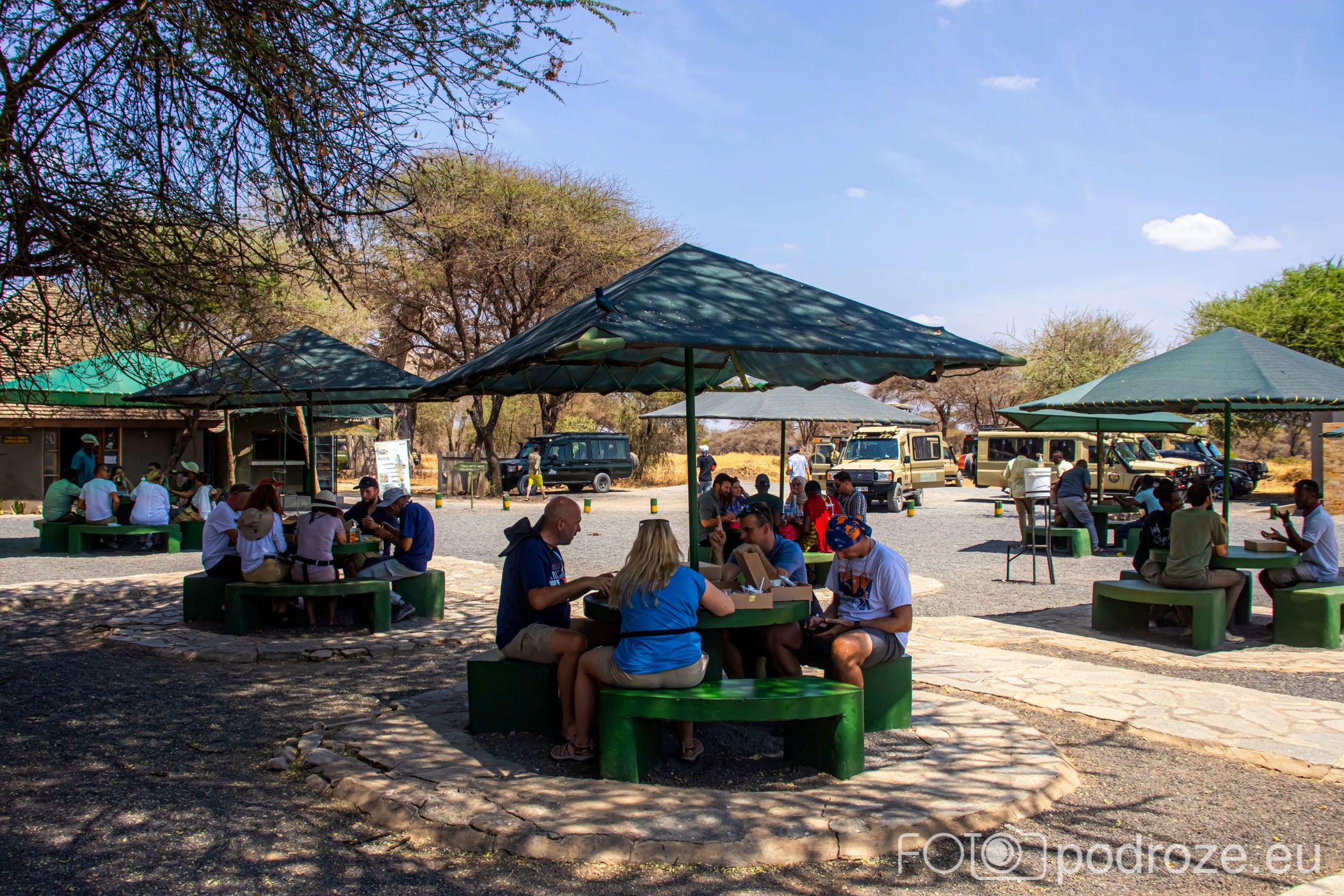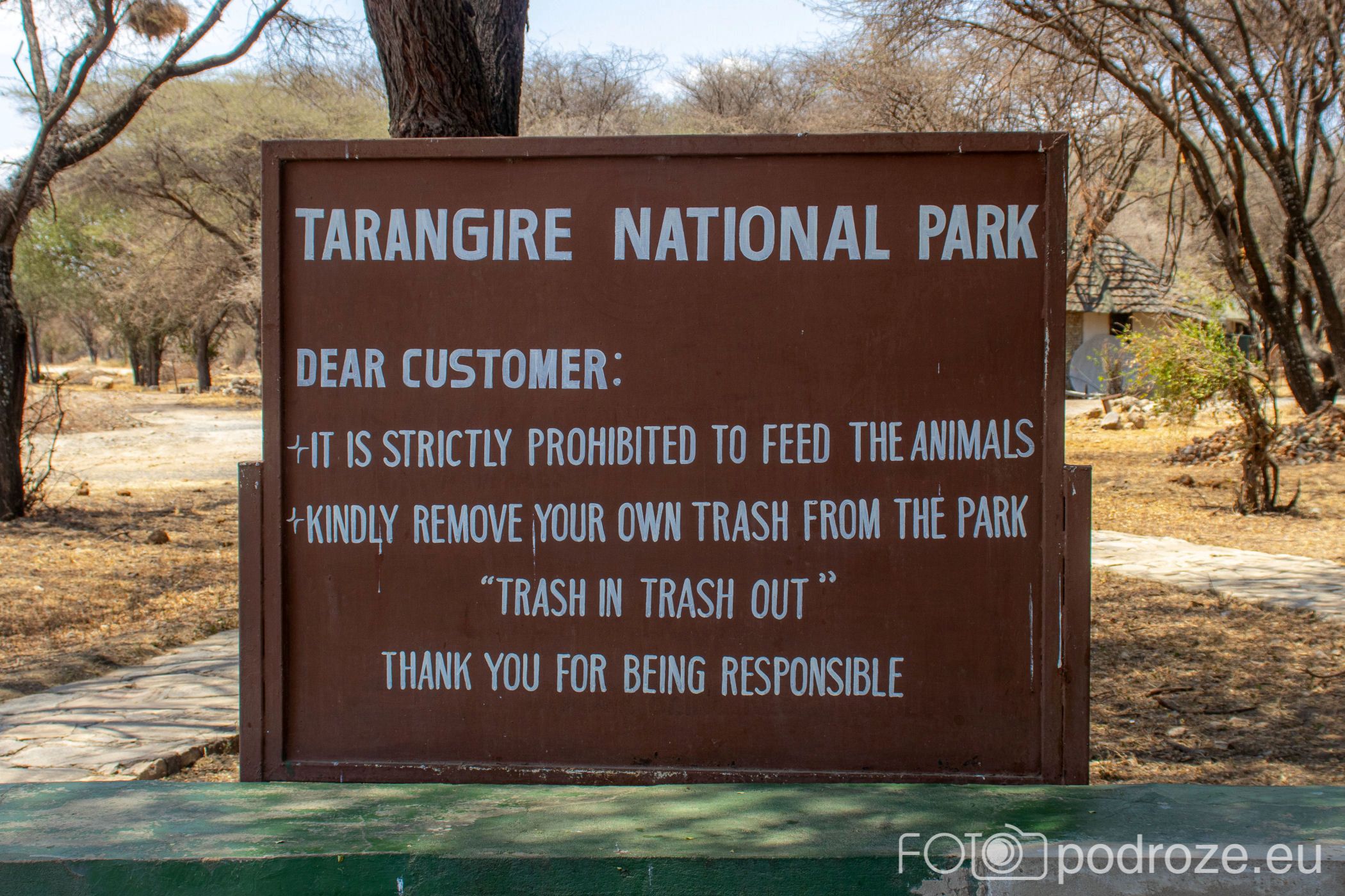 Przy bramie wjazdowej do Tarangire znajduje się budynek z biurami, informacją turystyczną oraz sklepiki. Przy parkingu znajduje się stosik ułożony z czaszek antylop, słoni i bawołów. W strefie wejściowej ułożone są stoły na których mamy możliwość w towarzystwie dziesiątek ptaków spożyć lunch. Od tego zresztą zaczynamy naszą przygodę.