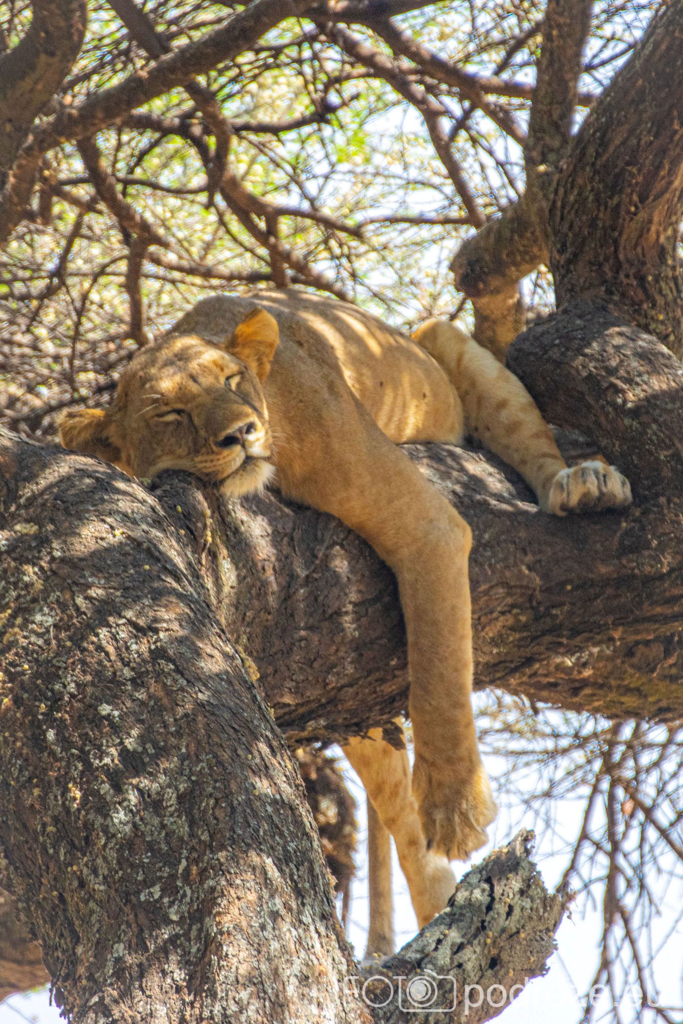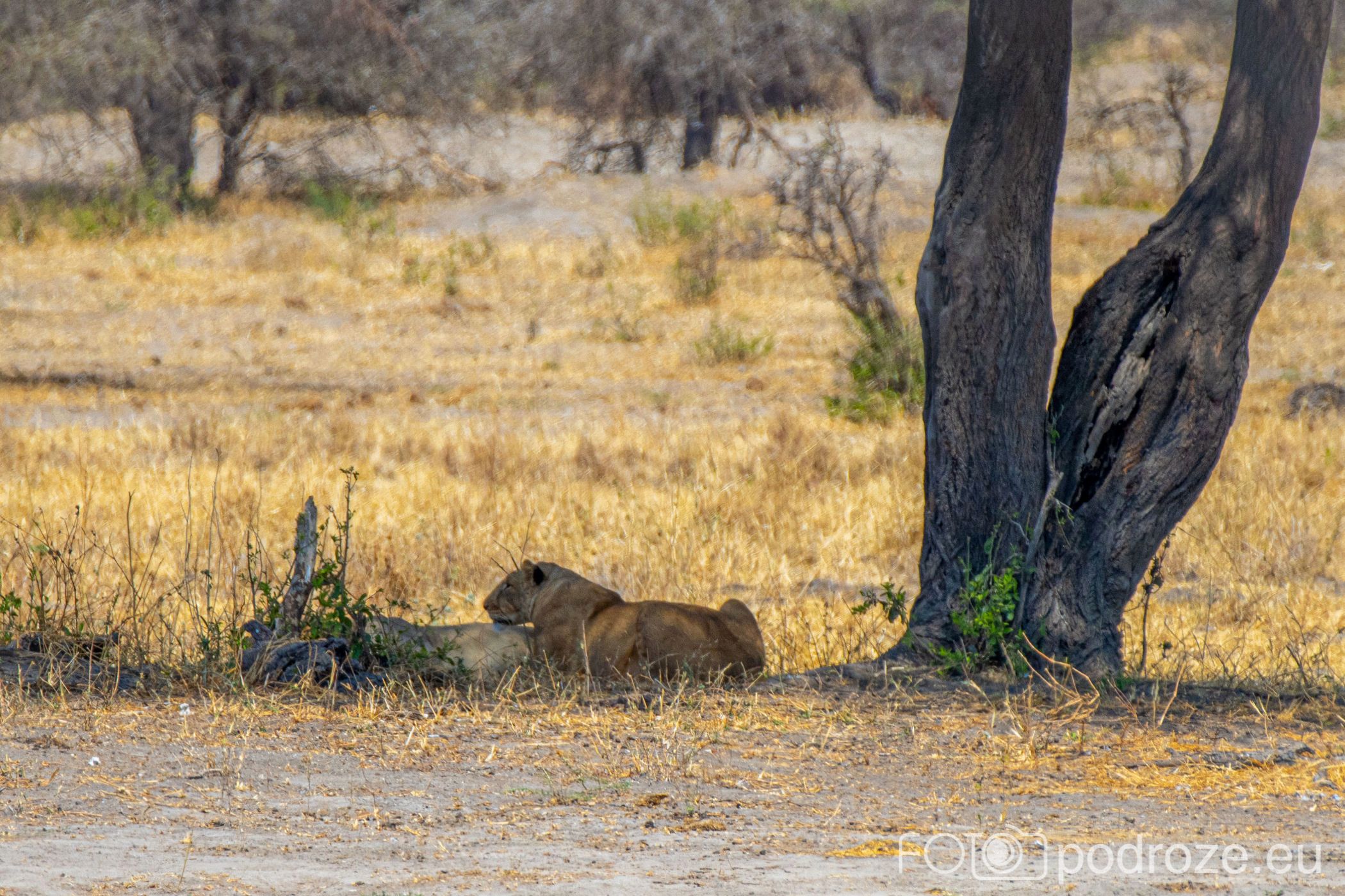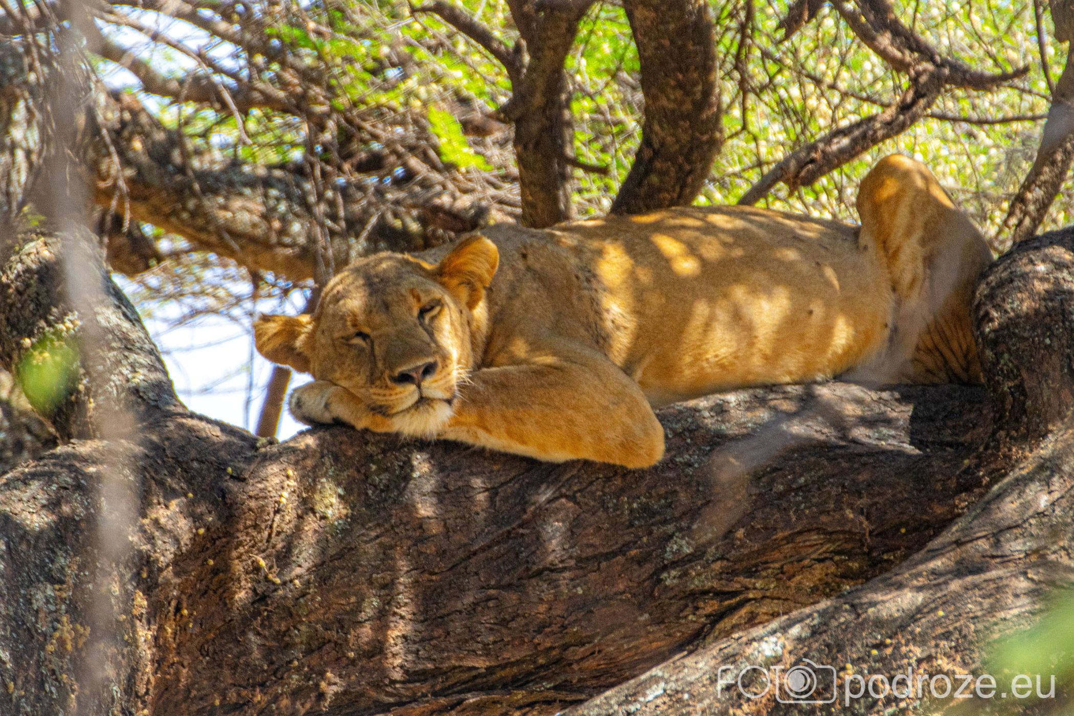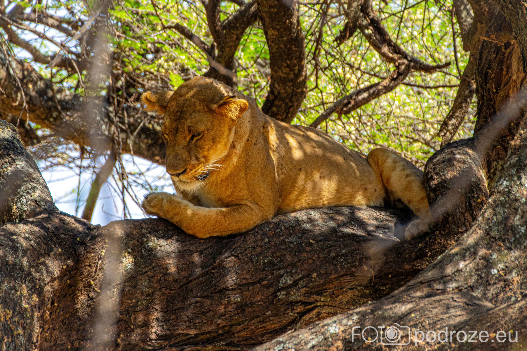 Drapieżniki są, dosłownie kilkadziesiąt metrów dalej, ale jedyne co je właśnie interesuje to spokojna, niczym nie zmącona drzemka. Kiedy więc podjeżdżamy blisko pod drzewo na którym wyleguje się jedna lwica, ta na moment otwiera oczy, aby po chwili zmienić pozycje na wygodniejsza i spać dalej.