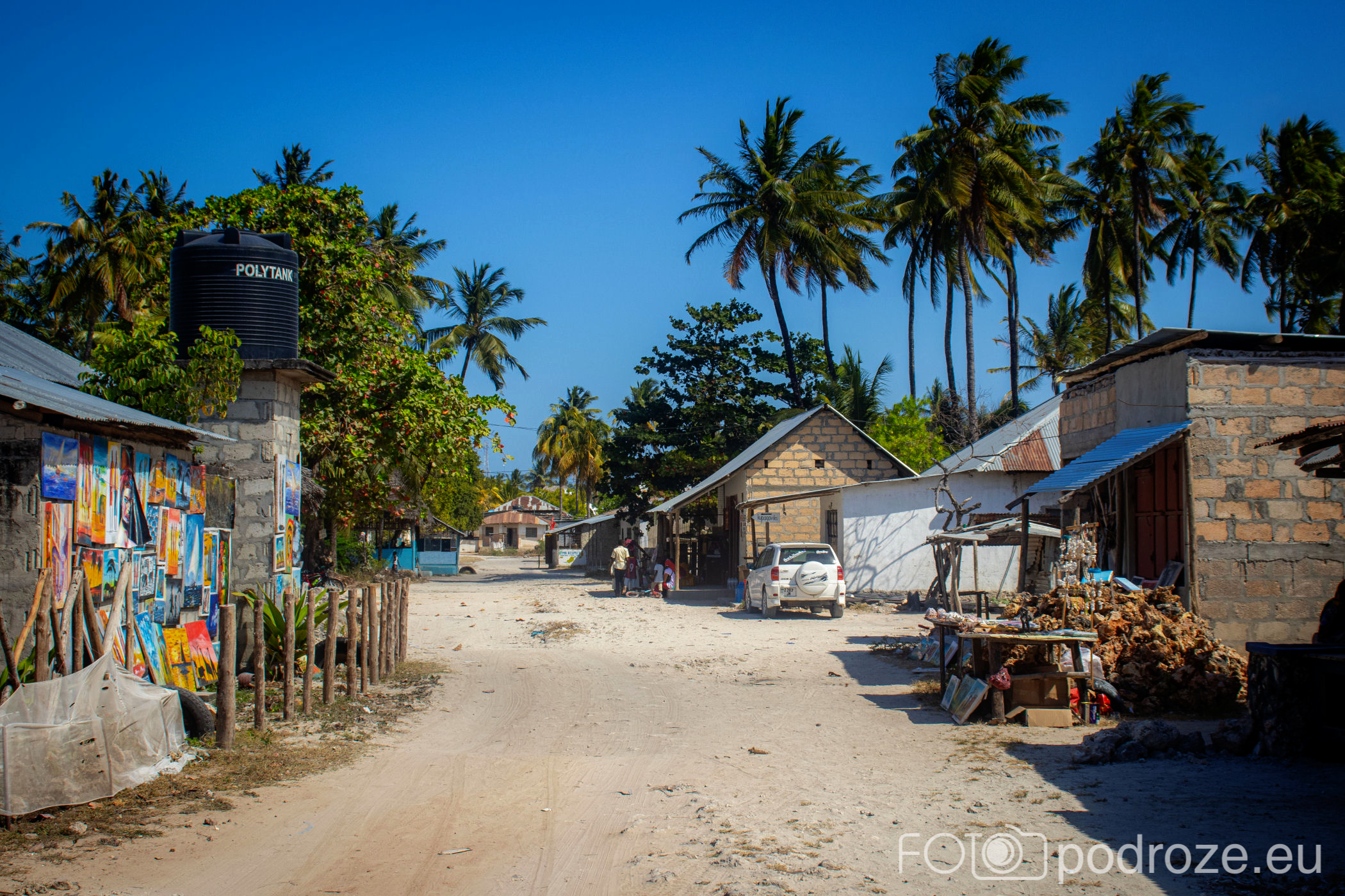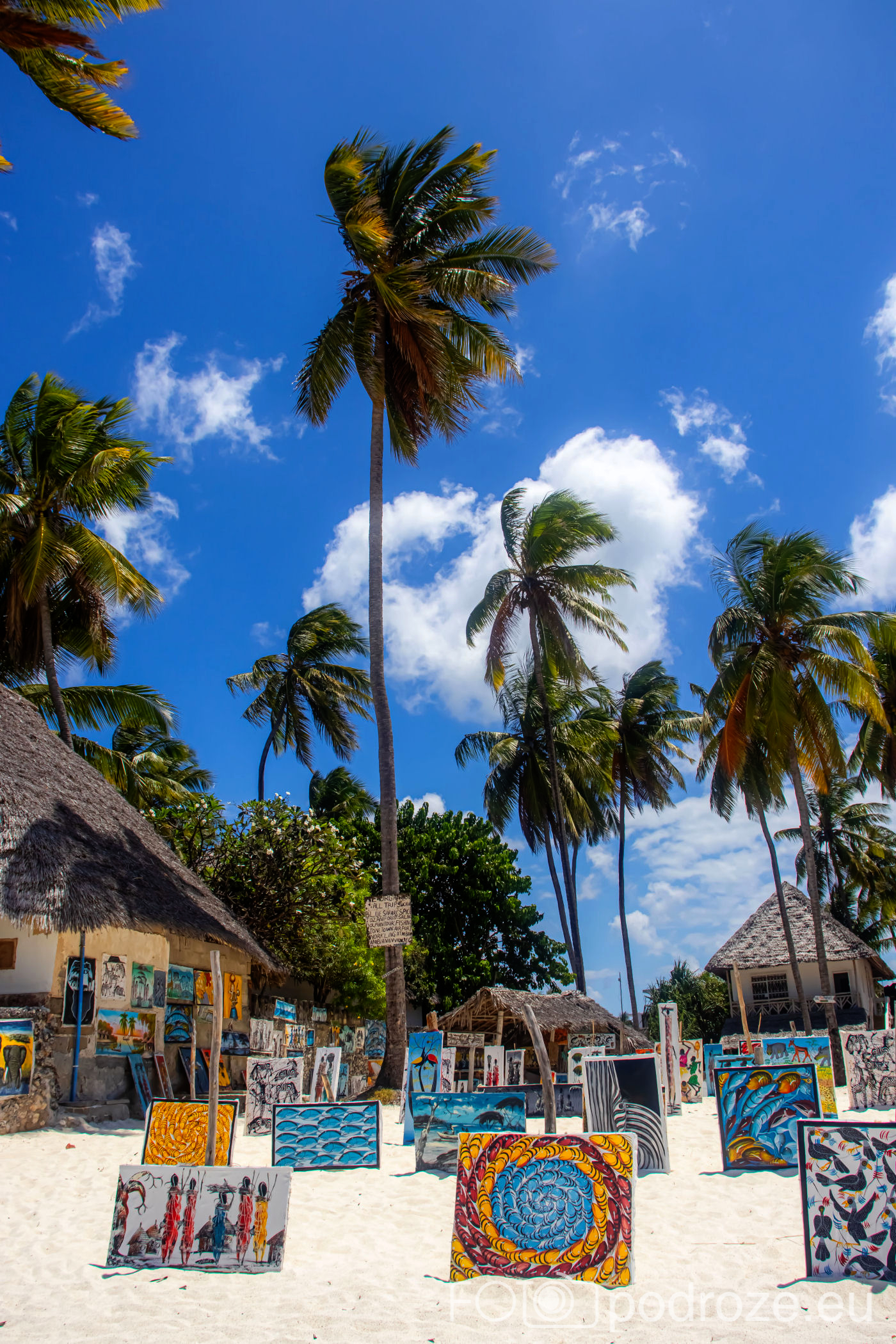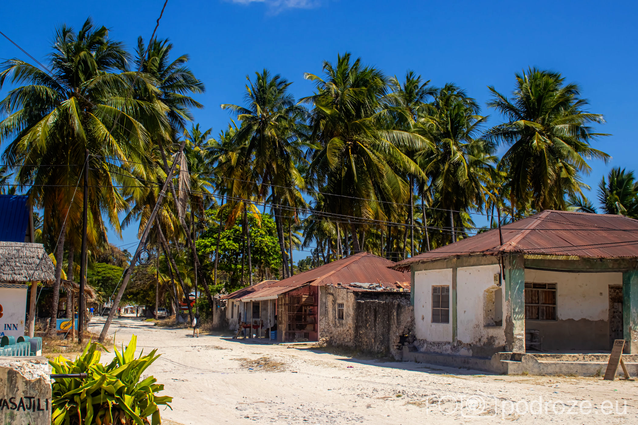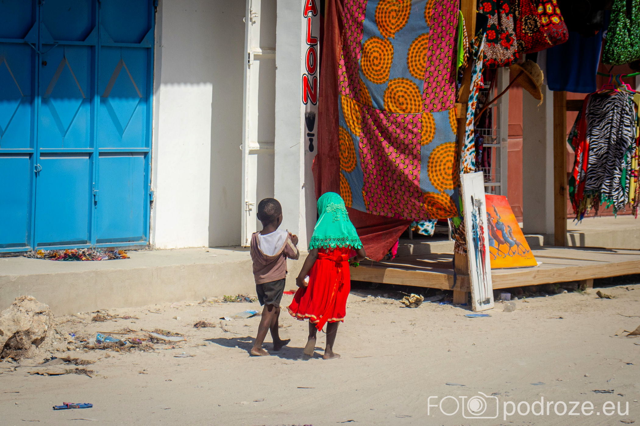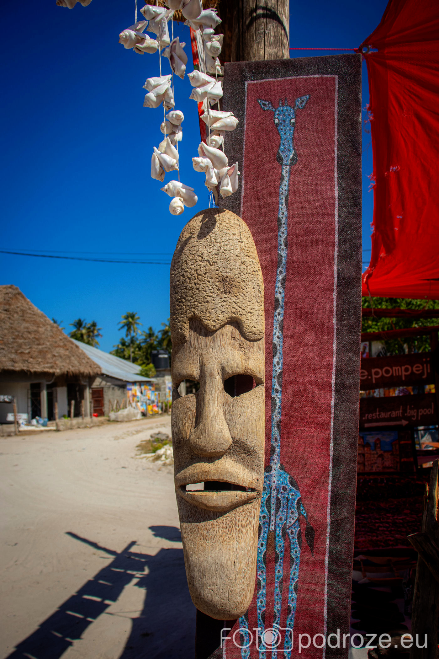 Jak już na początku wpisu wspomniałam, Jambiani to takie prawdziwe, autentyczne miejsce na mapie Zanzibaru. W pierwszym momencie miejsce szokuje. Pierwsza linia brzegowa jest urokliwa i zadbana, ale wystarczy przejść już na drugą stronę hotelików, czy knajpek, żeby znaleźć się w innym, realnym afrykańskim świecie. Bita droga pokryta piachem prowadzi nas przez miasteczko. Domy częściowo w ruinie, częściowo niby skończone wyglądają na tymczasowe, ale takie nie są. Co kilkadziesiąt kroków jakiś sklepik, albo raczej stragan z pamiątkami lub owocami. Gdzieniegdzie galeria sztuki, która w całej Tanzanii jest dosłownie wszechobecna. Mijamy szkołę, akurat uczniowie obu płci kończą naukę i rozbiegają się po miasteczku. „Pole pole” (wolno-wolno) i „Hakuna matata” (nie martw się) oddają w pełni atmosferę tego miejsca. Bieda, ale równocześnie uśmiech na twarzach. Tak się tu żyje.