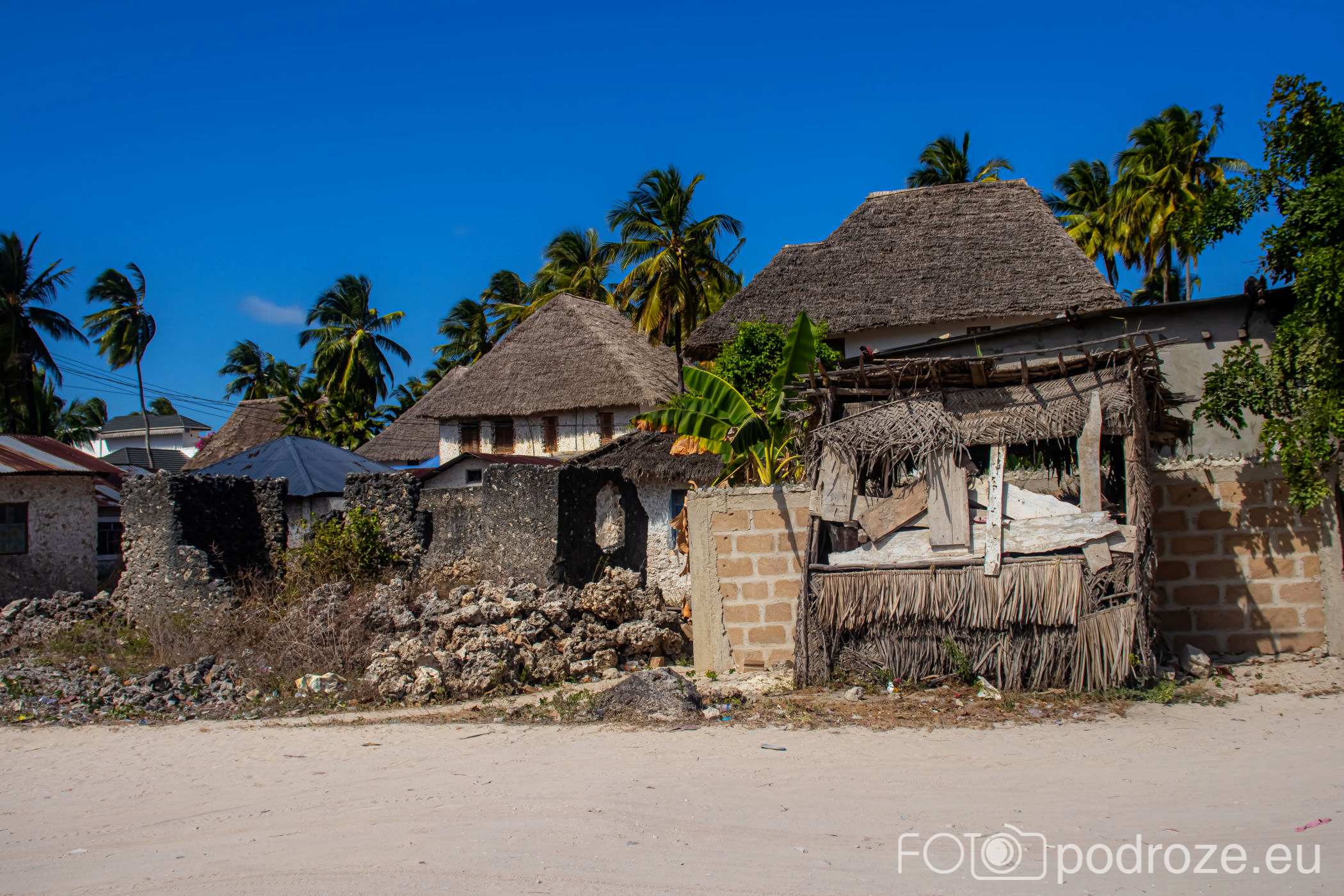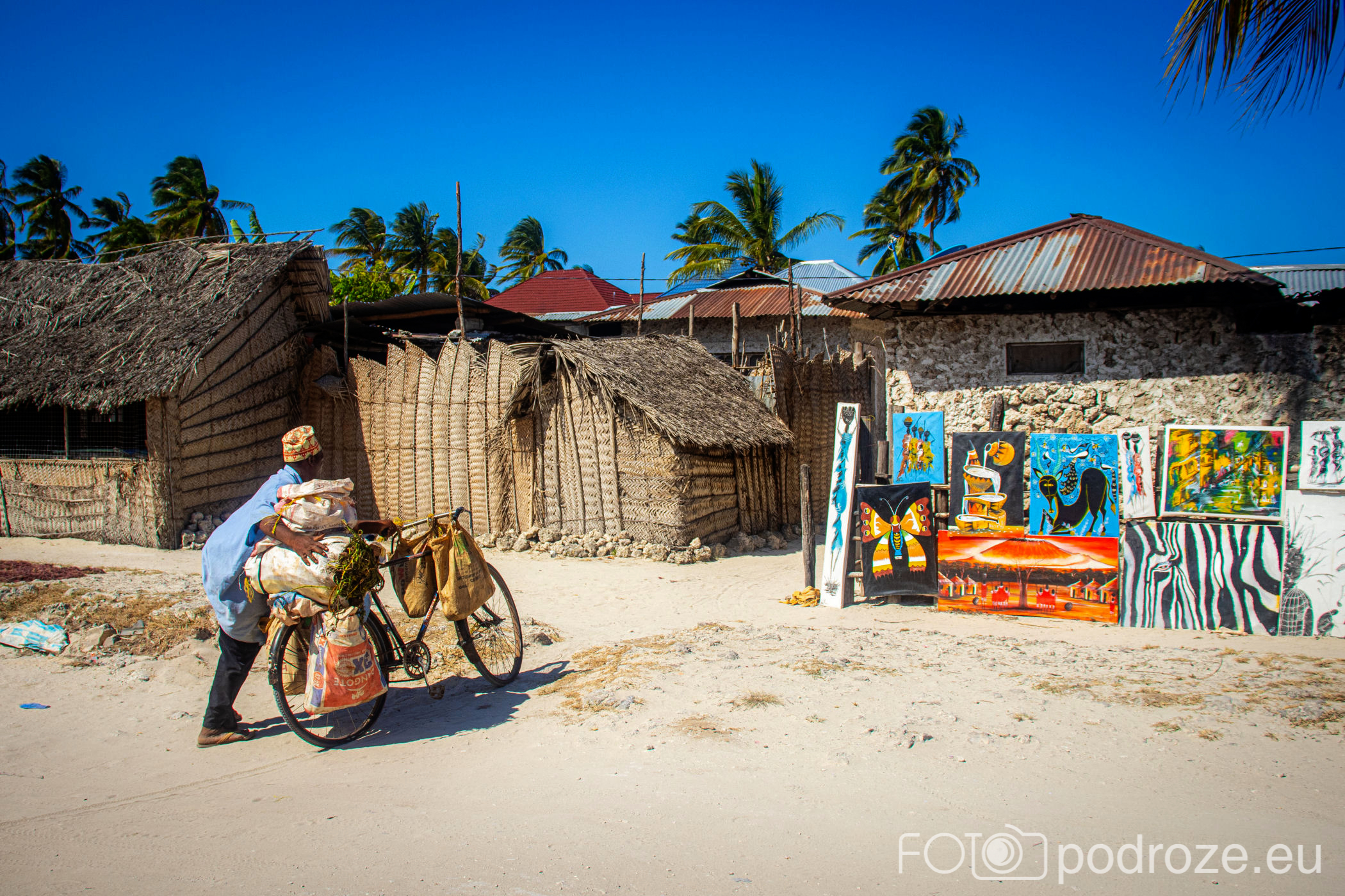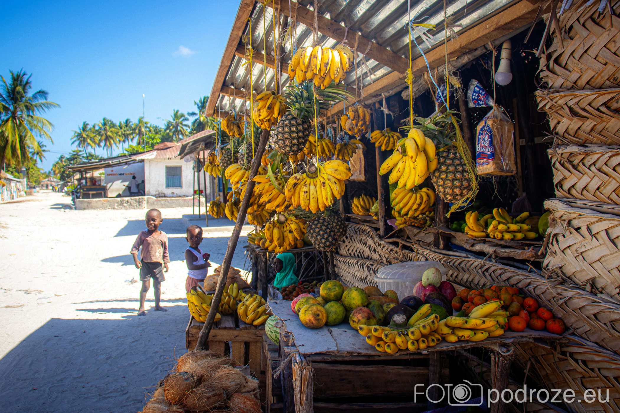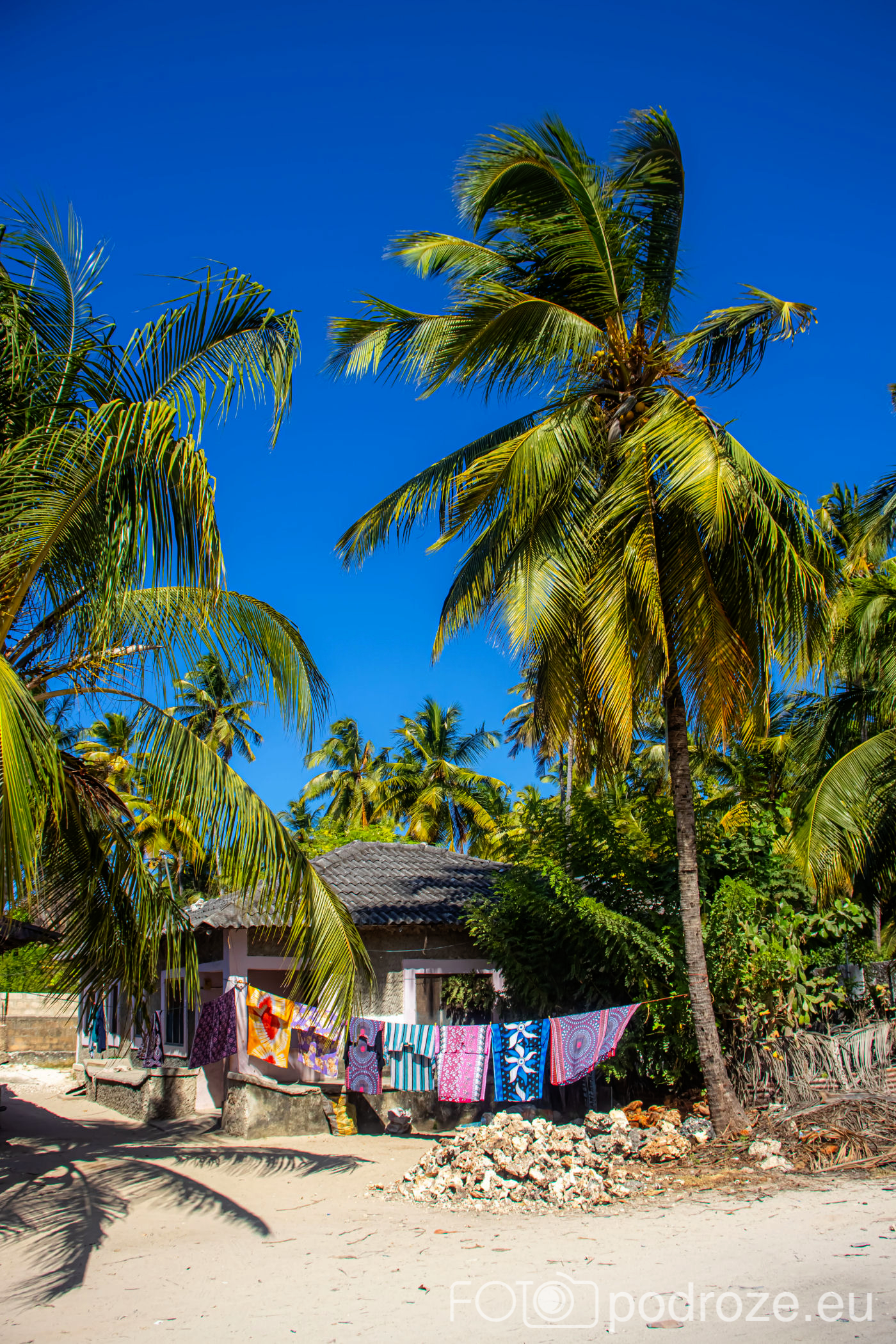Jak już na początku wpisu wspomniałam, Jambiani to takie prawdziwe, autentyczne miejsce na mapie Zanzibaru. W pierwszym momencie miejsce szokuje. Pierwsza linia brzegowa jest urokliwa i zadbana, ale wystarczy przejść już na drugą stronę hotelików, czy knajpek, żeby znaleźć się w innym, realnym afrykańskim świecie. Bita droga pokryta piachem prowadzi nas przez miasteczko. Domy częściowo w ruinie, częściowo niby skończone wyglądają na tymczasowe, ale takie nie są. Co kilkadziesiąt kroków jakiś sklepik, albo raczej stragan z pamiątkami lub owocami. Gdzieniegdzie galeria sztuki, która w całej Tanzanii jest dosłownie wszechobecna. Mijamy szkołę, akurat uczniowie obu płci kończą naukę i rozbiegają się po miasteczku. „Pole pole” (wolno-wolno) i „Hakuna matata” (nie martw się) oddają w pełni atmosferę tego miejsca. Bieda, ale równocześnie uśmiech na twarzach. Tak się tu żyje.