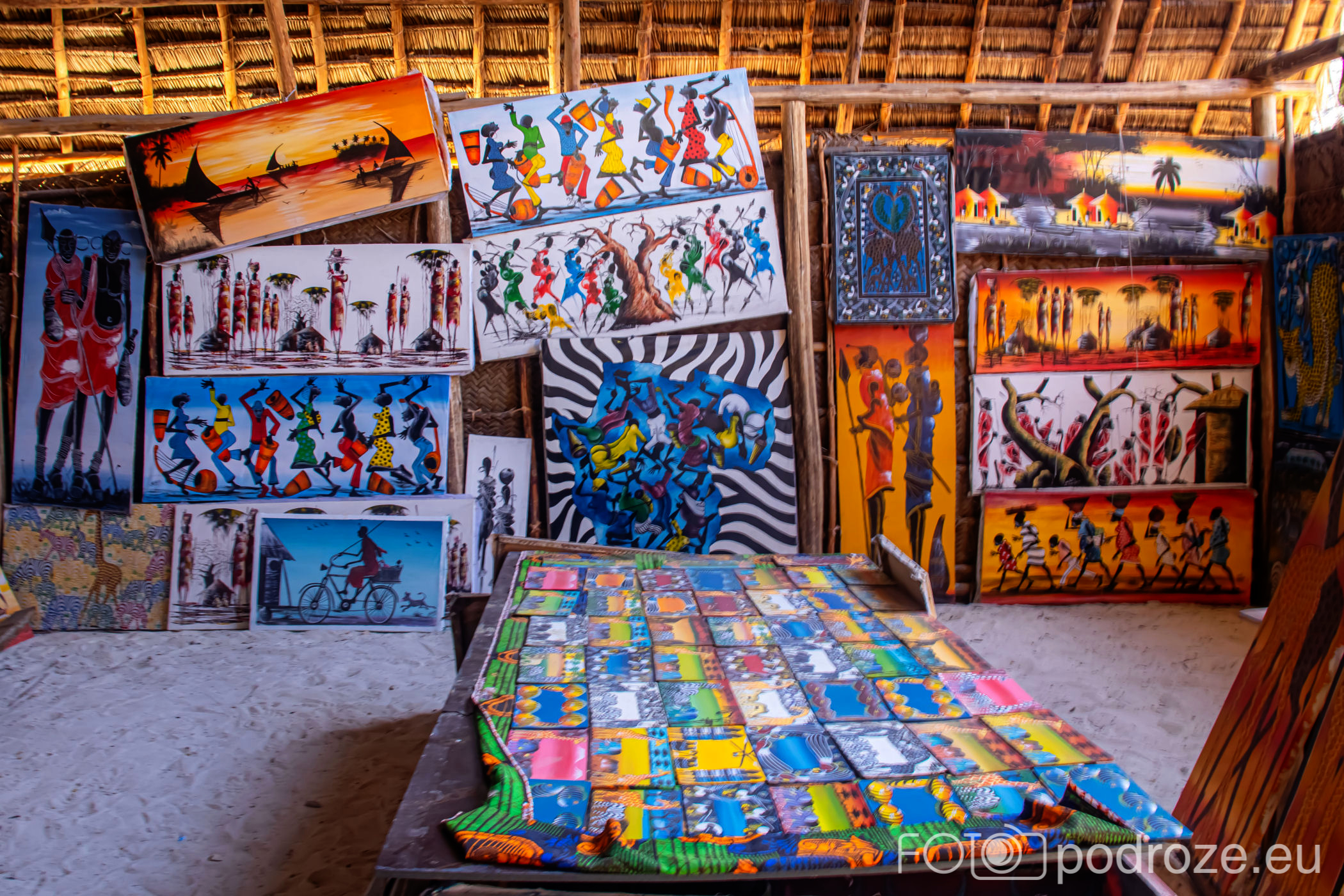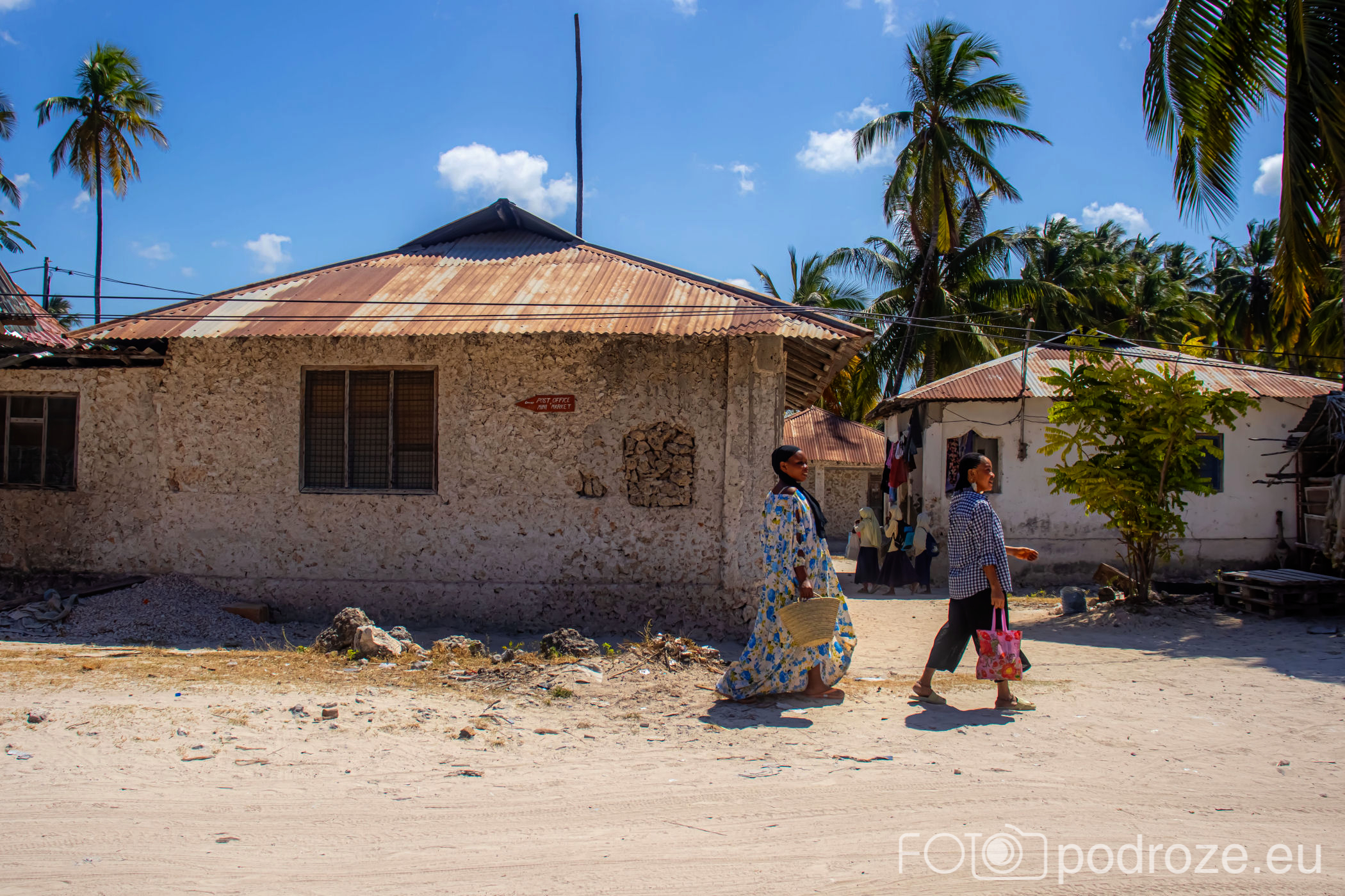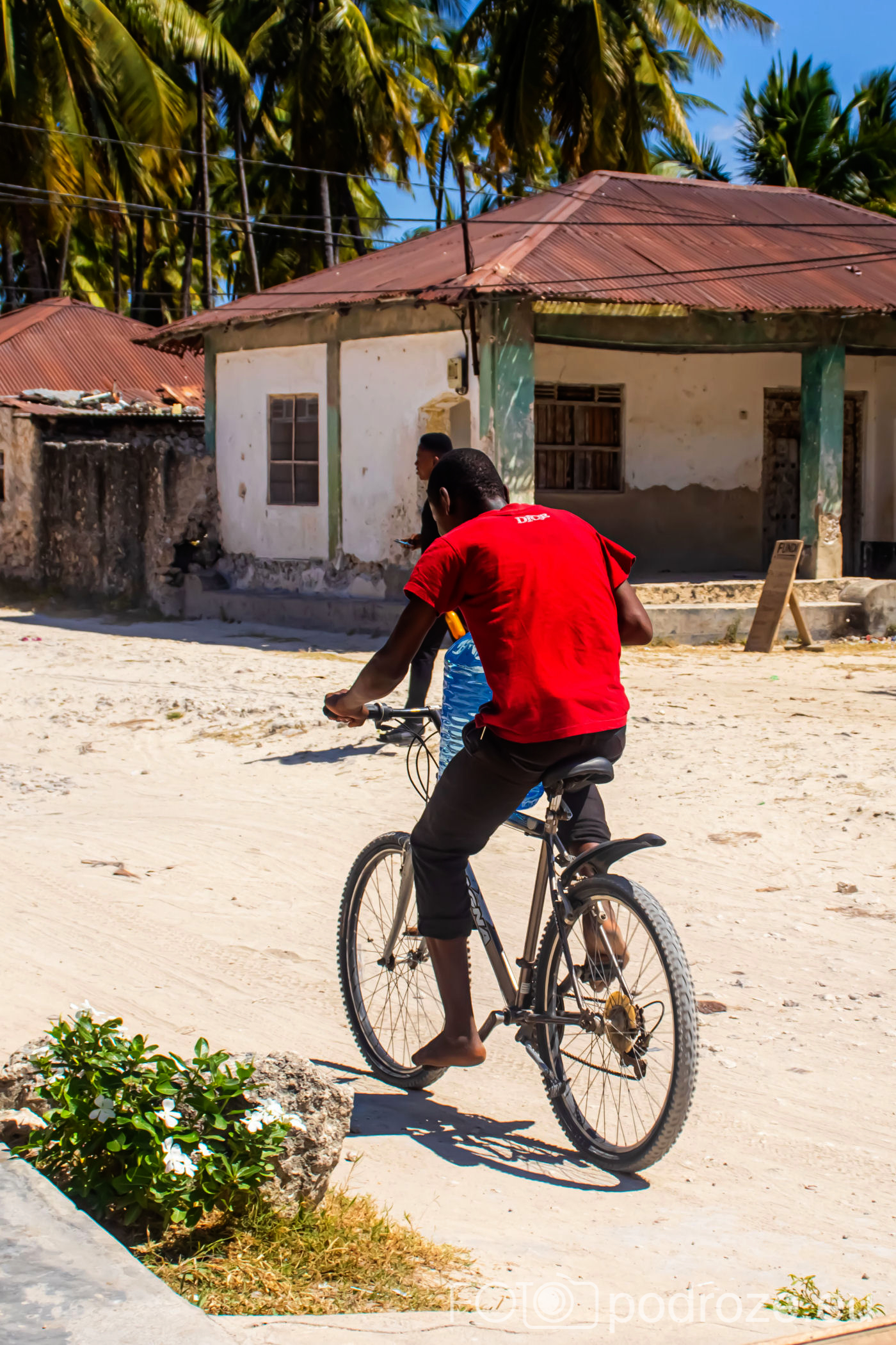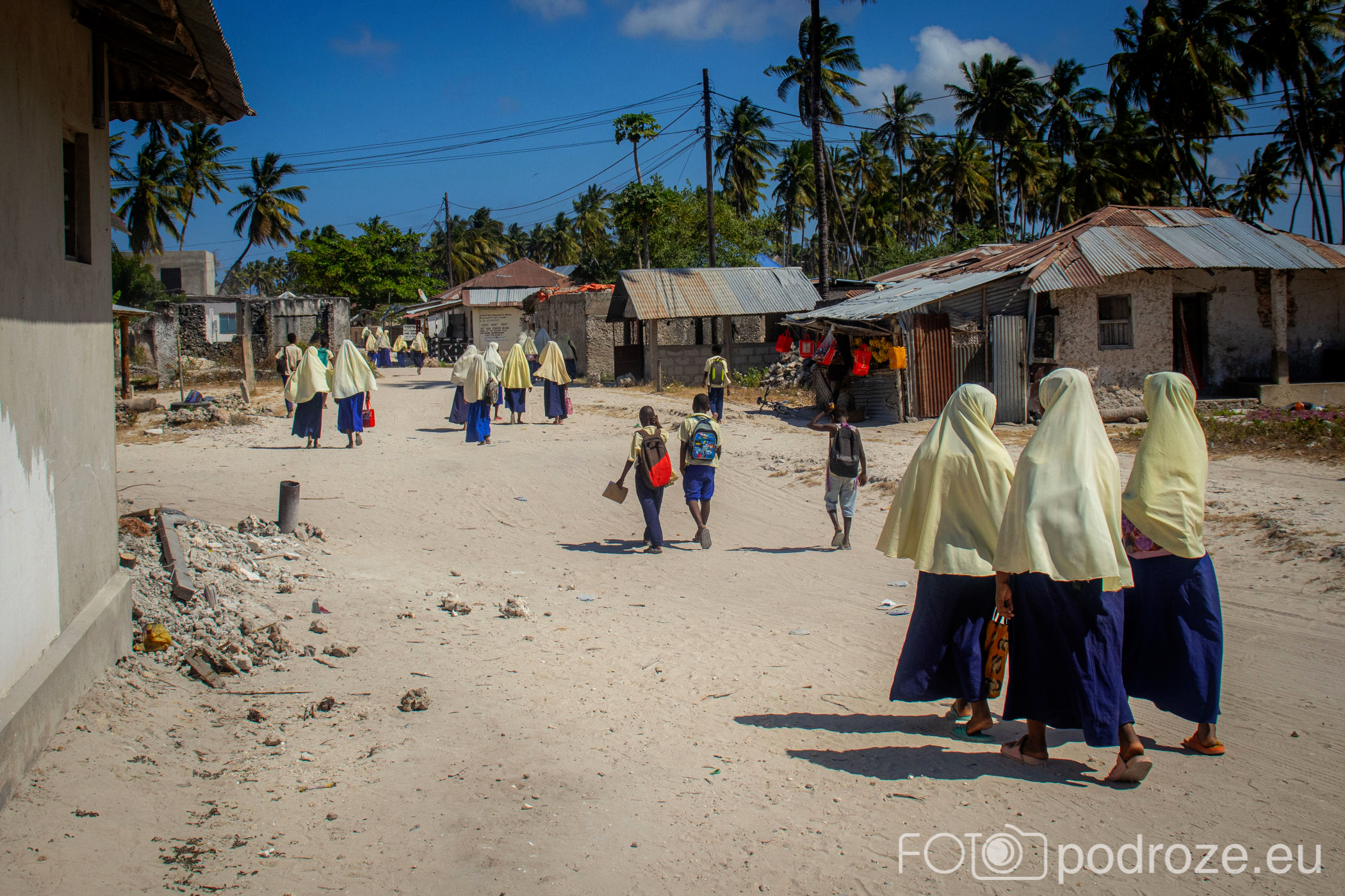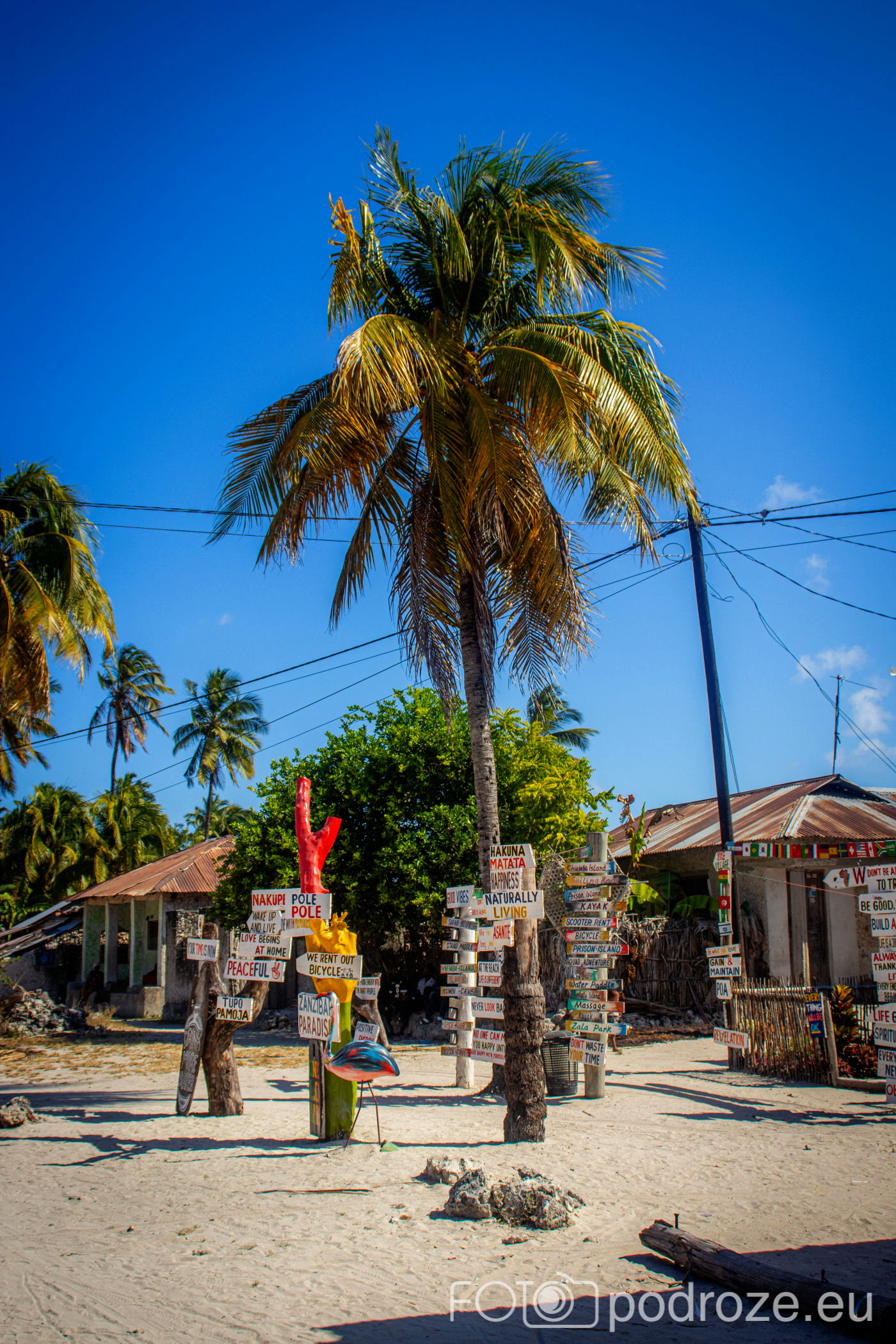 Jak już na początku wpisu wspomniałam, Jambiani to takie prawdziwe, autentyczne miejsce na mapie Zanzibaru. W pierwszym momencie miejsce szokuje. Pierwsza linia brzegowa jest urokliwa i zadbana, ale wystarczy przejść już na drugą stronę hotelików, czy knajpek, żeby znaleźć się w innym, realnym afrykańskim świecie. Bita droga pokryta piachem prowadzi nas przez miasteczko. Domy częściowo w ruinie, częściowo niby skończone wyglądają na tymczasowe, ale takie nie są. Co kilkadziesiąt kroków jakiś sklepik, albo raczej stragan z pamiątkami lub owocami. Gdzieniegdzie galeria sztuki, która w całej Tanzanii jest dosłownie wszechobecna. Mijamy szkołę, akurat uczniowie obu płci kończą naukę i rozbiegają się po miasteczku. „Pole pole” (wolno-wolno) i „Hakuna matata” (nie martw się) oddają w pełni atmosferę tego miejsca. Bieda, ale równocześnie uśmiech na twarzach. Tak się tu żyje.