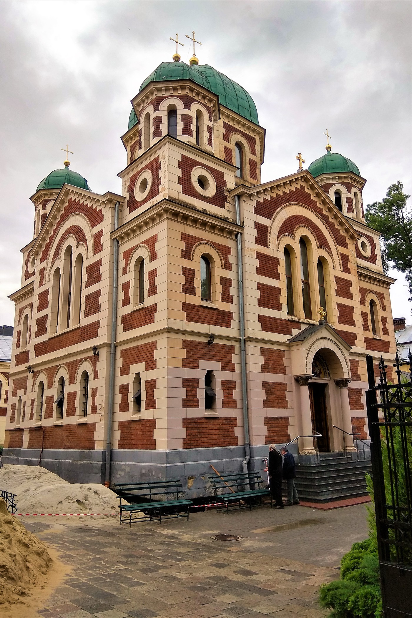 Kierując się na wschód idziemy ulicą Proswity (między Cerkwią Św. Michała, a Domem Gubernatorstwa) w kierunku jeszcze jednej ciekawej cerkwi w tej dzielnicy – Cerkwi Św. Jerzego. Została ona zbudowana w latach 1897–1899 w stylu bizantyjsko-neoromańskim na planie kwadratu. Dach wieńczy duża, centralna kopuła oraz cztery mniejsze kopuły w narożnikach. Każda z czterech elewacji świątyni jest zwieńczona trójkątnym tympanonem. Elewacje wykończono czerwoną cegłą, ozdobiono białym kamieniem, a całość wieńczą zielone kopuły.