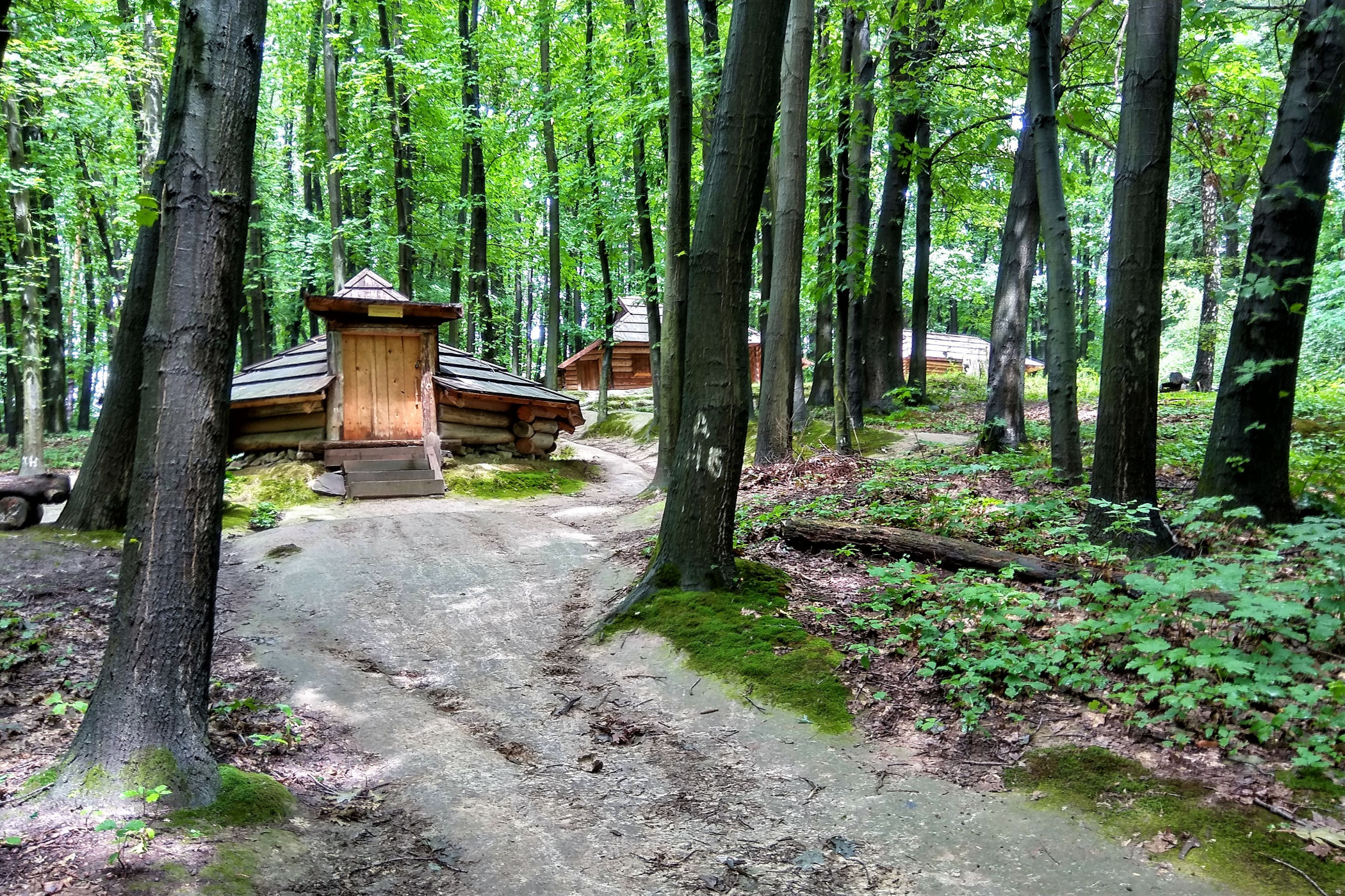 Tuż za kościołem Św. Wołodymira i Olgi zaczyna się mała wspinaczka przez las pełen ziemianek, pieców i innych mniejszych obiektów.