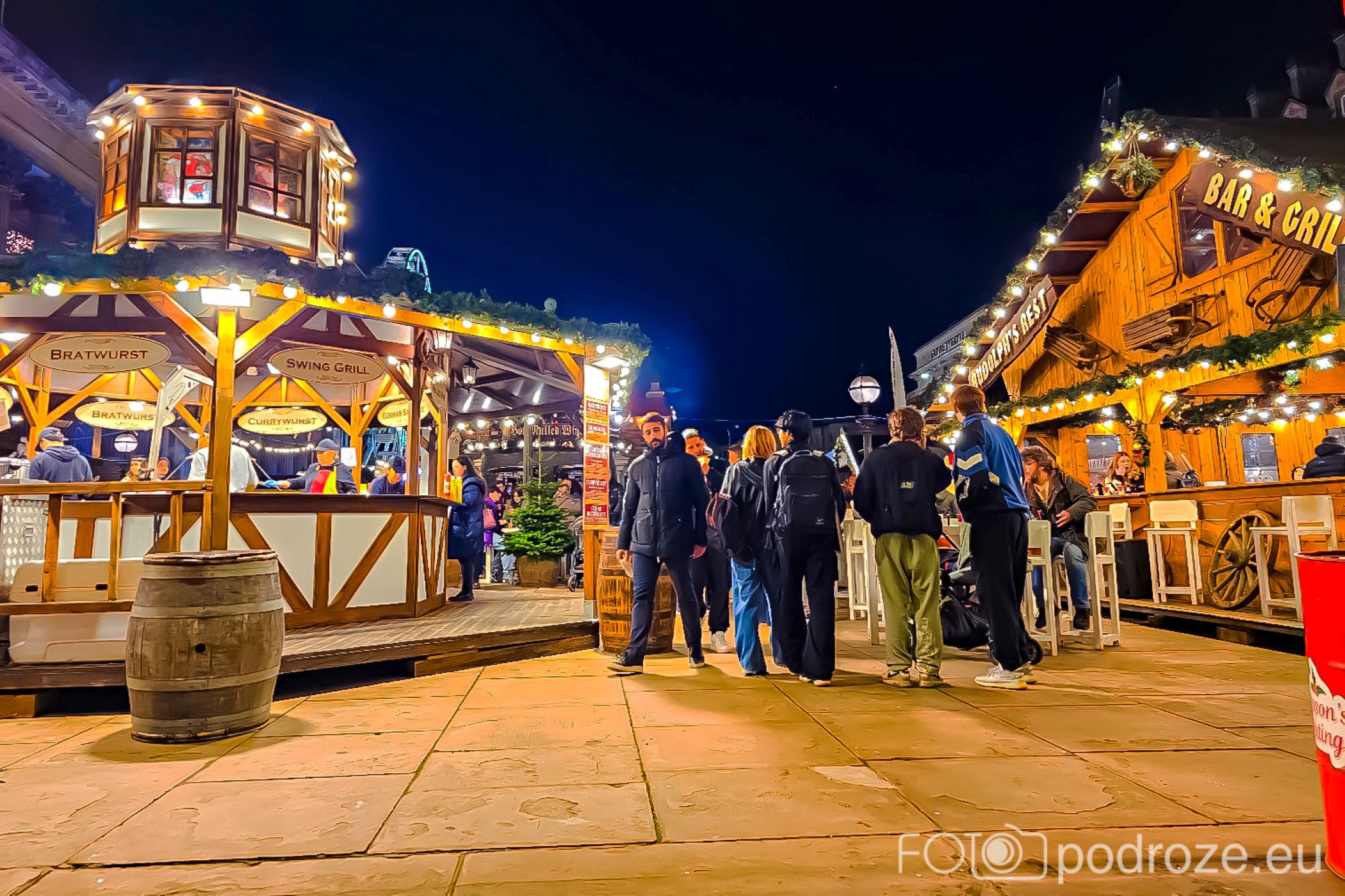 Trudno wyobrazić sobie jarmark bez aromatu grzanego wina. Dla tych, którzy szukają przytulnego miejsca na gorący napój, Jarmark Bożonarodzeniowy w Liverpoolu oferuje liczne bary dla każdego gustu. Możesz wybrać tradycyjny gorący cydr, grzane wino, piwo, gorącą czekoladę czy kawę. Można odpocząć przy ognisku w Tipi Bar, podziwiać widoki z Windmill Bar, poczuć klimat świąt w Alpine Bar, bawić się w Bavarian Bar. Znajdziecie tu też mniejsze bary w beczkach i drewnianych chatkach rozsianych po jarmarku.
