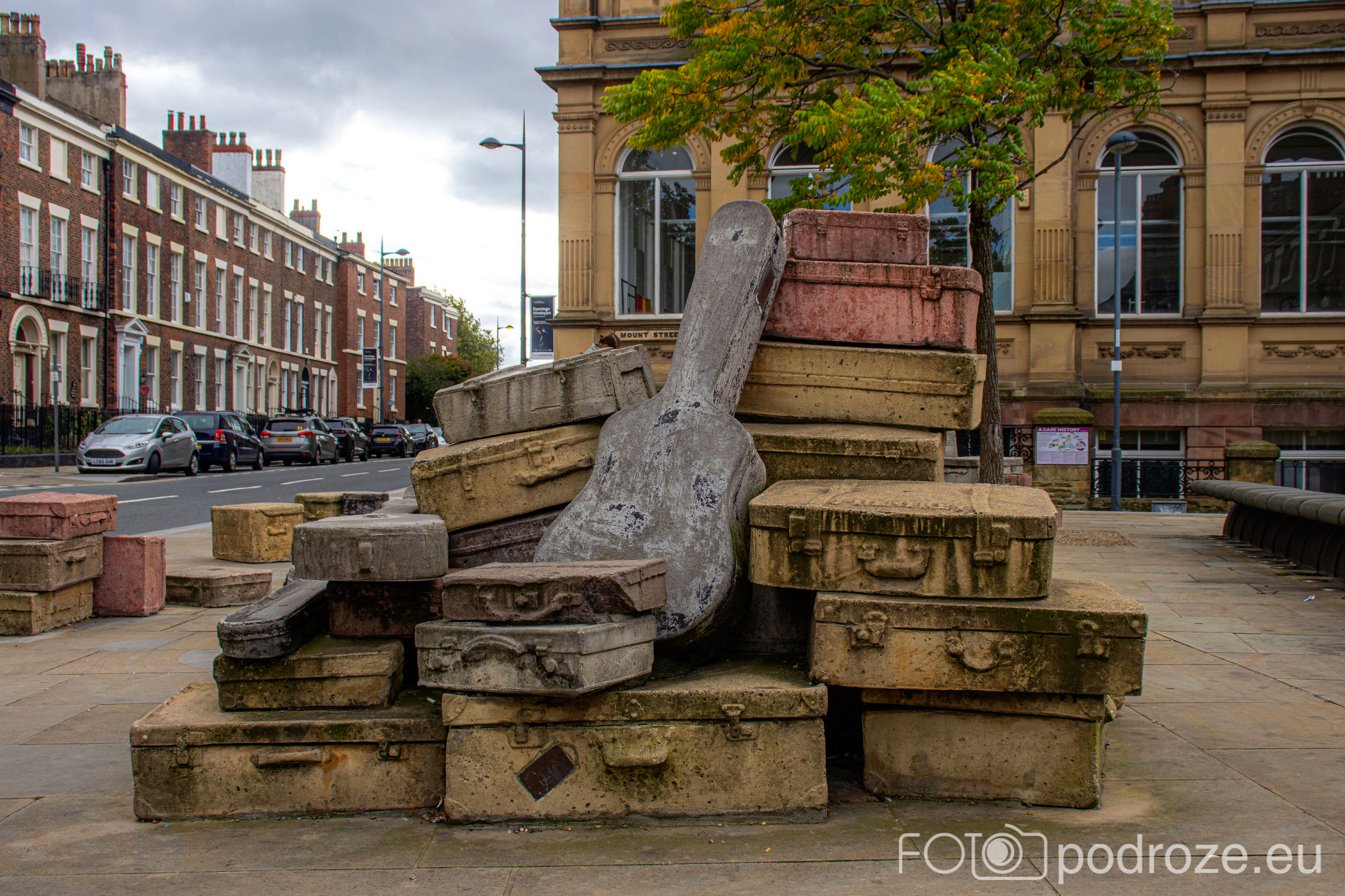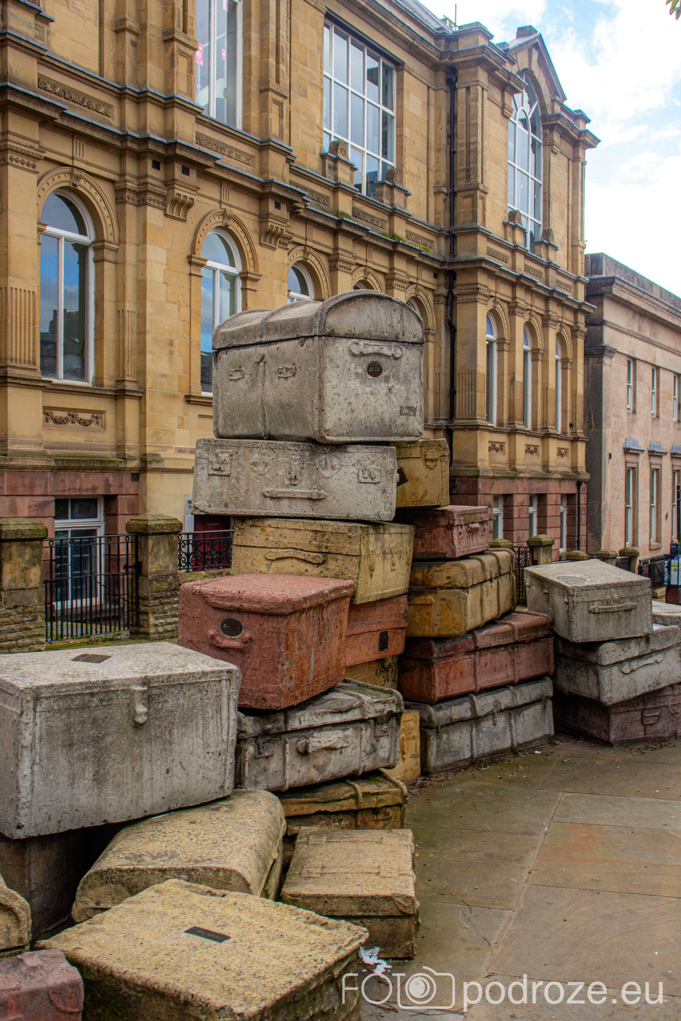 Idąc uliczką Hope Street w dzielnicy natkniemy się na ciekawy pomnik pełen walizek. To „A Case History” by John King znajdujace się pod szkołą artystyczną.