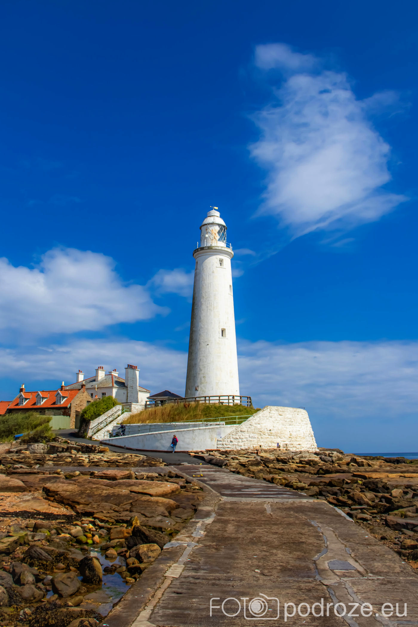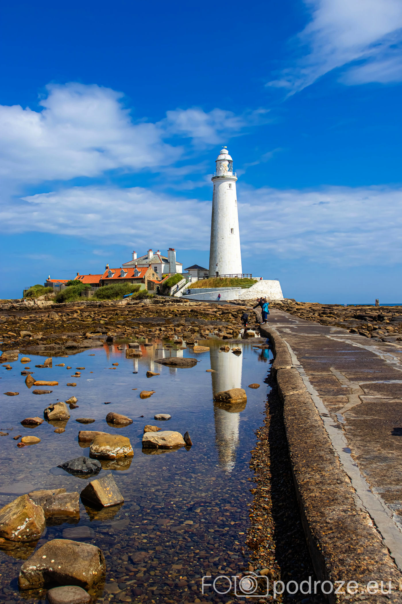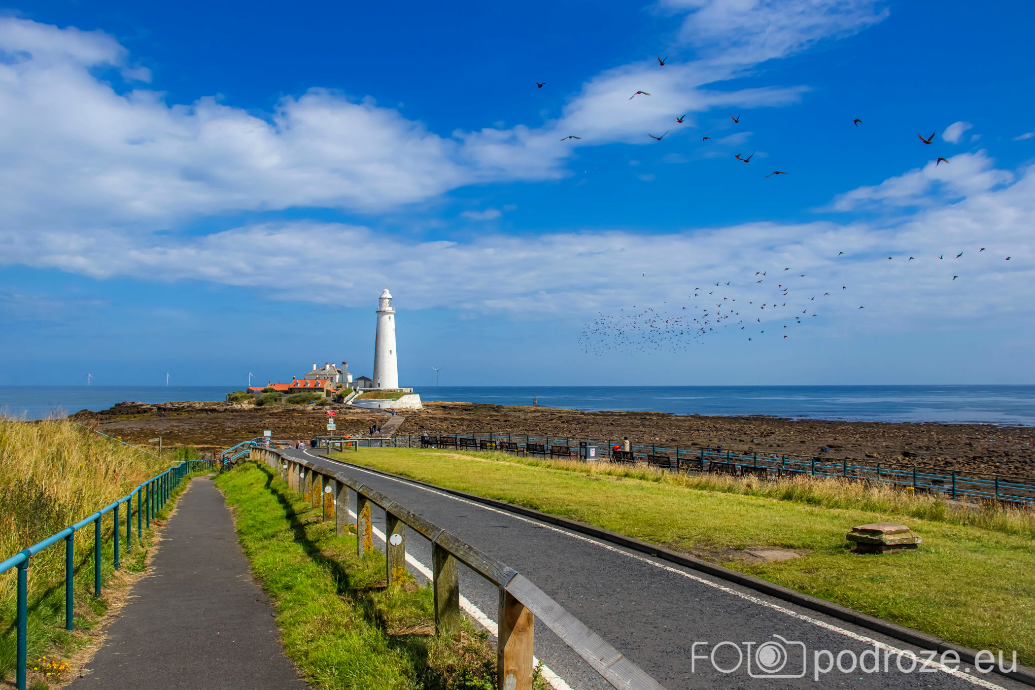 Zaledwie 7 kilometrów dalej jadąc na północ od Tynemouth dojeżdżamy do fantastycznego miejsca. Tu na wyspie połączonej z lądem betonowym chodnikiem znajduje się ogromna latarnia morska i rezerwat – St Mary’s Island Nature Reserve . Zostawiamy auto na dużym parkingu i dalej na piechotę wędrujemy w stronę latarni.