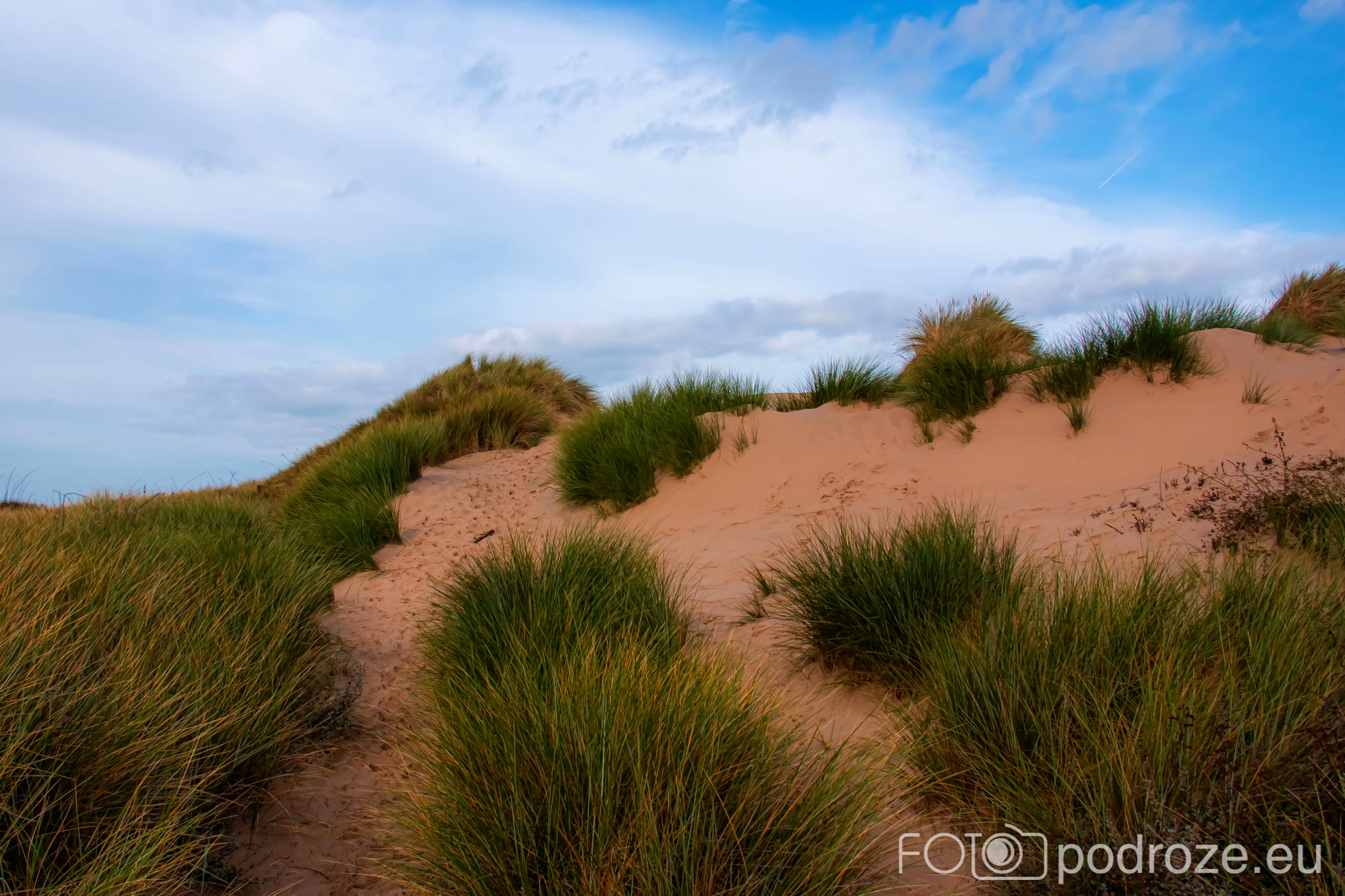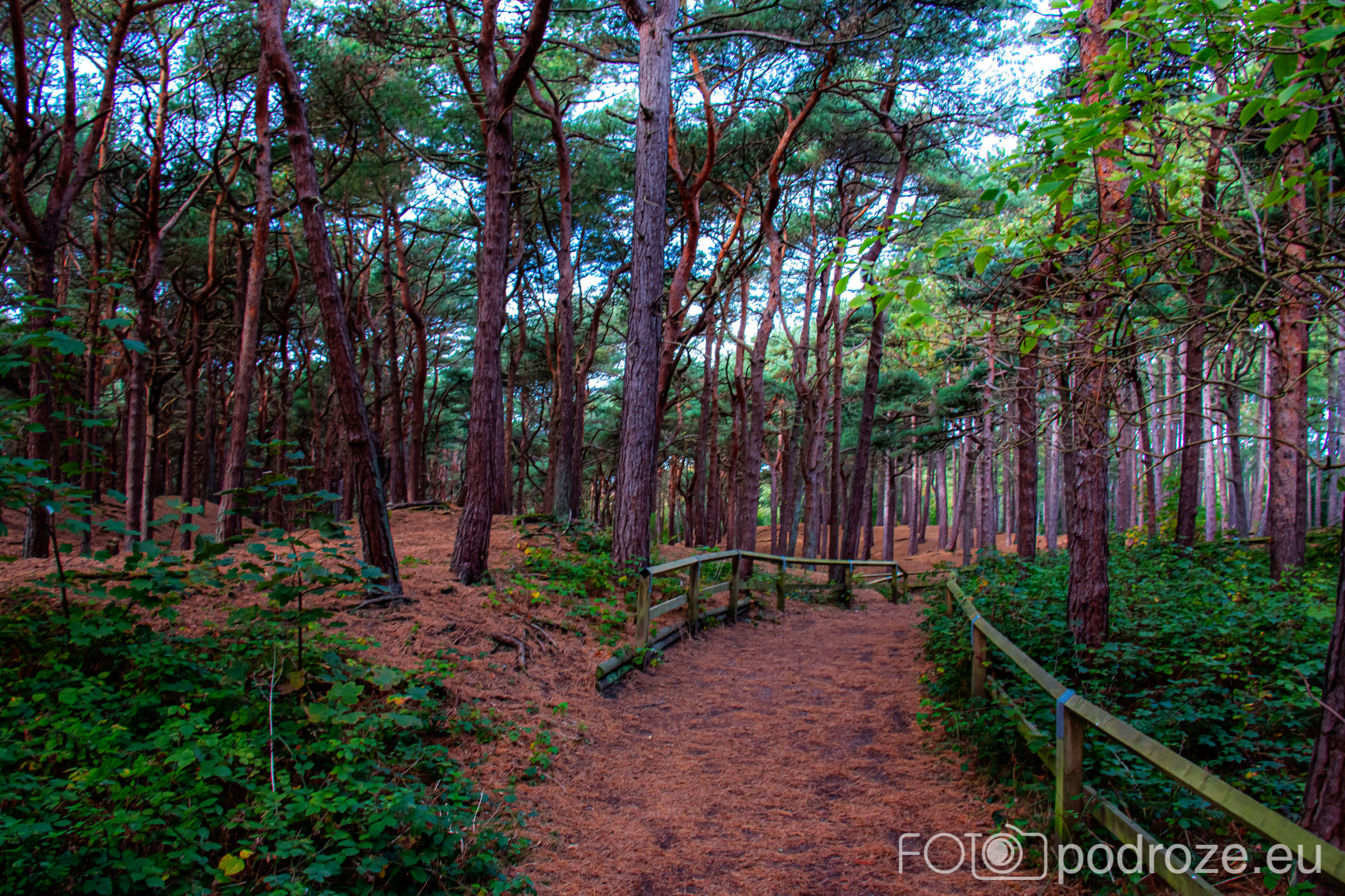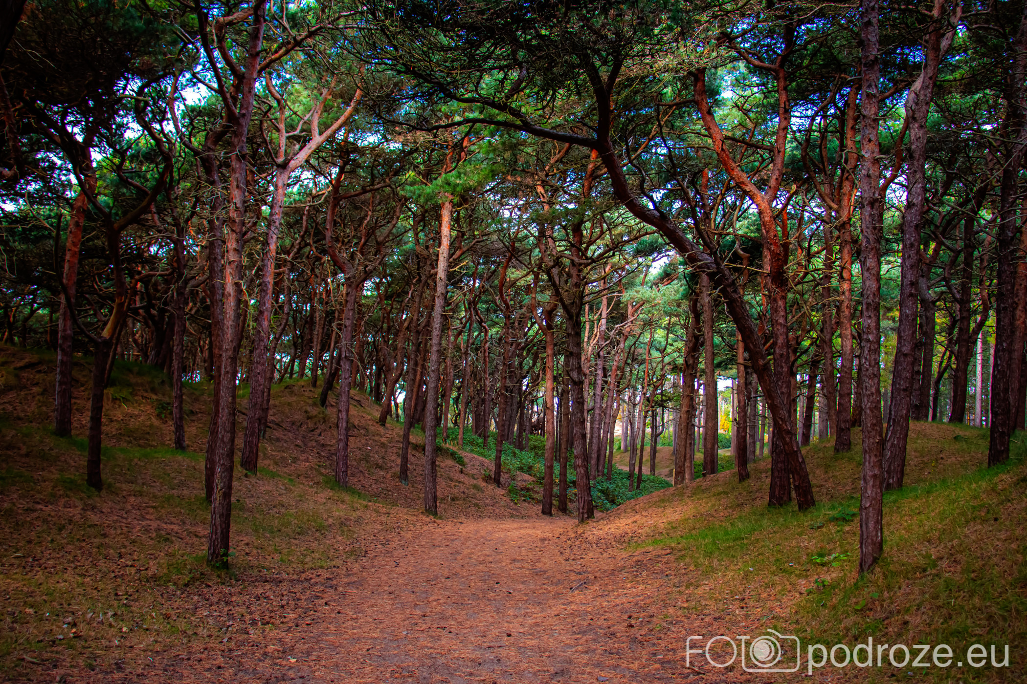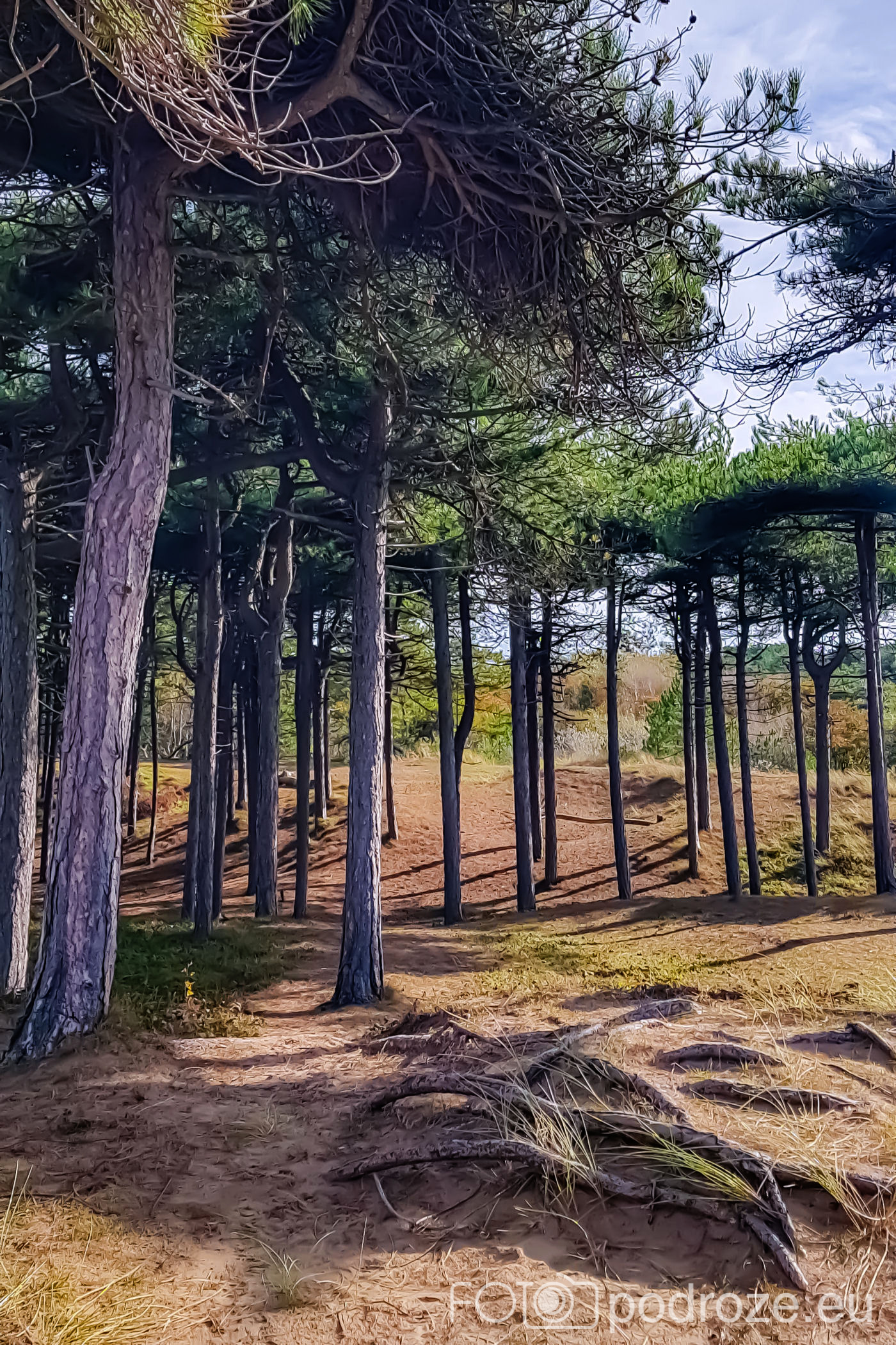 Przez lasek sosnowy dochodzi się do fantastycznych wydm. Porośnięte niską trawą tworzą ciekawe krajobrazy.