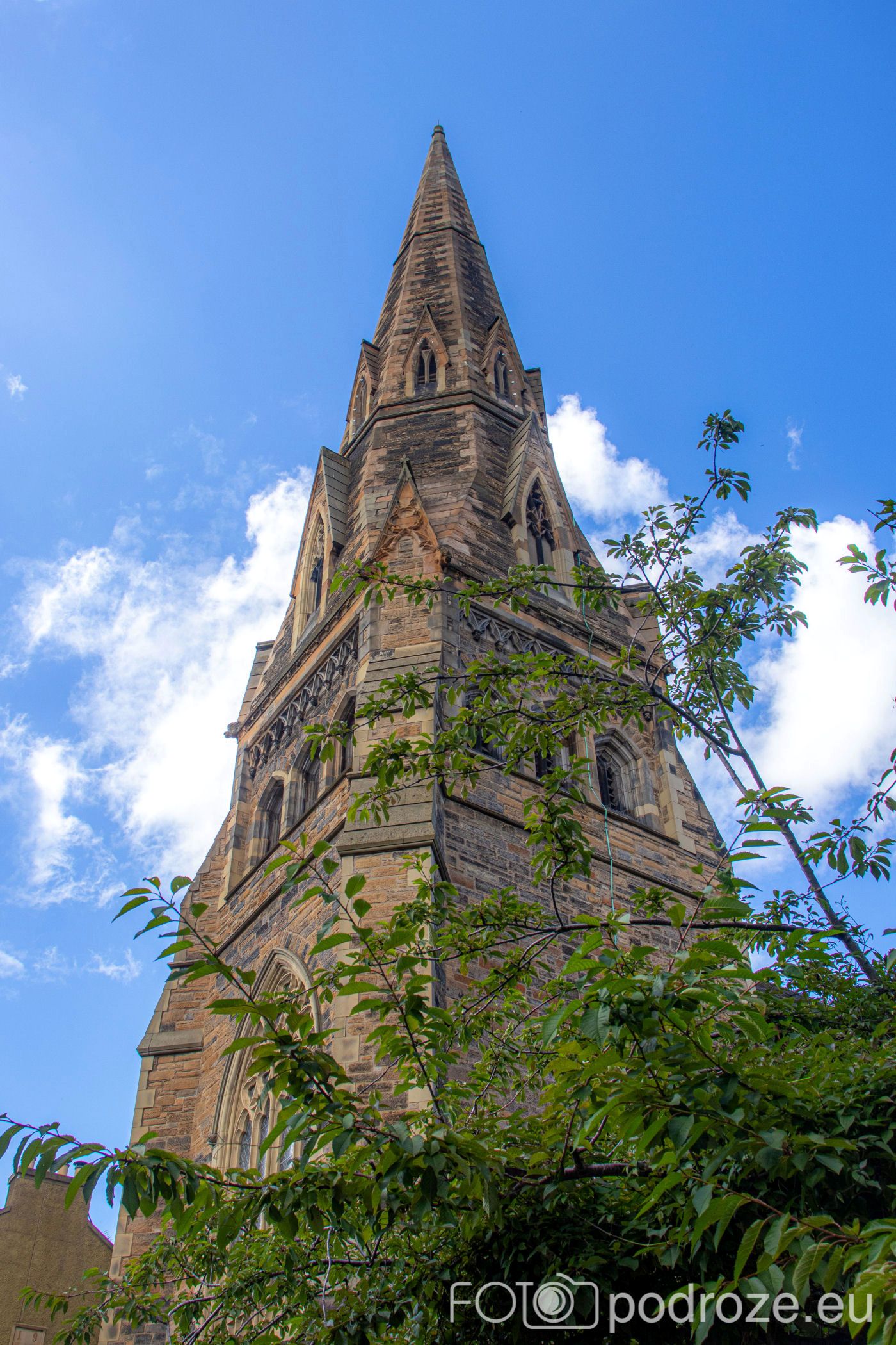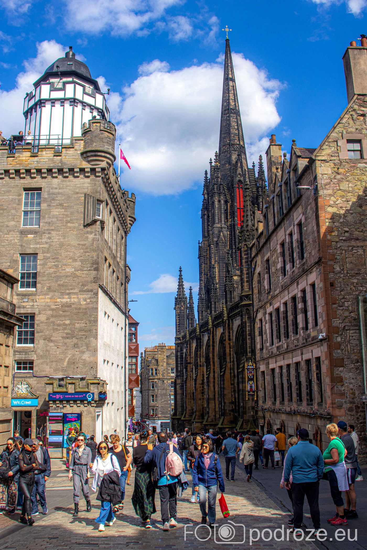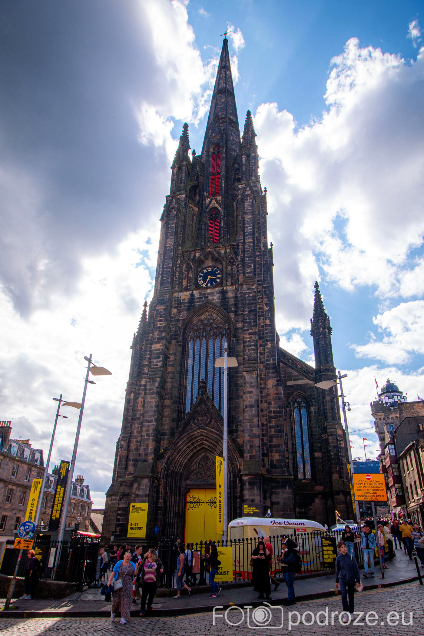 Tolbooth Kirk stoi po lewej stronie, mijamy go i idziemy w stronę zamku. Najpiękniejszy widok jest na ulicę Castle Hill patrząc w dół od strony zamku. To szkocki kościół episkopalny zbudowany w latach 1846-1847 w stylu gotyckim. Kiedyś było to miejsce kultu, obecnie odbywa się w nim Międzynarodowy Festiwal w Edynburgu. Jego ciemna fasada, strzelista wieża wypełniona czerwonymi wstawkami budzi grozę i budzi zachwyt.