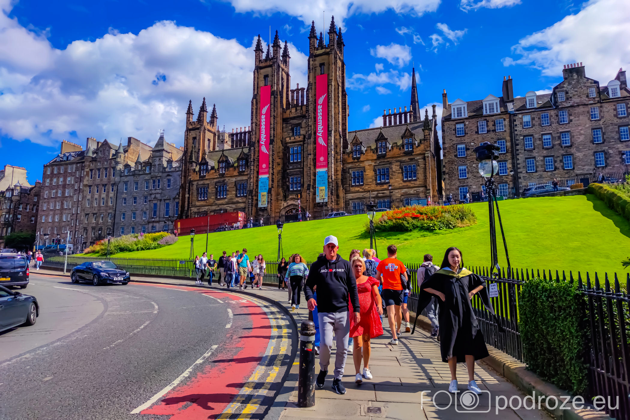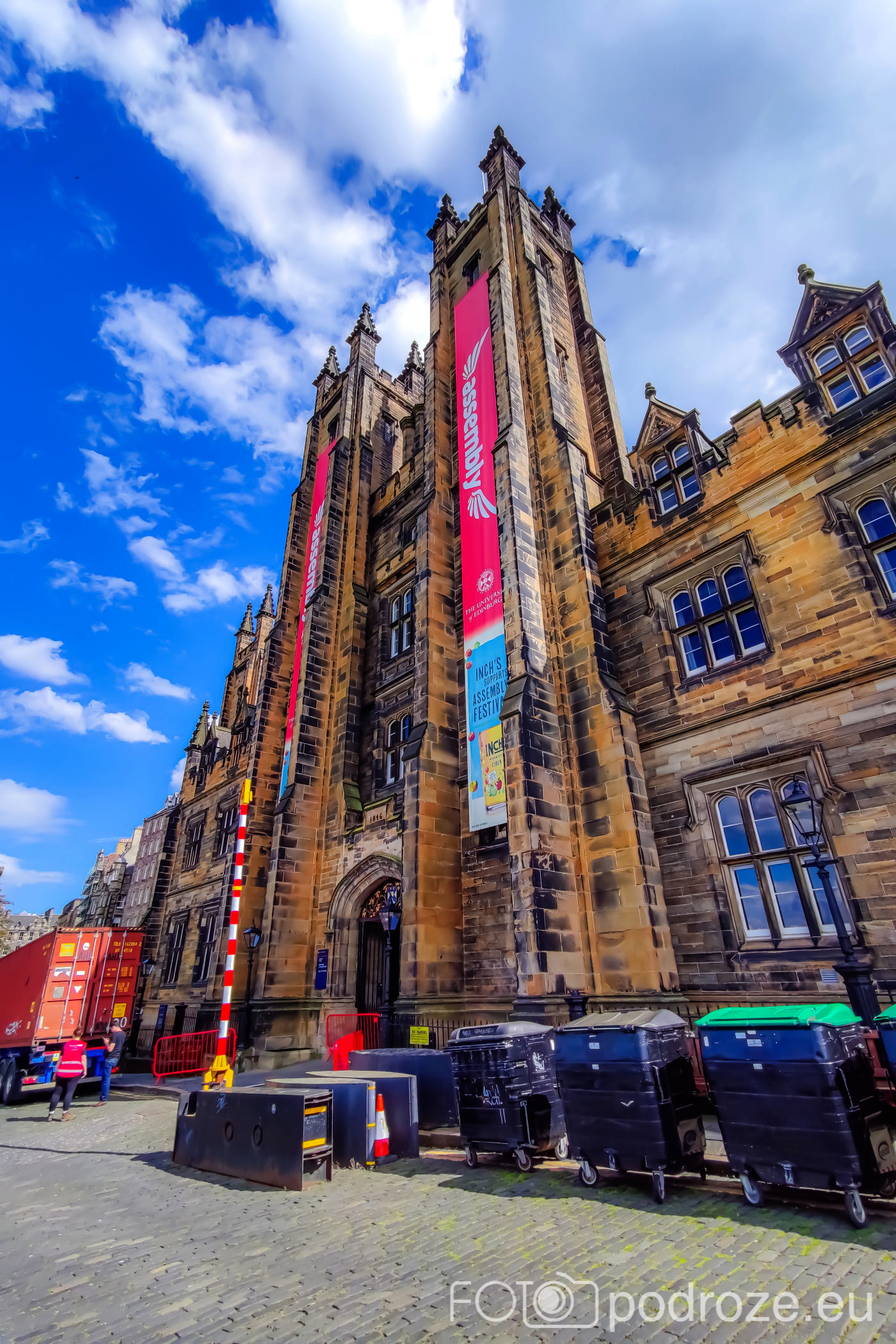 Po prawej stronie ulicy wyrasta nam przed oczami ogromny budynek z dwoma wieżami . Assembly Hall to inaczej Sala Zgromadzeń z przeznaczeniem na spotkania Zgromadzenia Ogólnego Kościoła Szkocji, który powstał po rozłamie w Kościele w 1843 roku. Nowy Kościół Szkocji pilnie potrzebował nowego Kolegium Teologicznego i siedziby Wolnego Wysokiego Kościoła. Kamień węgielny pod budowę został położony w 1846 roku. W latach późniejszych Sala Zgromadzeń była tymczasową salą obrad Parlamentu Szkockiego. Obecnie ze względu na swój potencjał gości wielkie festiwale i przedstawienia teatralne.