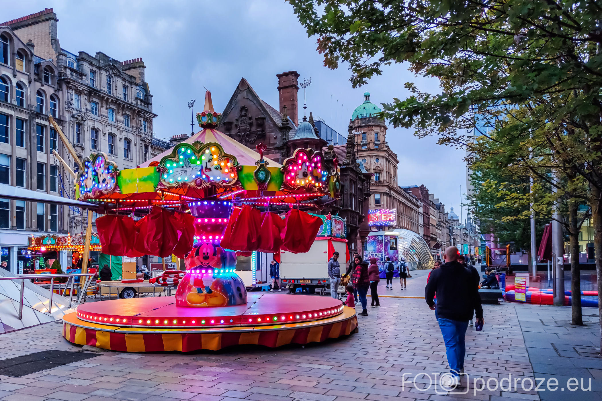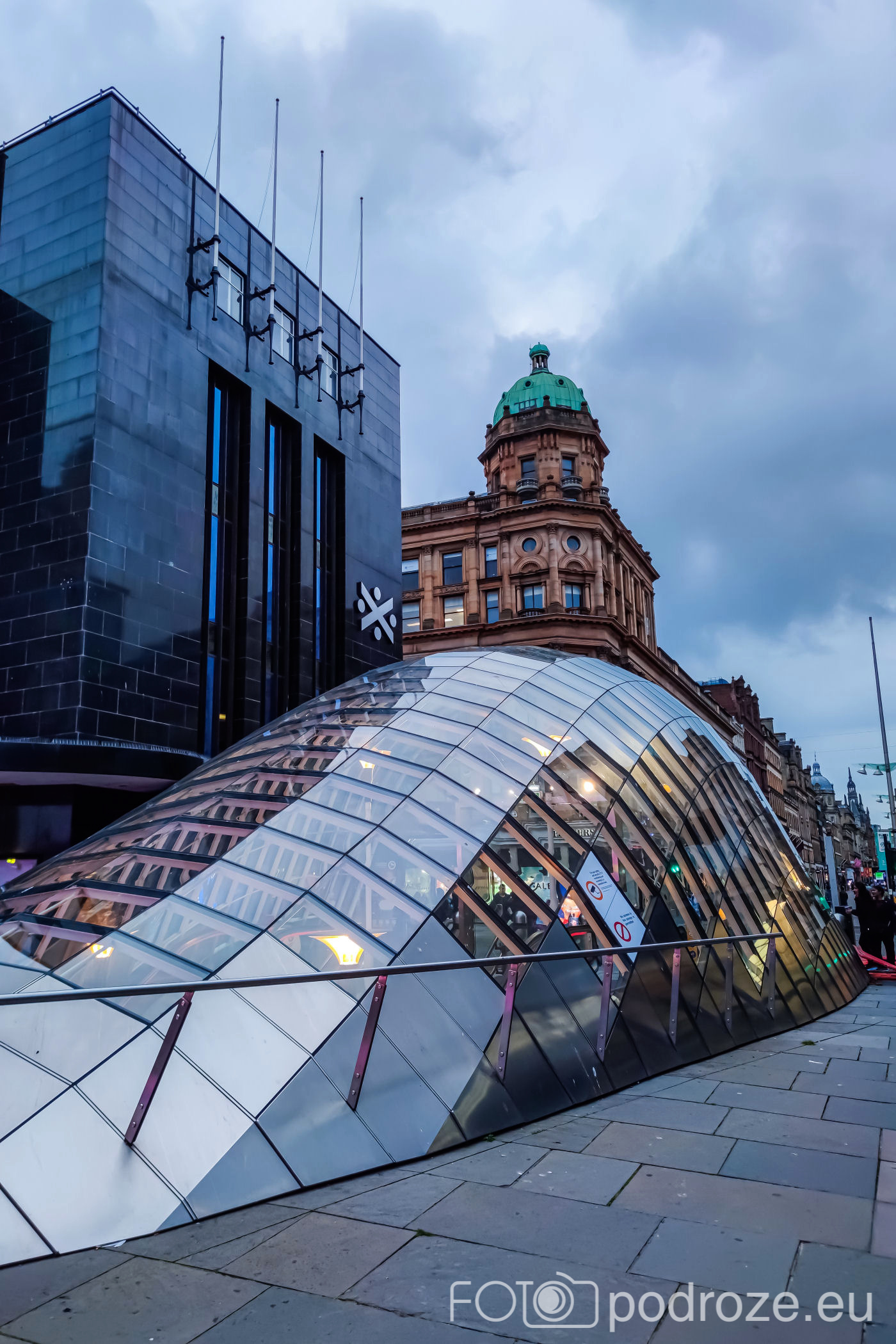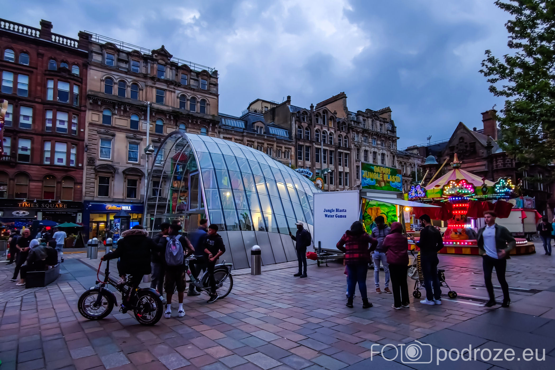 Koniec deptaka to plac St Enoch Squere . Na środku przeszklone wejście do stacji metra, a wokół rozstawione wesołe miasteczko.