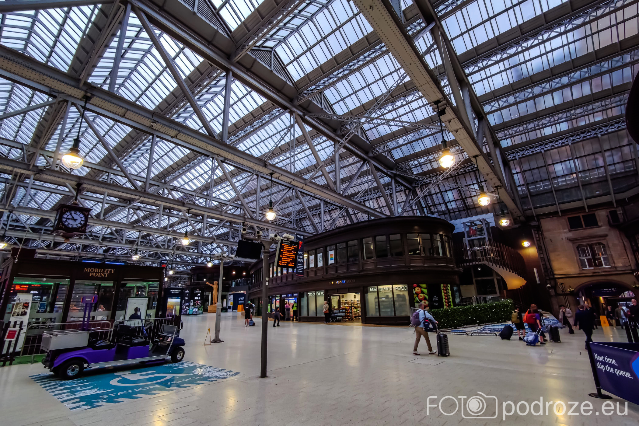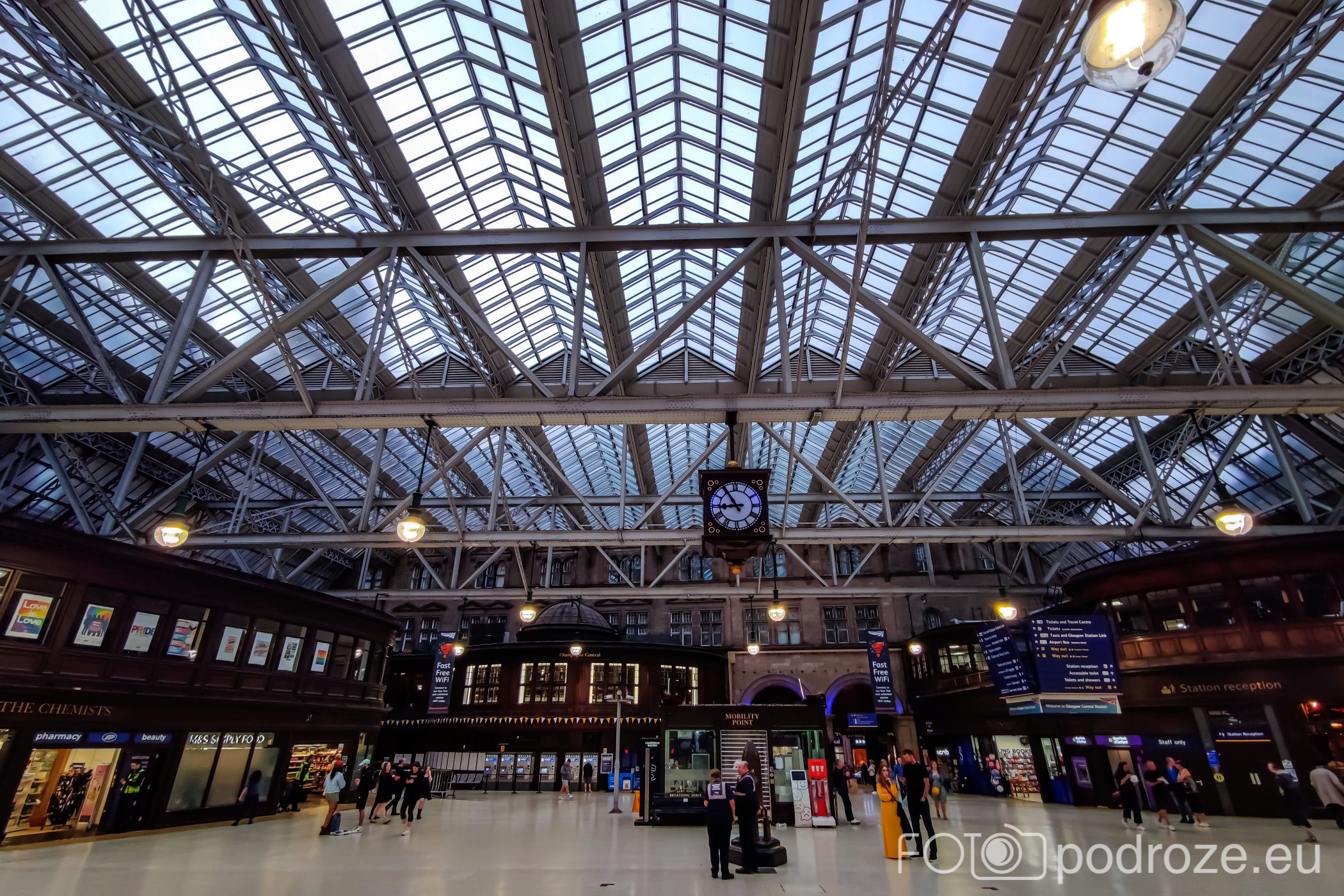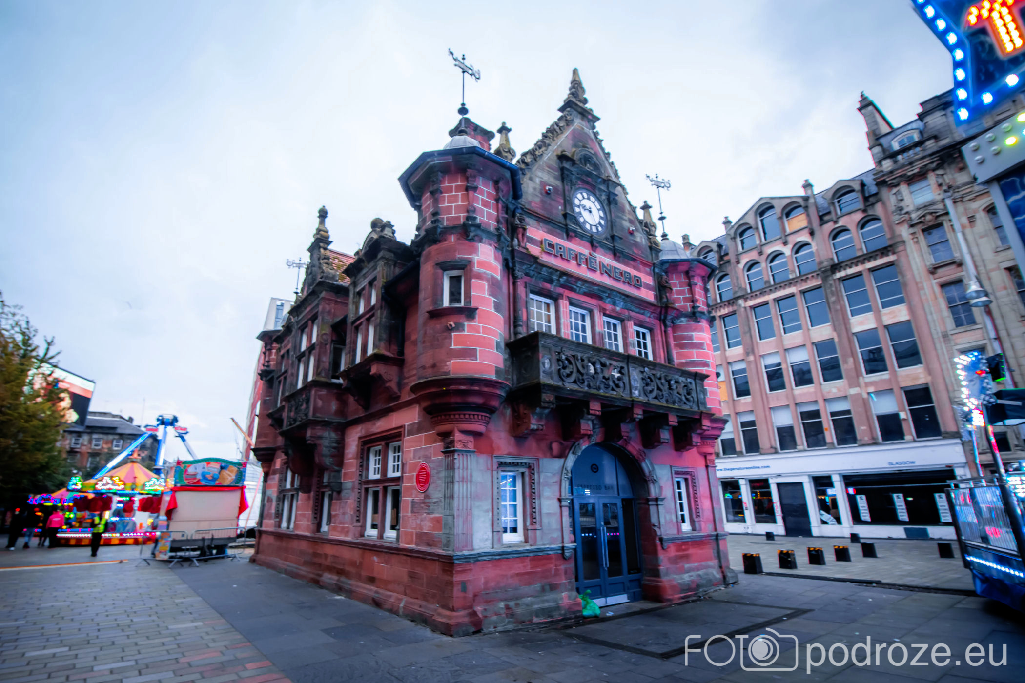 Koniec deptaka to plac St Enoch Squere . Na środku przeszklone wejście do stacji metra, a wokół rozstawione wesołe miasteczko.