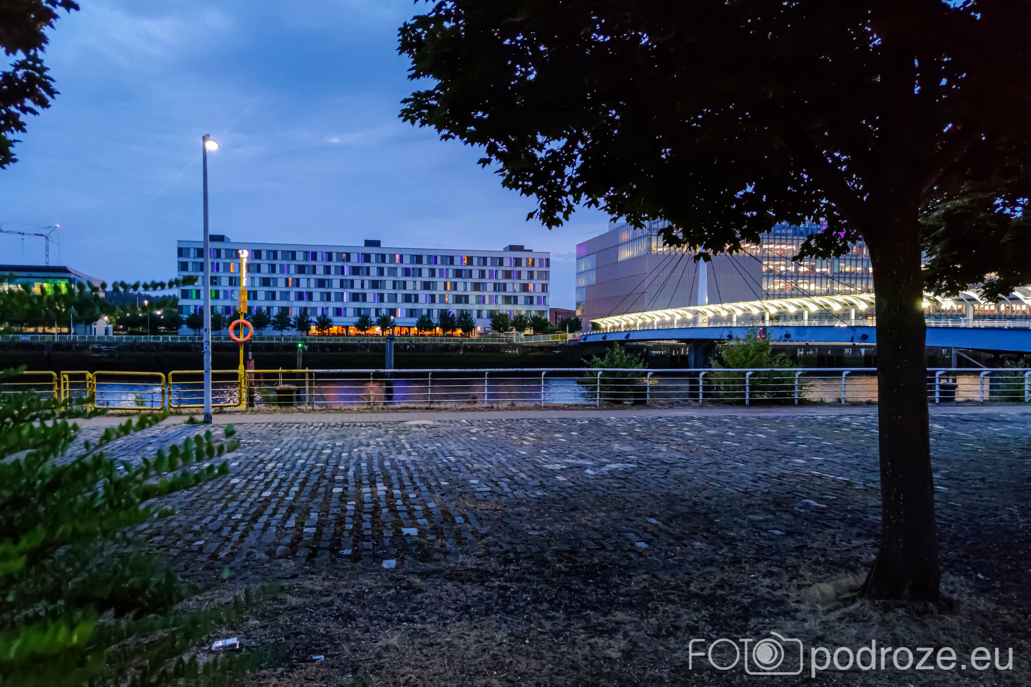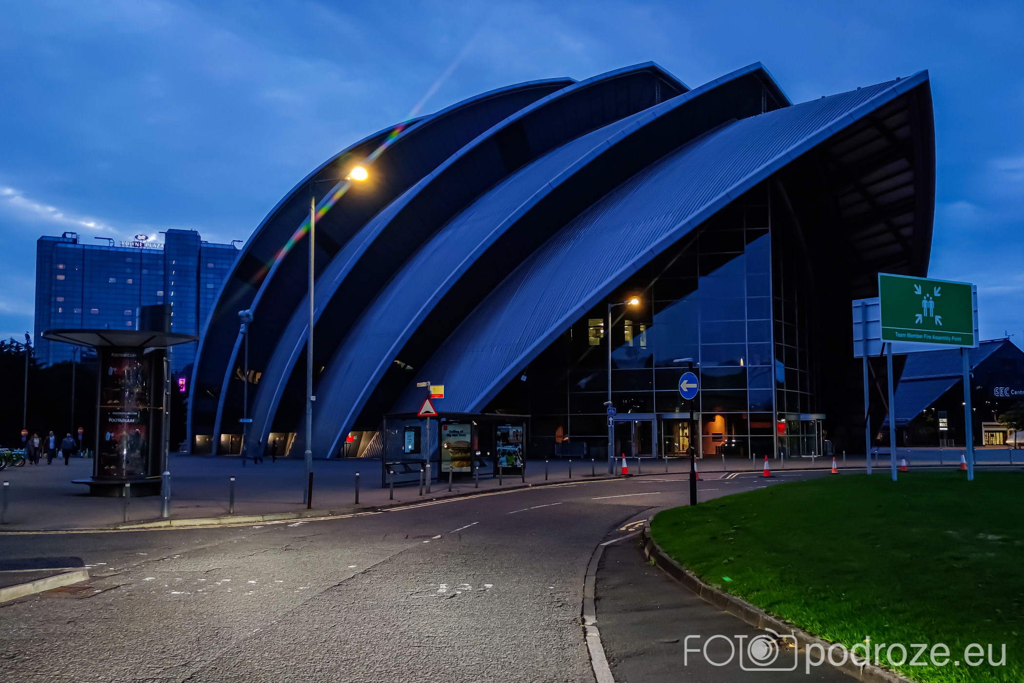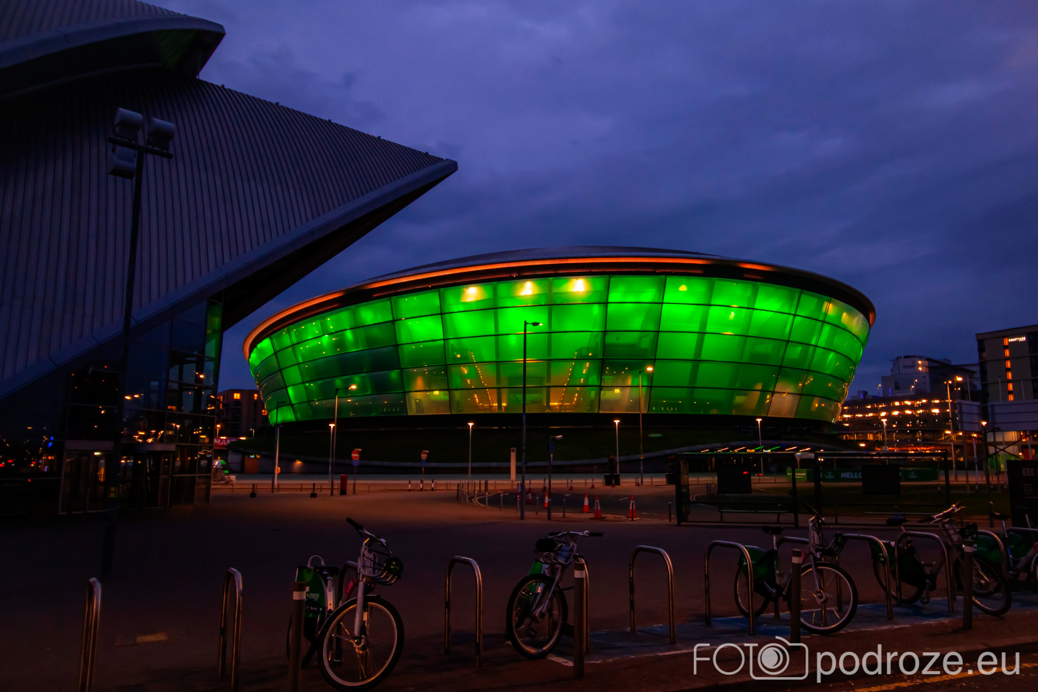 Clyde Auditorium , OVO Hydro . Pierwszy z nich przypomina wyglądam wielkie pancernika, drugi to podświetlony na zielono spodek. Po drugiej stronie rzeki też ciekawa zabudowa, w oddali widać centrum nauki. Wielka szkoda, że nie ma w pobliżu możliwości zaparkowania i przejścia się, aby na spokojnie obejrzeć te obiekty.