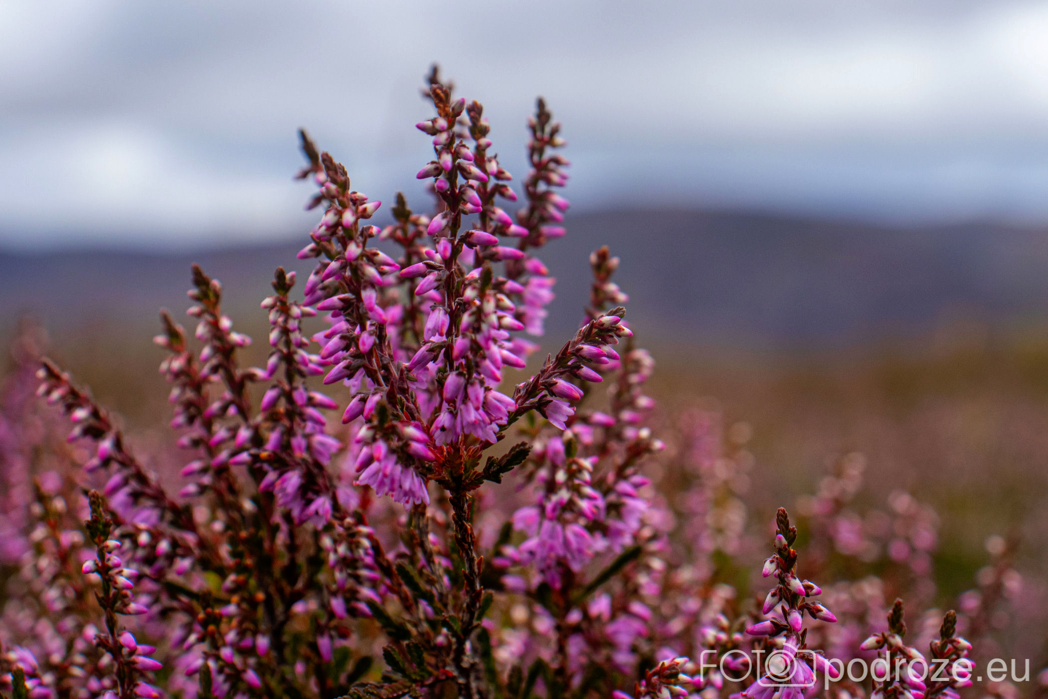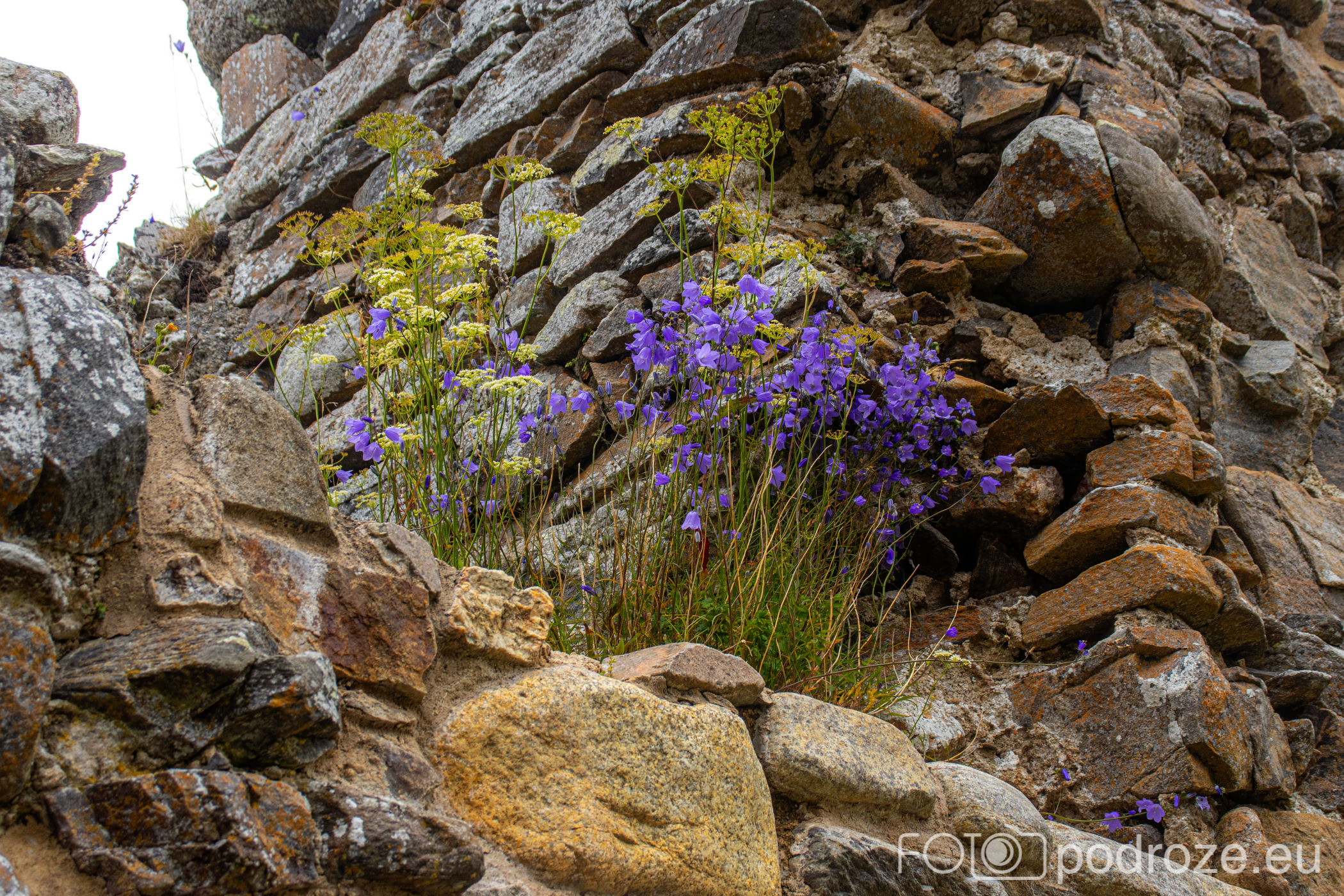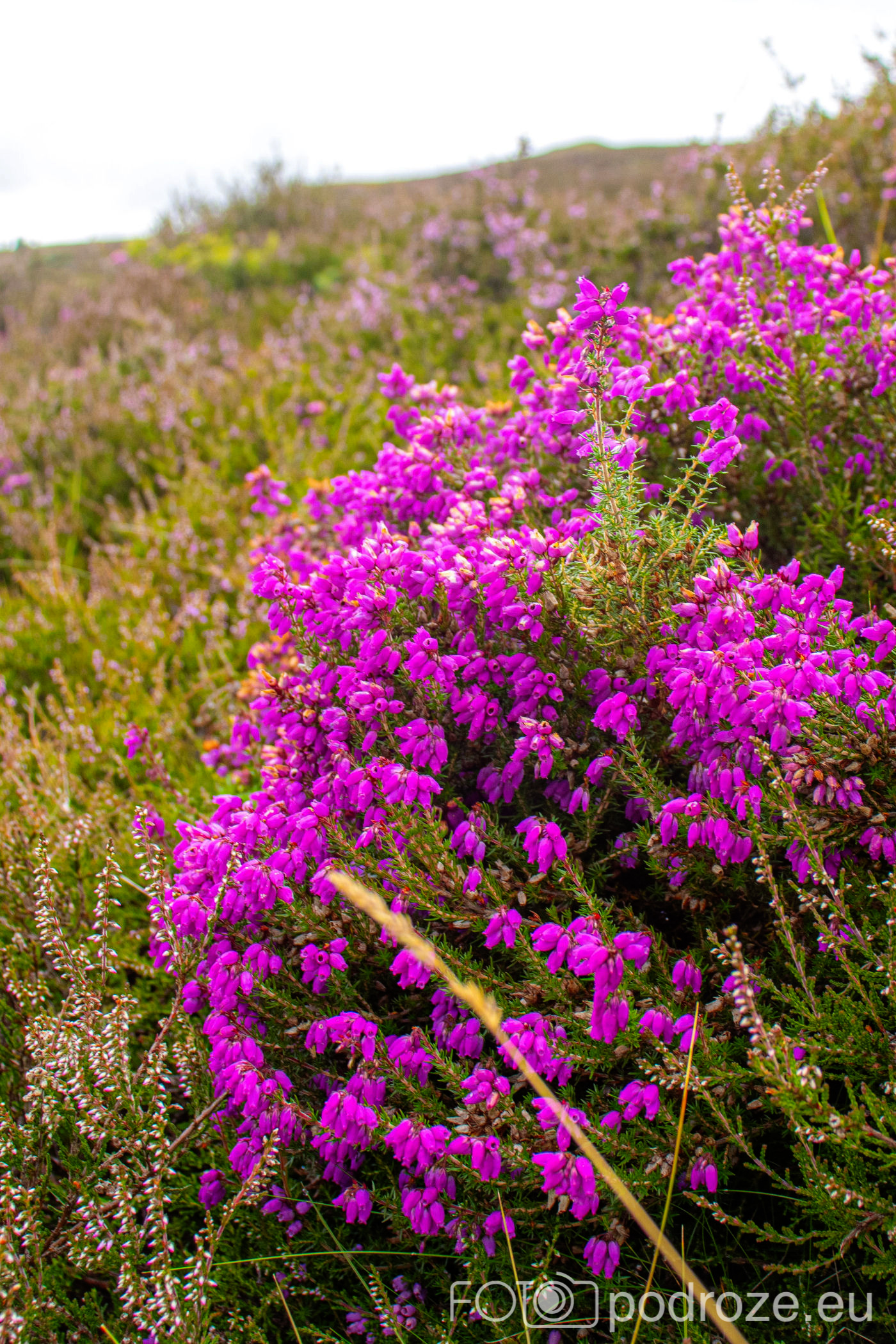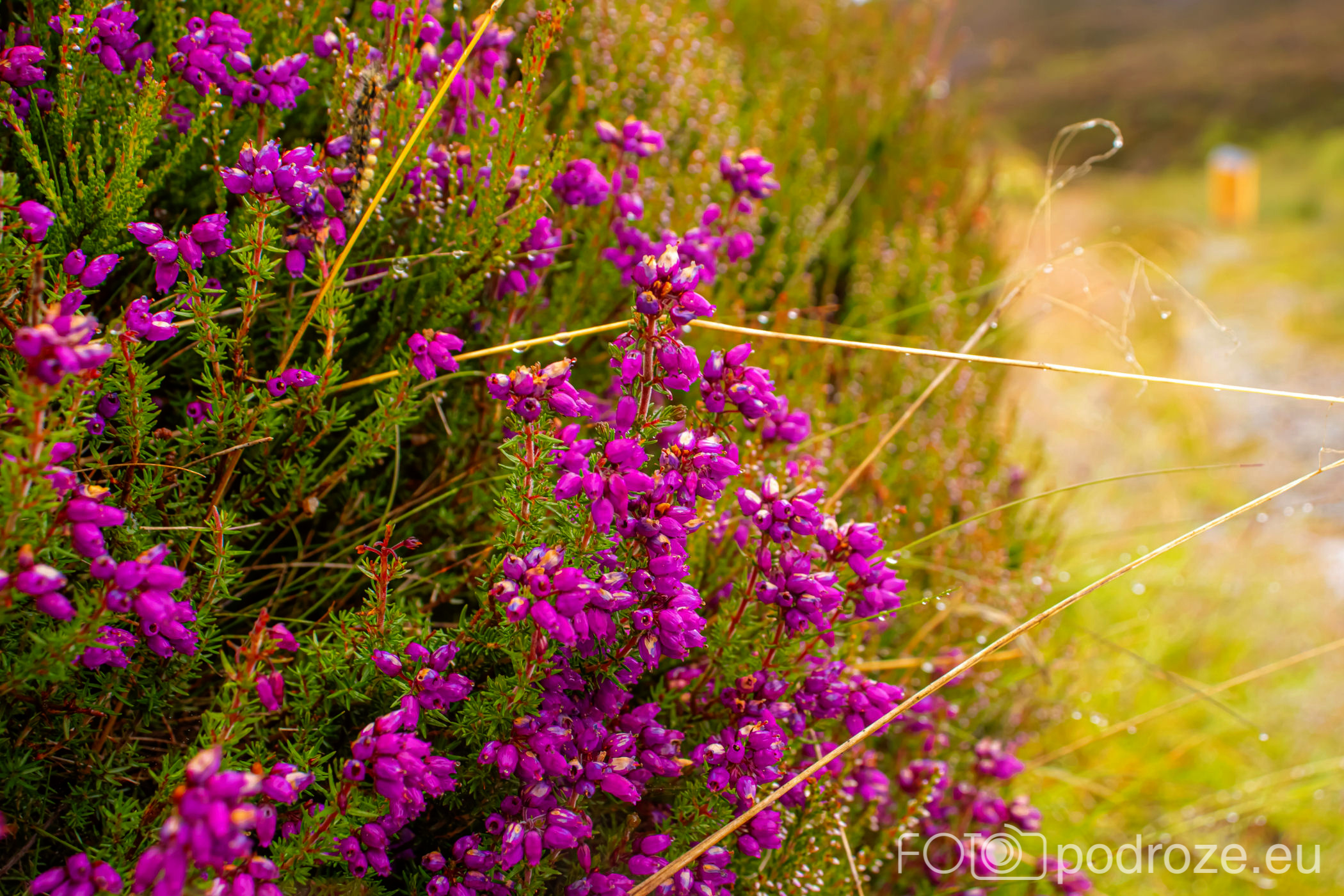 Teraz droga zaczyna się robić na prawdę ciekawa. Kolorowe góry wymalowane różnymi odcieniami traw i wrzosem , prawie całkowicie puste, bo pozbawione na szczęście zabudowy. Tylko gdzieniegdzie kamienne osady.