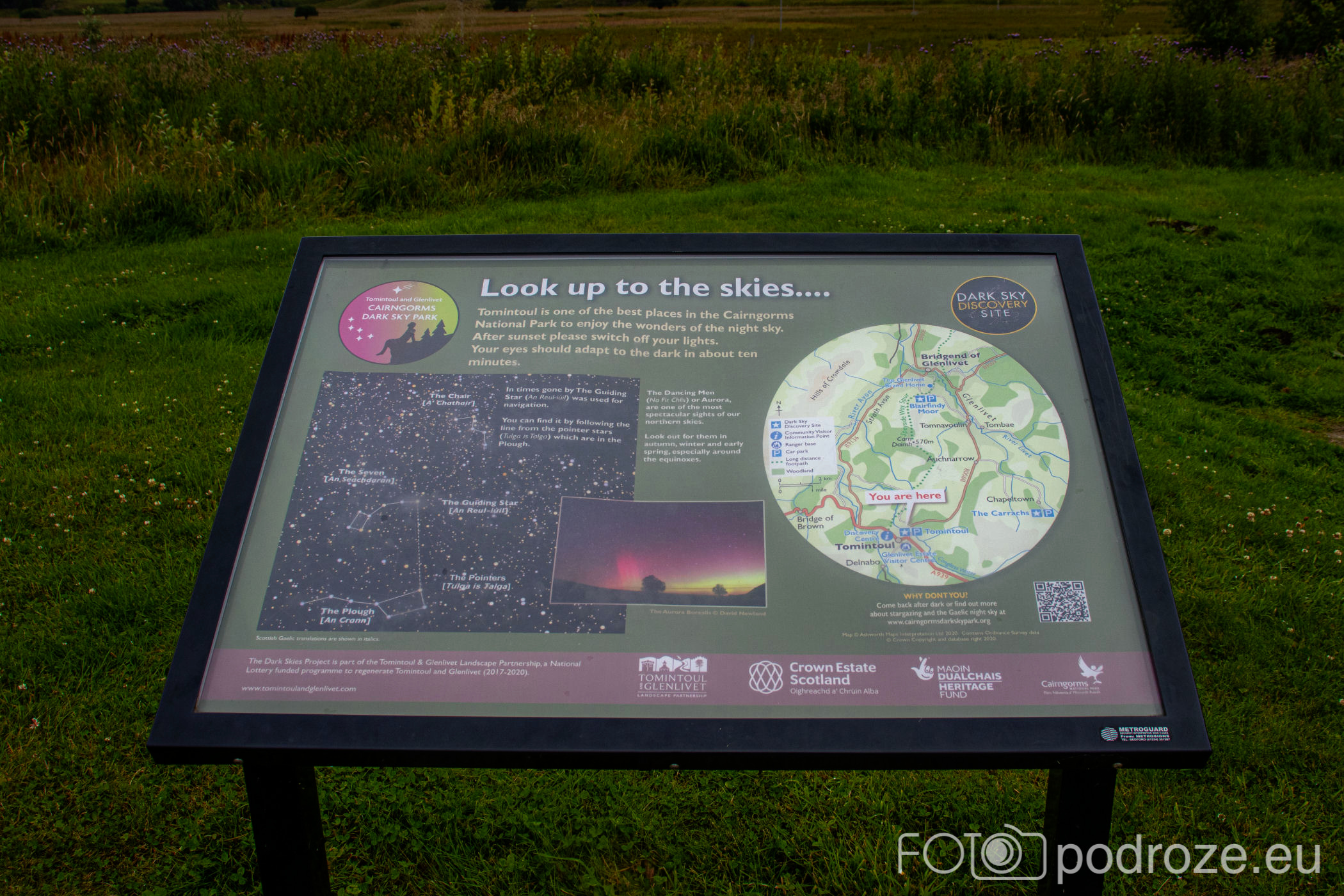 Na mapie znajdziecie to miejsce oznaczone nazwą > Tomintoul Dark Sky Site & Bird Hide . Nazwa przyznam nas zaintrygowała i liczyliśmy na jakieś piękne zdjęcia ptaków. Niestety nie udało nam się wypatrzeć żadnego. Kawałek za parkingiem znajduje się drewniany domek do obserwacji. Miejsce, co dość zaskakujące jest też idealne do obserwowania rozgwieżdżonego nieba, a przy sprzyjającej pogodzie także zorzy polarnej. Grupa astrologów z Cairngorm regularnie organizuje tutaj wydarzenia, w których można uczestniczyć bezpłatnie i poznawać nocne niebo przez teleskopy. Wspaniałe przeżycie dla dorosłych i dzieci. Obserwuj ich stronę internetową, aby zobaczyć nadchodzące wydarzenia.