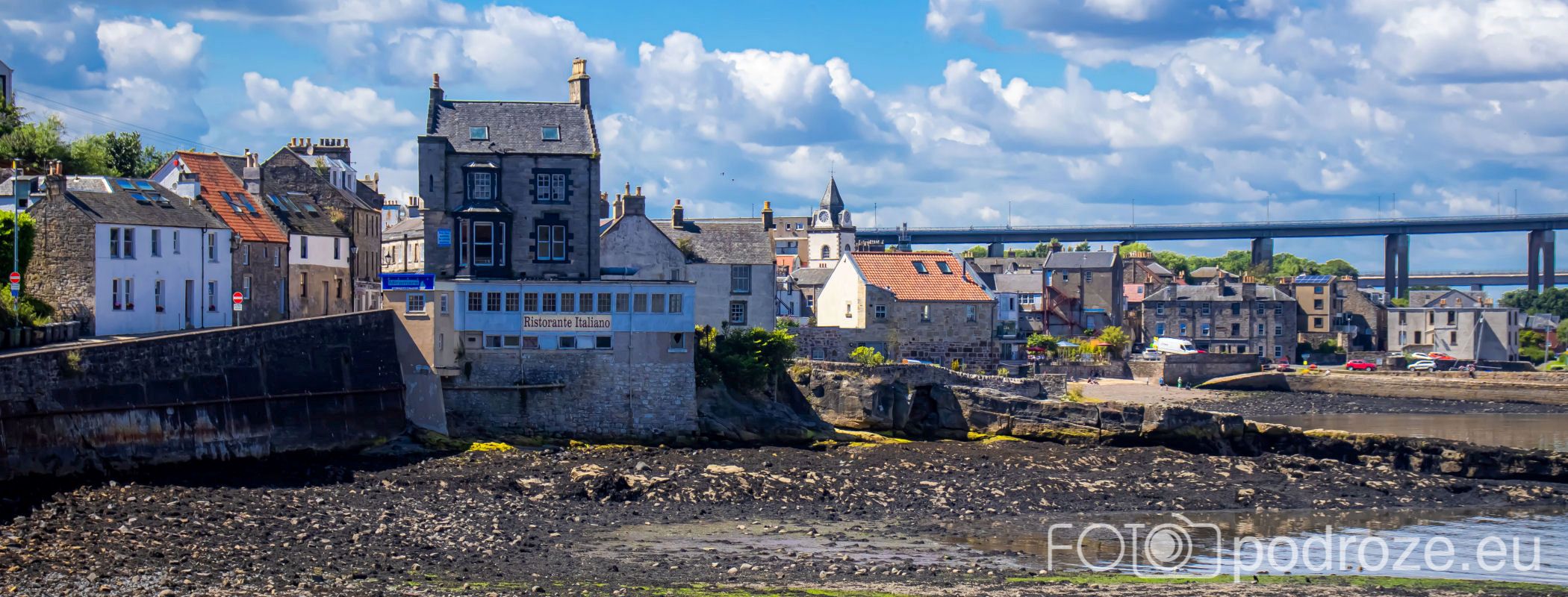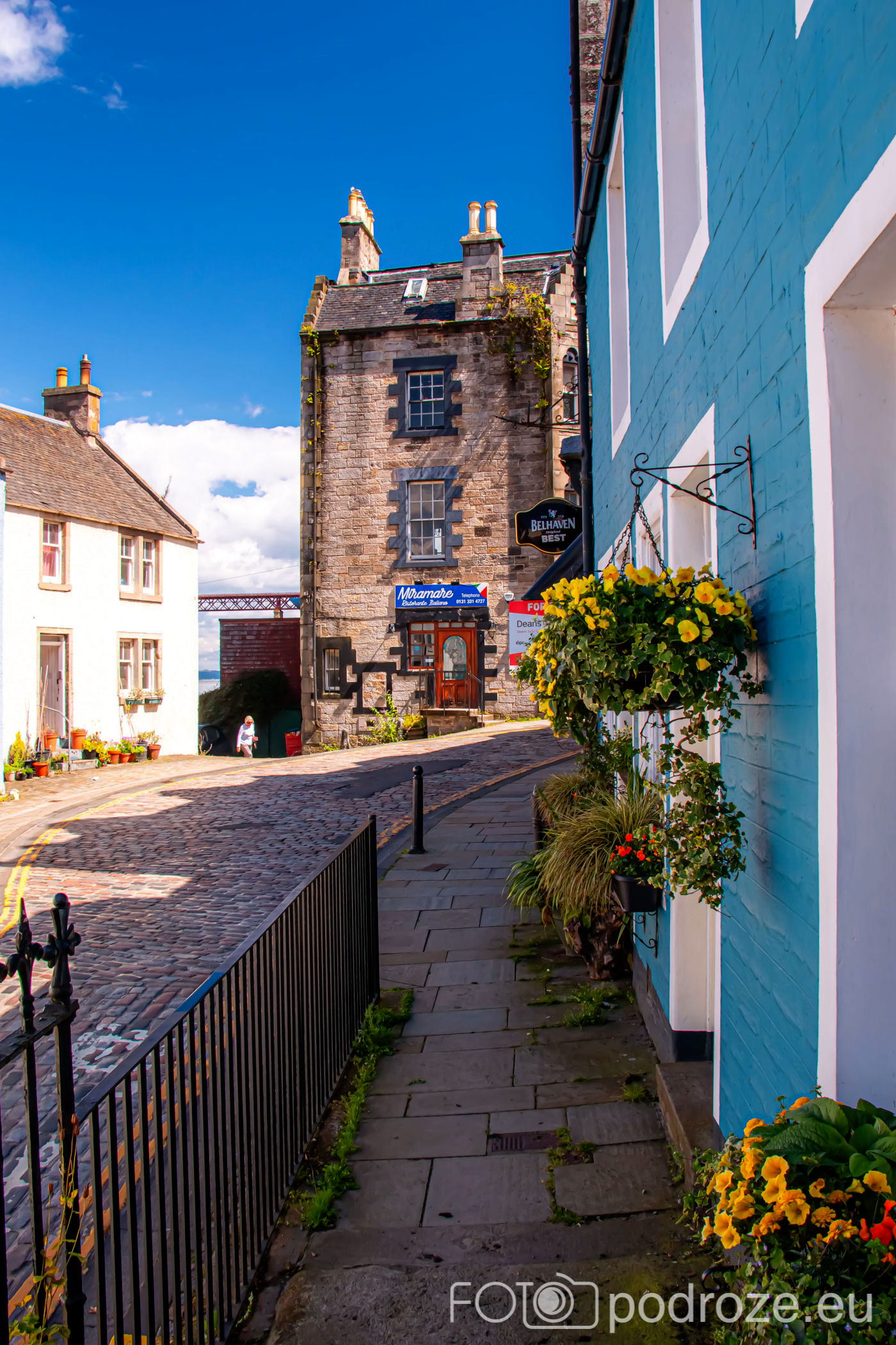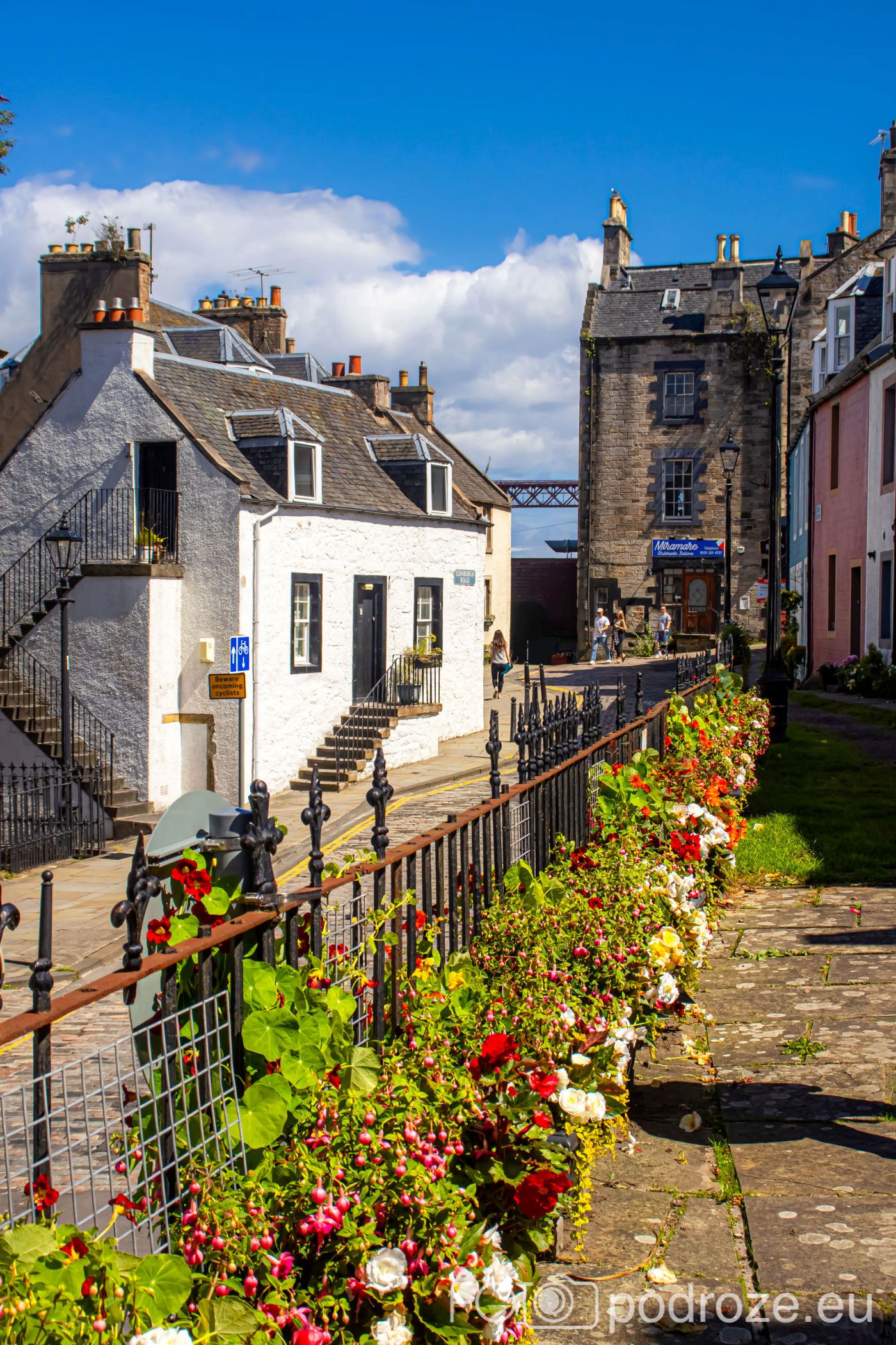 Zanim zabiorę Was na wybrzeże, przejdźmy się uliczkami urokliwego miasteczka Queensferry. Miasto zwane jest inaczej South Queensferry, gdyż położone jest na południowym brzegu zatoki trudno nazwać miastem, bo liczy sobie niecałe 10 tysięcy mieszkańców. Ale niejedno 10-krotnie większe miasto nie może po chwalić taką infrastrukturą jaką znajdziemy tutaj. Uliczki miasteczka są kolorowe, jak z bajki, ale jak widać na zdjęciach, nie ma tu wielu turystów. Ci zazwyczaj odwiedzają pobliski Edynburg lub po prostu przejeżdżają przez zatokę na północ Szkocji jednym z trzech niesamowitych mostów. Na drugim brzegu jest druga część miasteczka – North Queensferry. Ta część miasta nie jest już tak piękna. Z drugiego brzegu widać na brzegu jedynie jakieś ruiny.