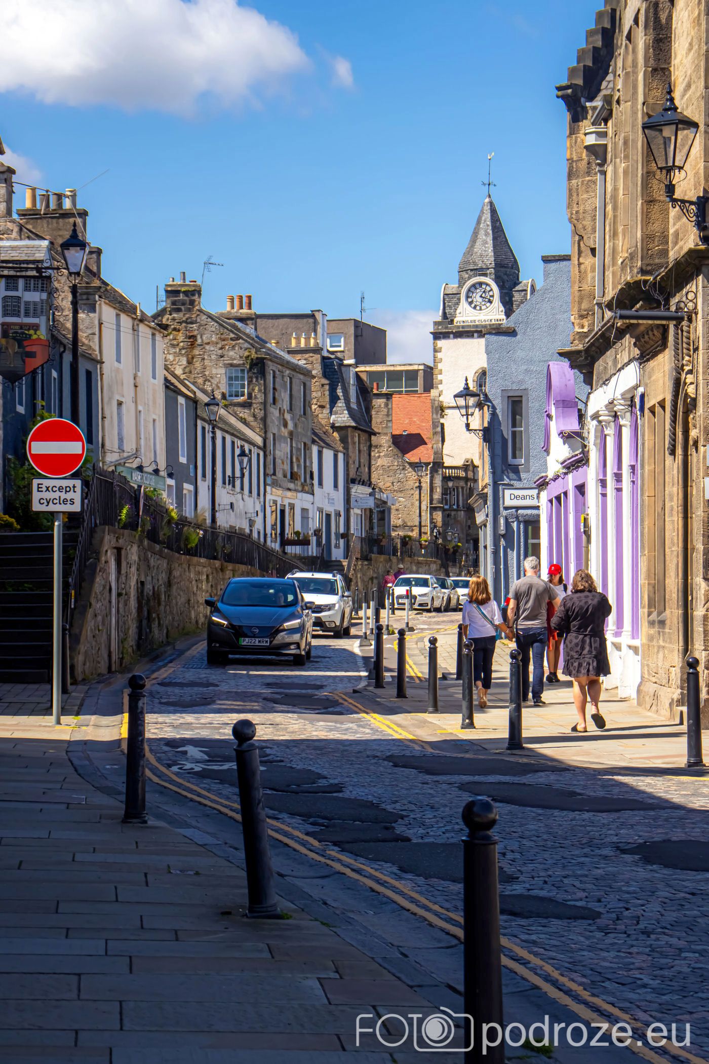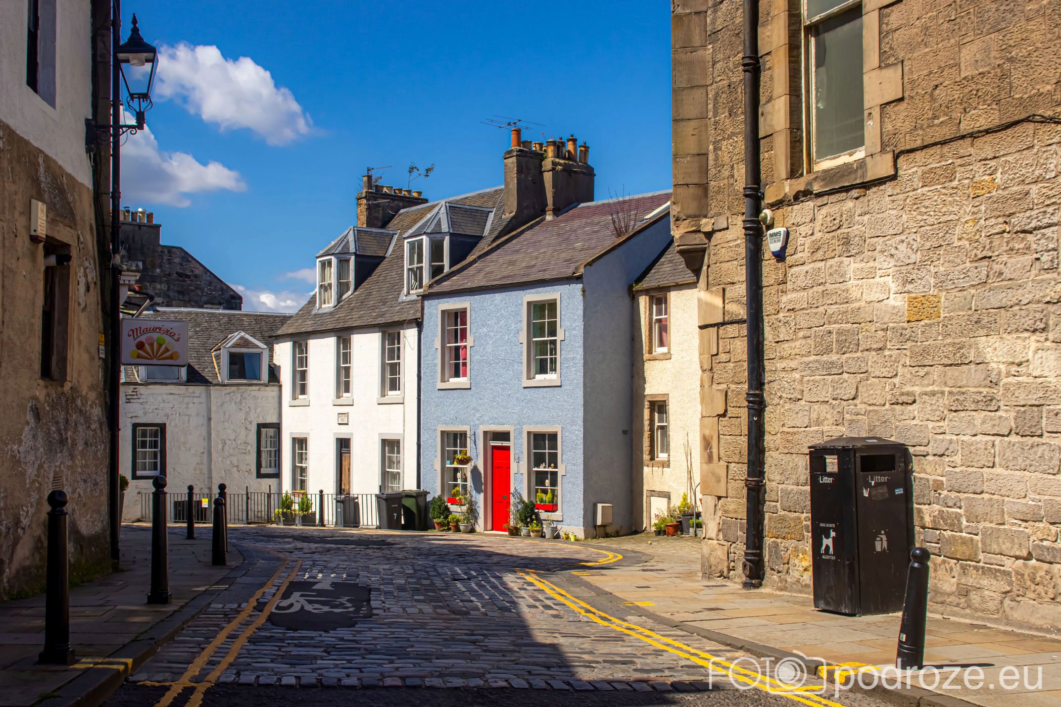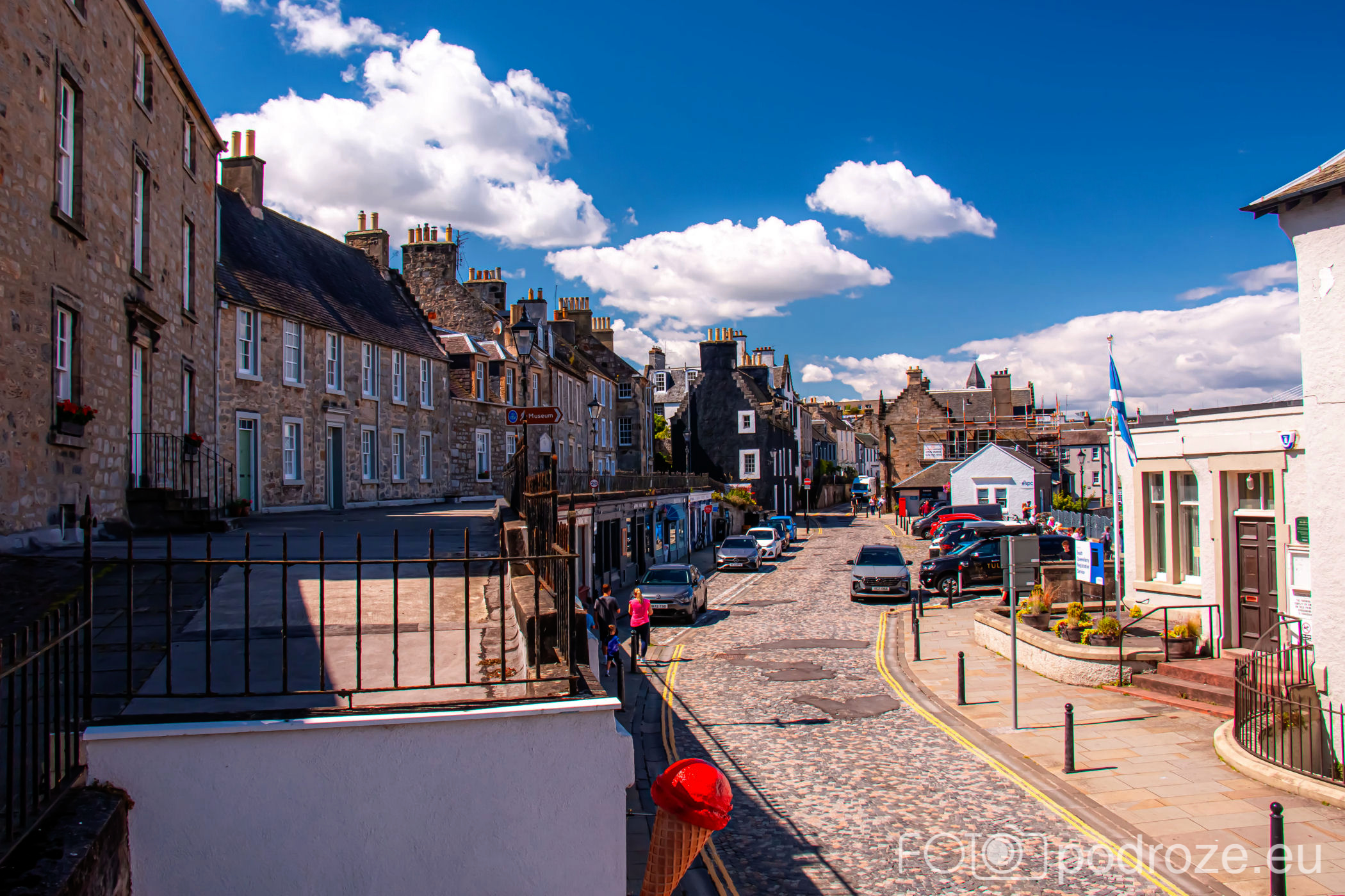 Zanim zabiorę Was na wybrzeże, przejdźmy się uliczkami urokliwego miasteczka Queensferry. Miasto zwane jest inaczej South Queensferry, gdyż położone jest na południowym brzegu zatoki trudno nazwać miastem, bo liczy sobie niecałe 10 tysięcy mieszkańców. Ale niejedno 10-krotnie większe miasto nie może po chwalić taką infrastrukturą jaką znajdziemy tutaj. Uliczki miasteczka są kolorowe, jak z bajki, ale jak widać na zdjęciach, nie ma tu wielu turystów. Ci zazwyczaj odwiedzają pobliski Edynburg lub po prostu przejeżdżają przez zatokę na północ Szkocji jednym z trzech niesamowitych mostów. Na drugim brzegu jest druga część miasteczka – North Queensferry. Ta część miasta nie jest już tak piękna. Z drugiego brzegu widać na brzegu jedynie jakieś ruiny.