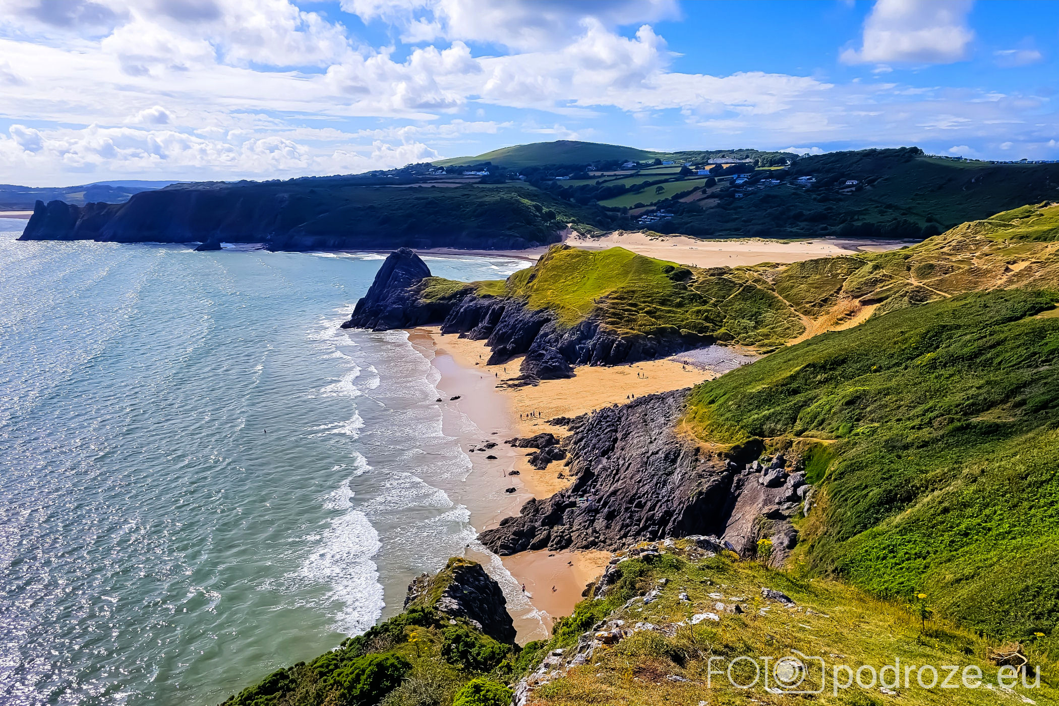 Teraz mamy widok na spektakularną zatokę z trzema charakterystycznymi klifami, otoczoną wydmami i strumieniem wcinającym się w piasek. Nazwa plaży pochodzi od trzech wapiennych klifów, które wystają z piasków, tworząc naturalny łuk. Przez plażę przepływa rzeka Pennard Pill, wcinając się w piaski i tworząc malownicze meandry, zanim wpłynie do Kanału Bristolskiego.