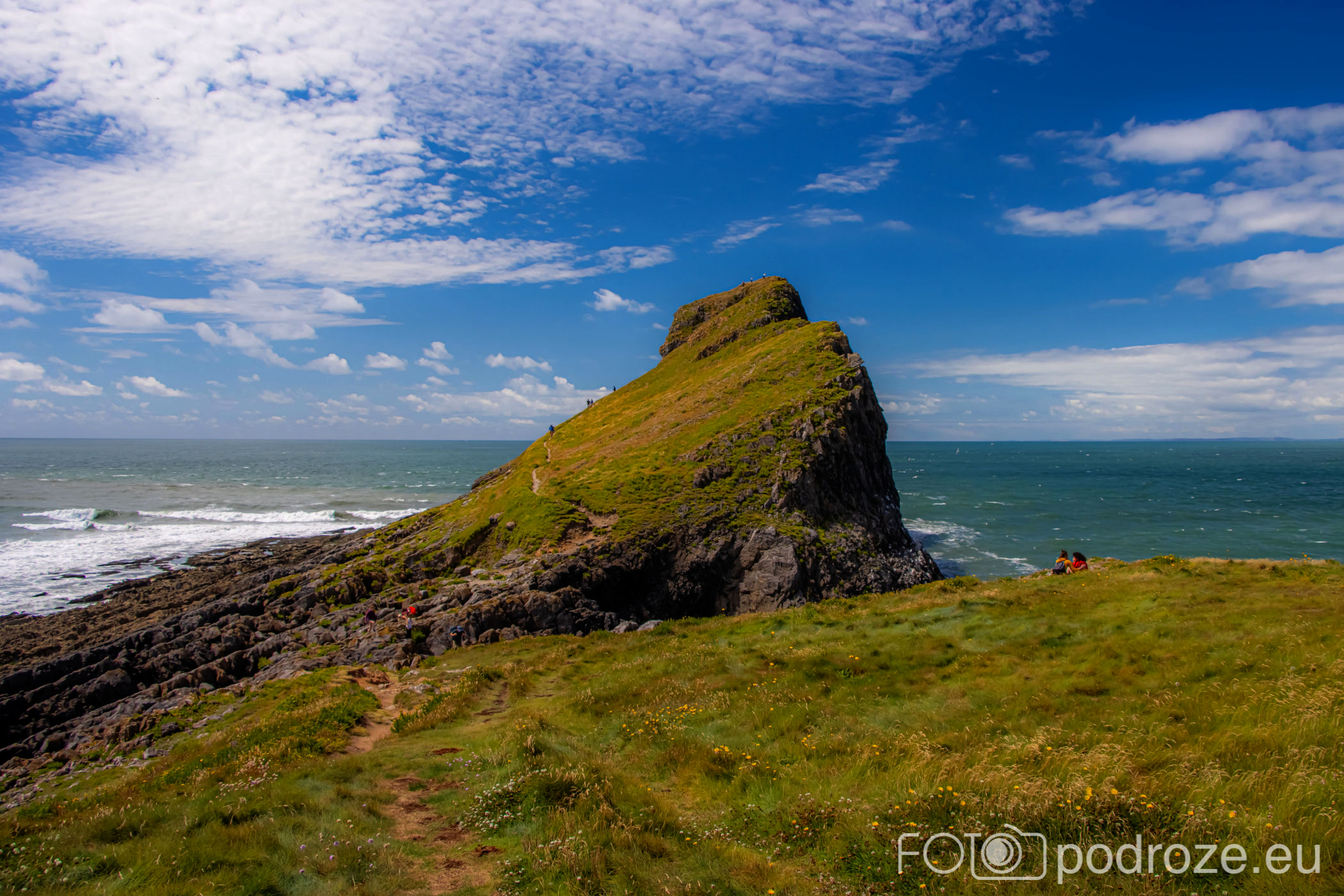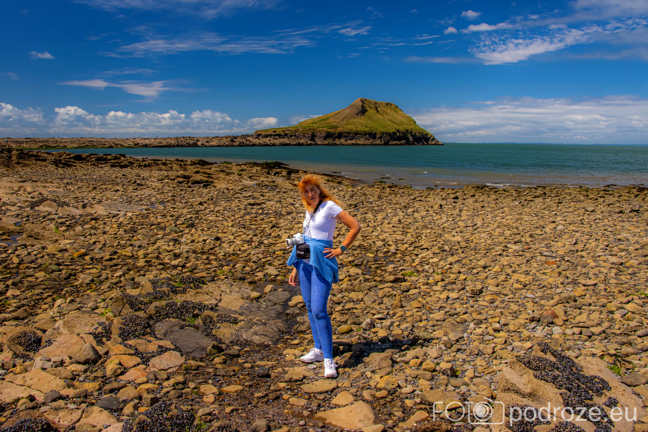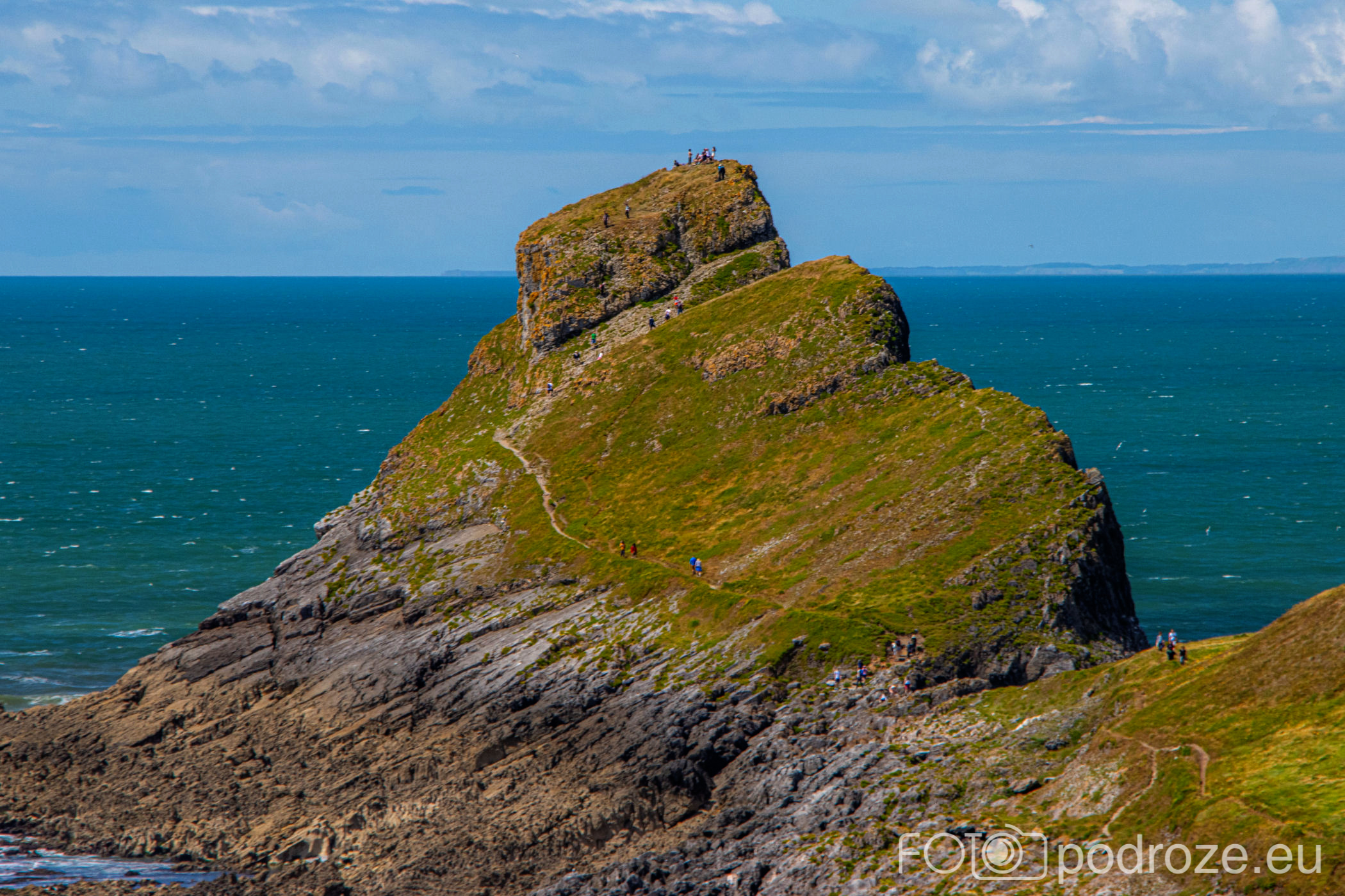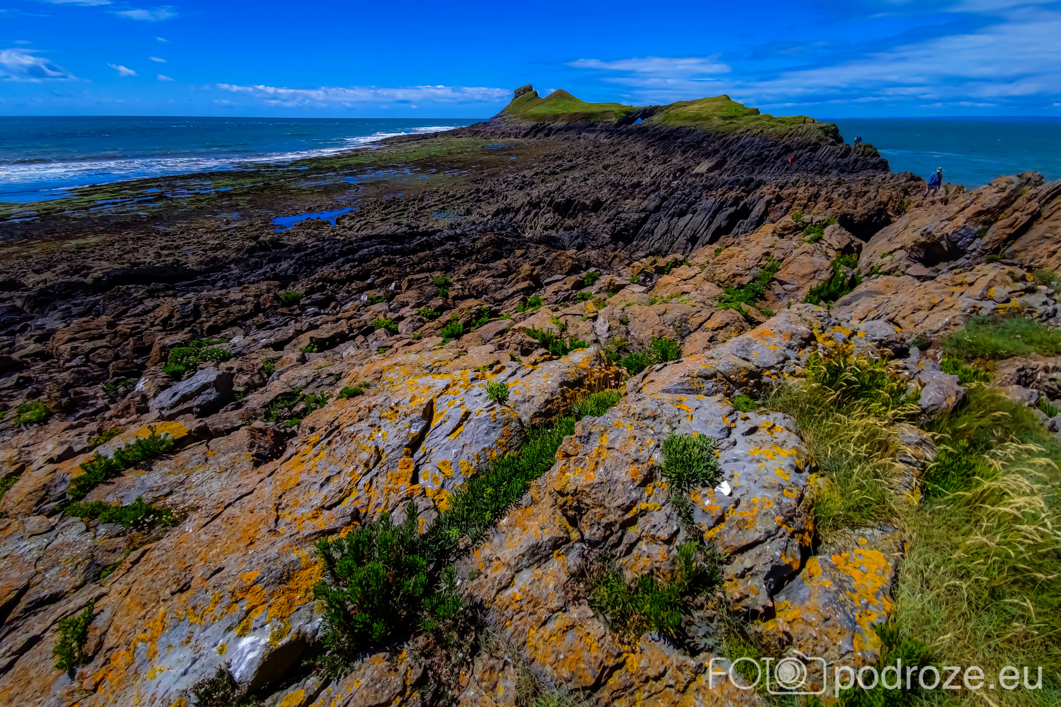 Kiedy dochodzimy do końca trawiastego półwyspu, oczom naszym ukazuje się cel naszej wędrówki. Worm’s Head to spektakularna formacja skalna, której nazwa pochodzi od staro-nordyckiego słowa „Wurm,” co oznacza węża lub smoka, ponieważ kształtem przypomina morskiego smoka lub węża wylegującego się na wodach Kanału Bristolskiego. Wyspa połączona z lądem wąską mierzeją. Tu mamy okazję obejrzeć skały we wszystkich kolorach, od bieli po czerwień i szarość przykrytą czarnymi muszlami.