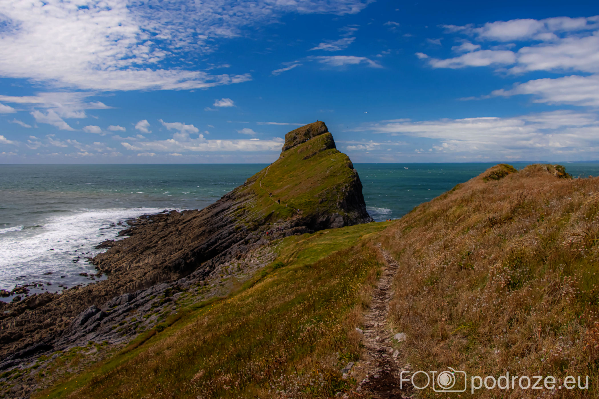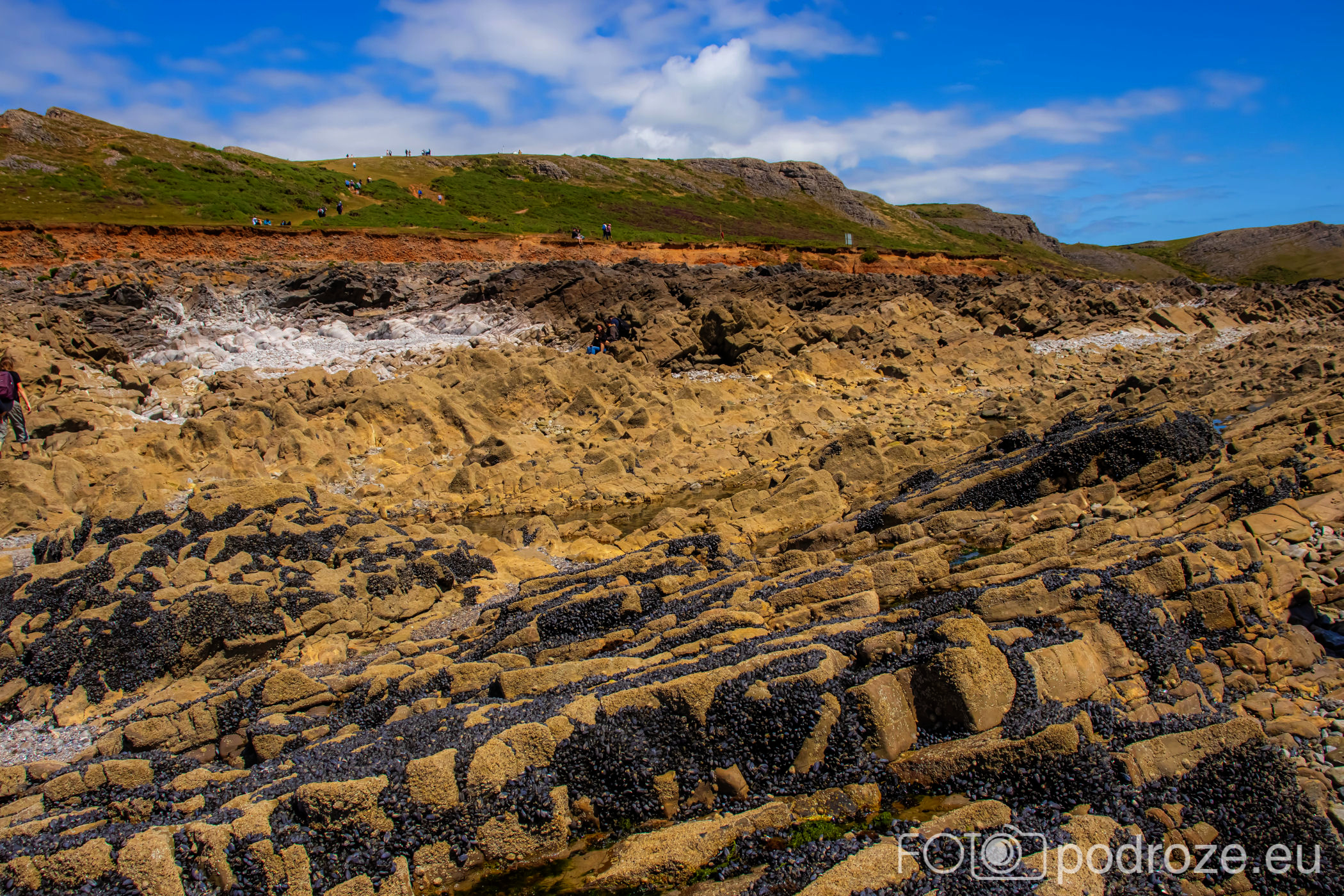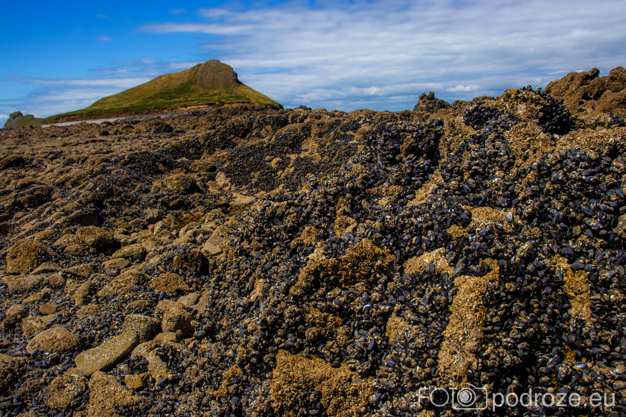 Kiedy dochodzimy do końca trawiastego półwyspu, oczom naszym ukazuje się cel naszej wędrówki. Worm’s Head to spektakularna formacja skalna, której nazwa pochodzi od staro-nordyckiego słowa „Wurm,” co oznacza węża lub smoka, ponieważ kształtem przypomina morskiego smoka lub węża wylegującego się na wodach Kanału Bristolskiego. Wyspa połączona z lądem wąską mierzeją. Tu mamy okazję obejrzeć skały we wszystkich kolorach, od bieli po czerwień i szarość przykrytą czarnymi muszlami.
