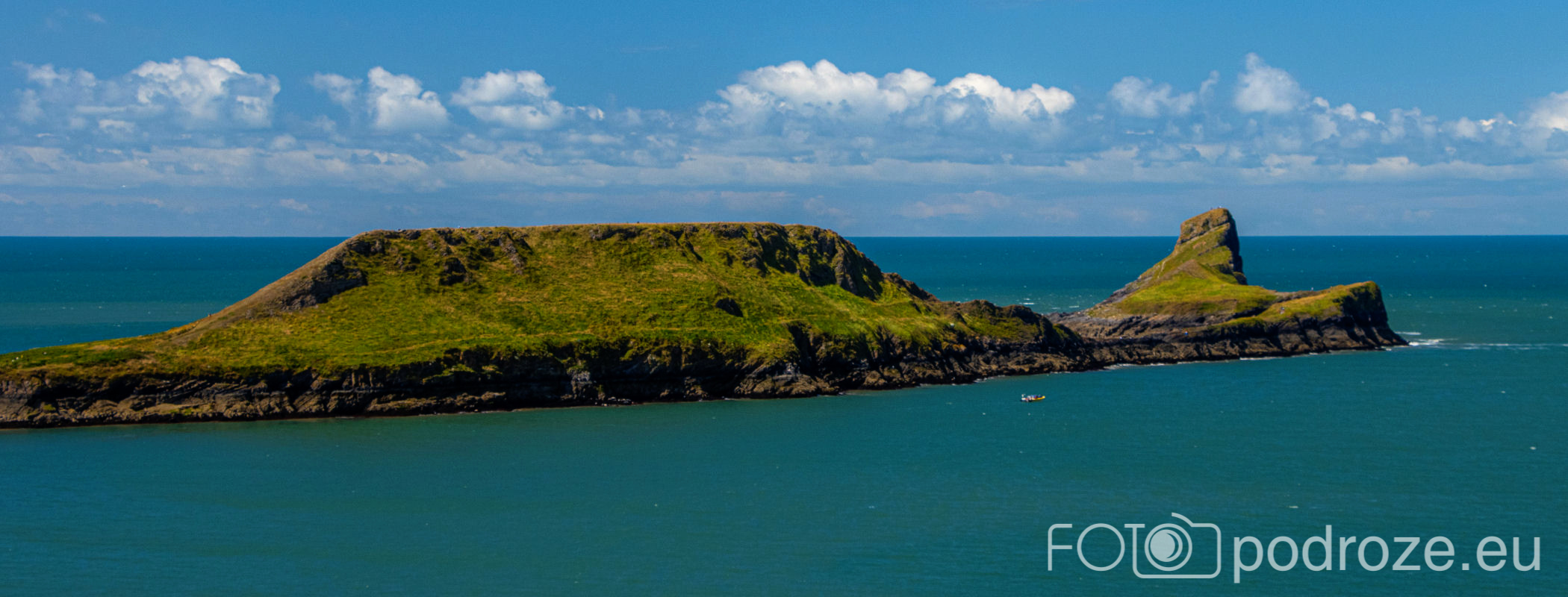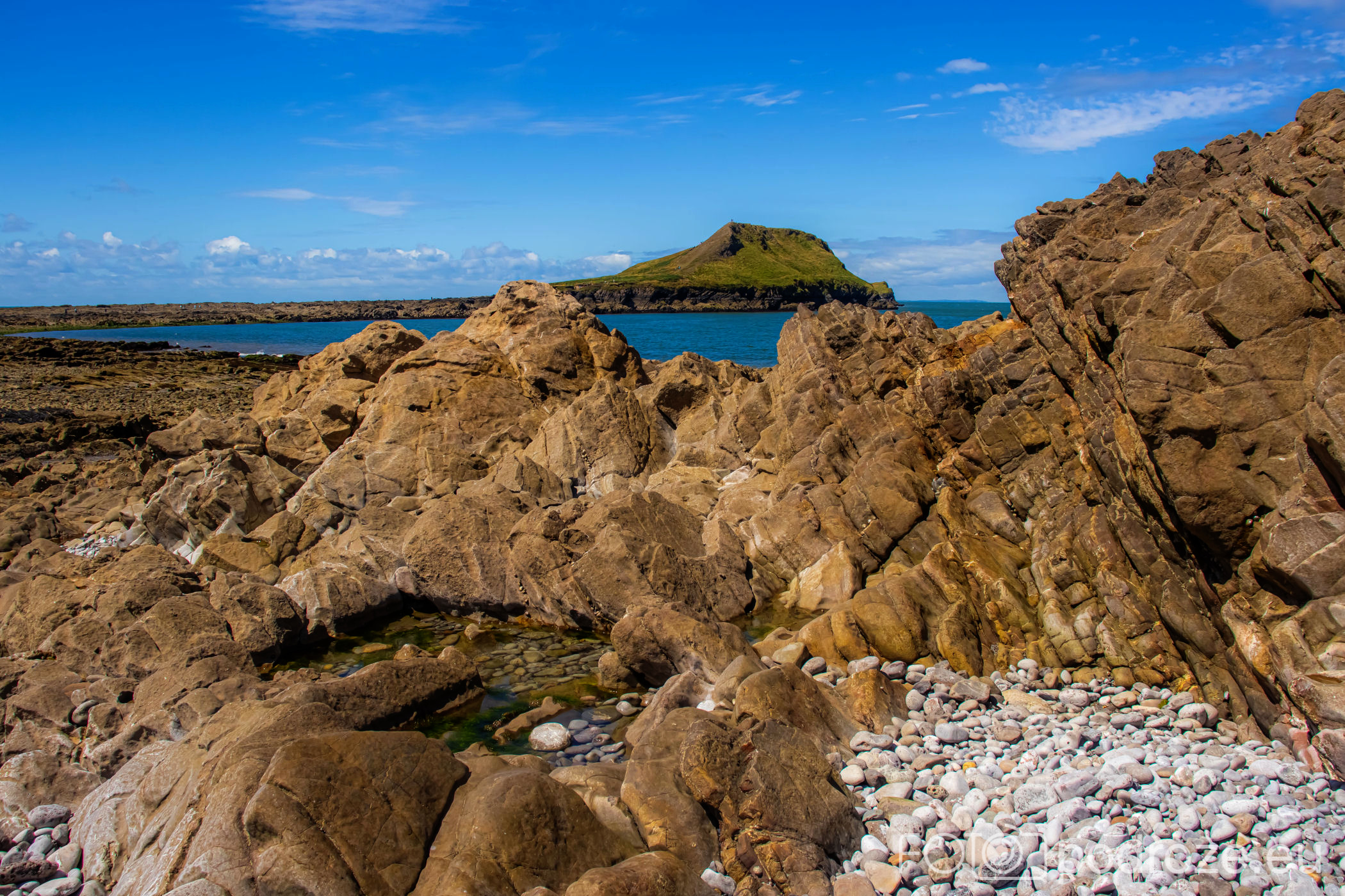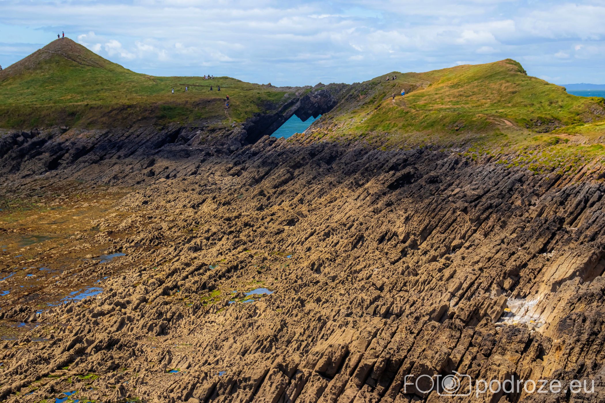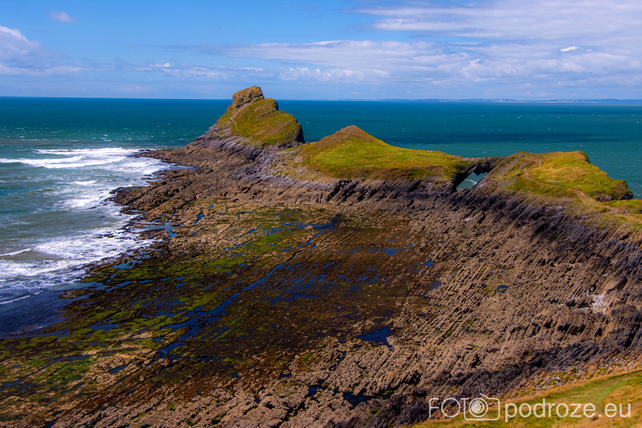 Kiedy dochodzimy do końca trawiastego półwyspu, oczom naszym ukazuje się cel naszej wędrówki. Worm’s Head to spektakularna formacja skalna, której nazwa pochodzi od staro-nordyckiego słowa „Wurm,” co oznacza węża lub smoka, ponieważ kształtem przypomina morskiego smoka lub węża wylegującego się na wodach Kanału Bristolskiego. Wyspa połączona z lądem wąską mierzeją. Tu mamy okazję obejrzeć skały we wszystkich kolorach, od bieli po czerwień i szarość przykrytą czarnymi muszlami.