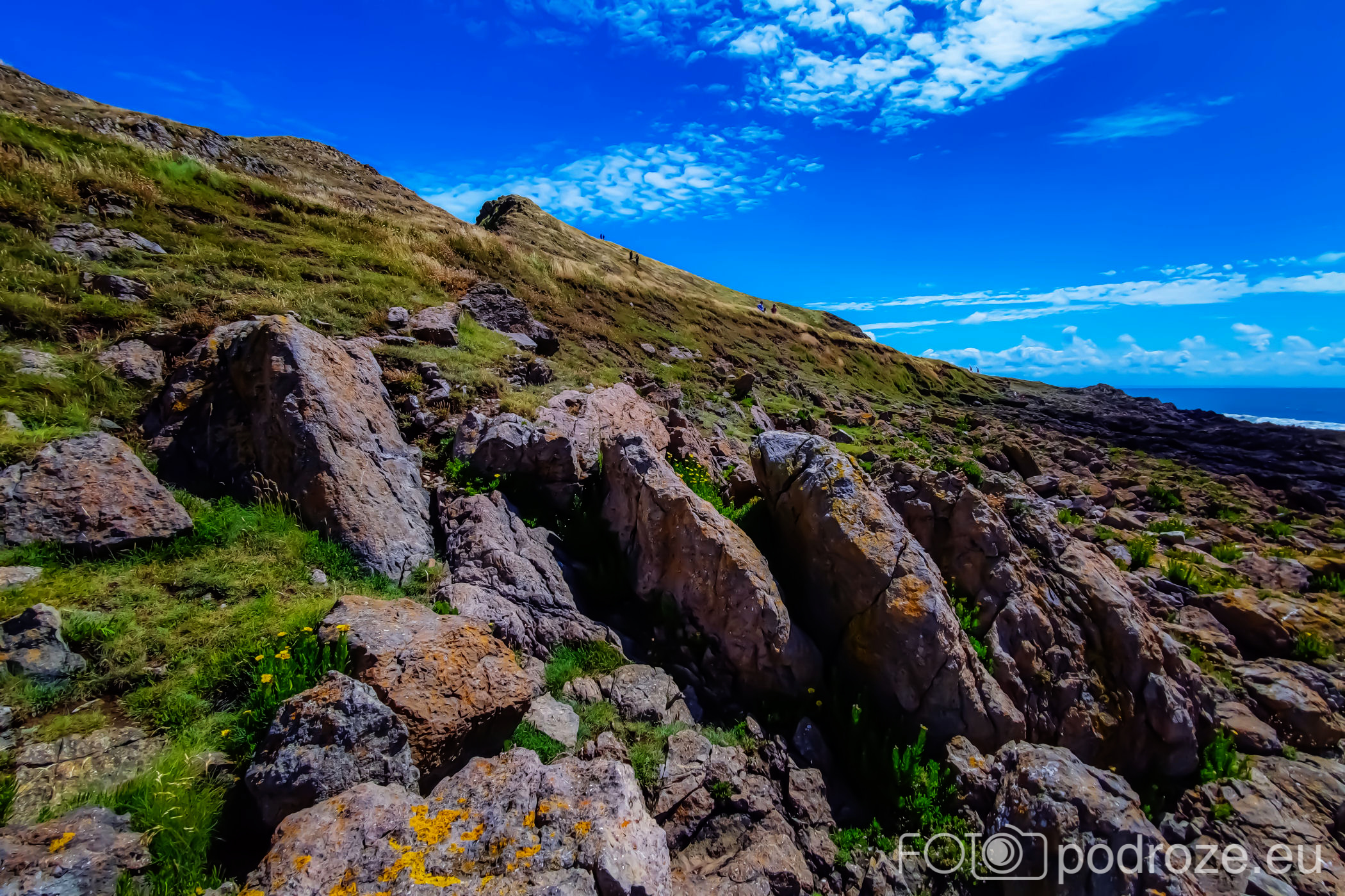 Środkowy odcinek wyspy, nieco bardziej płaski. Za to zdecydowanie nieprzyjemny do przejścia. Bardzo ostre skały i trudności w postawieniu stóp, tak, aby ich nie skręcić. Idą w ruch wszystkie cztery kończyny i trzeba mieć cały czas skupioną uwagę. Ja niestety mam poranione dłonie i obite nogi po wyprawie na SNOWDON . Na szczęście mąż idzie dalej i dzięki temu mogę Wam pokazać i opowiedzieć o cały szlaku aż do jego końca.