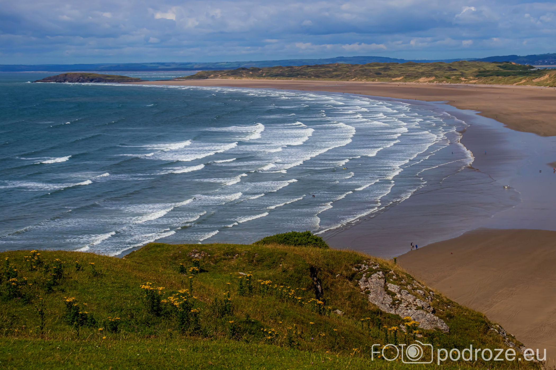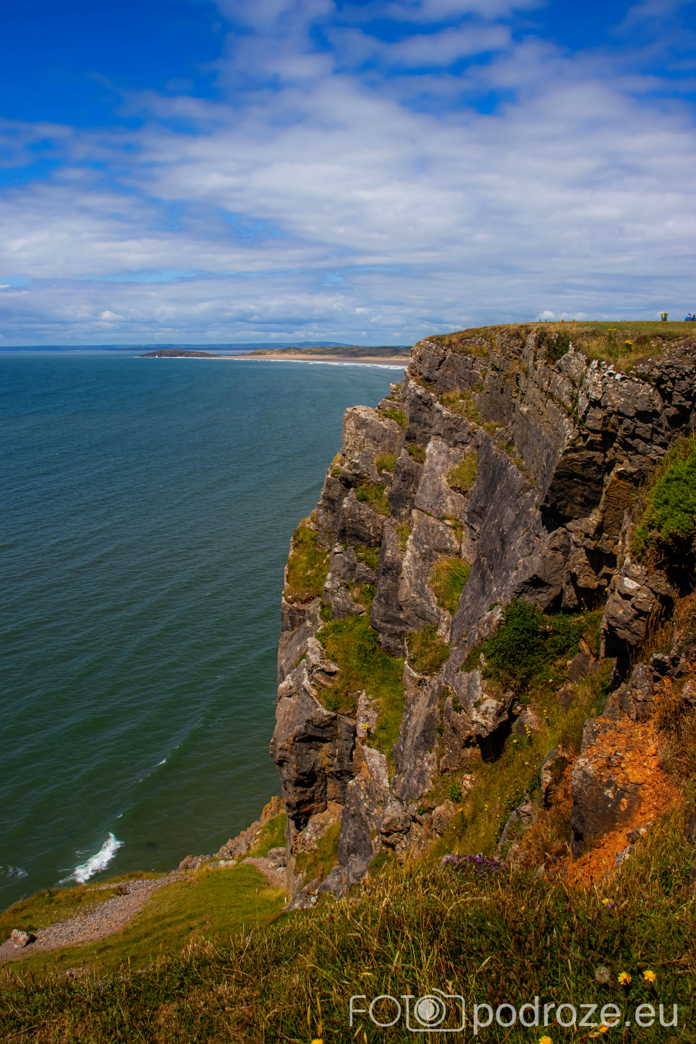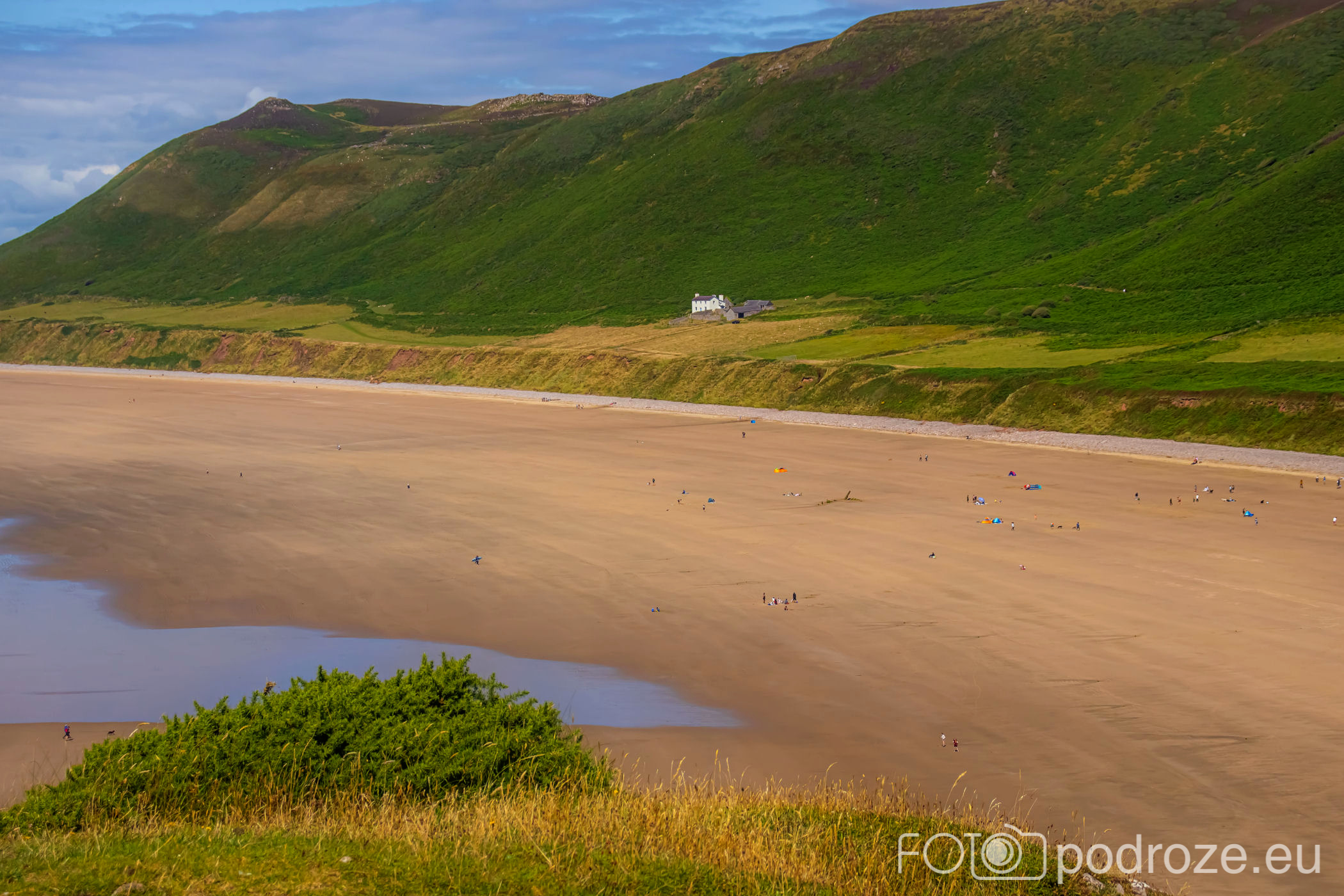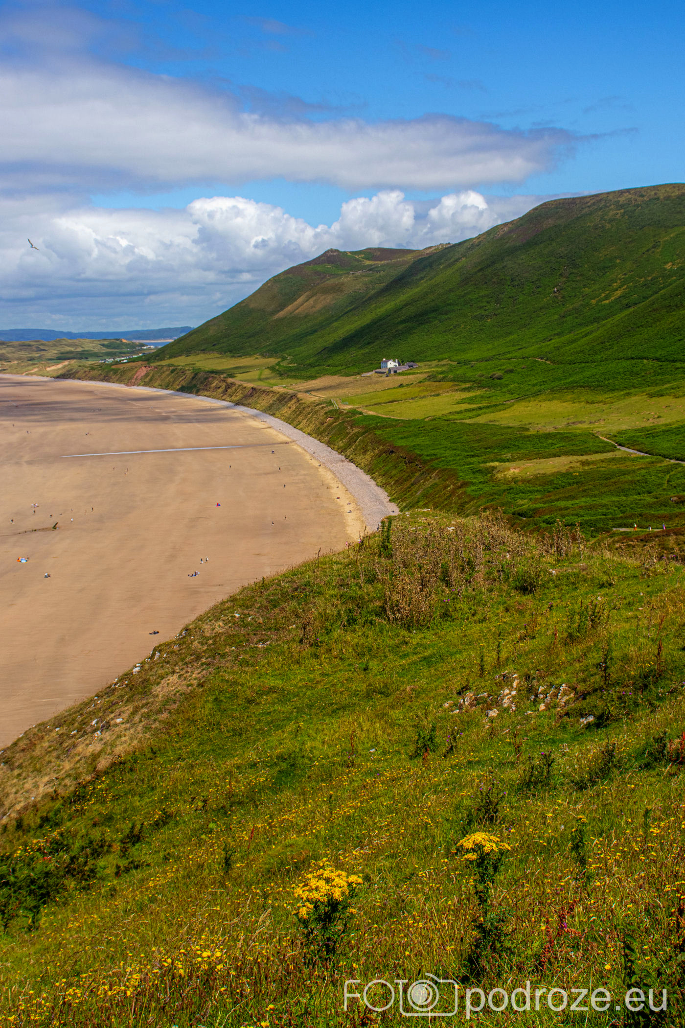 Rhossili Bay na którą patrzymy teraz z góry z klifów jest jedną z najpiękniejszych plaż w Wielkiej Brytanii, rozciągająca się długości na 5 km złotego piasku. Na plaży spoczywa wrak norweskiego statku Helvetia , który osiadł na mieliźnie w 1887 roku. Widziany z góry wygląda jak małe czółenko.