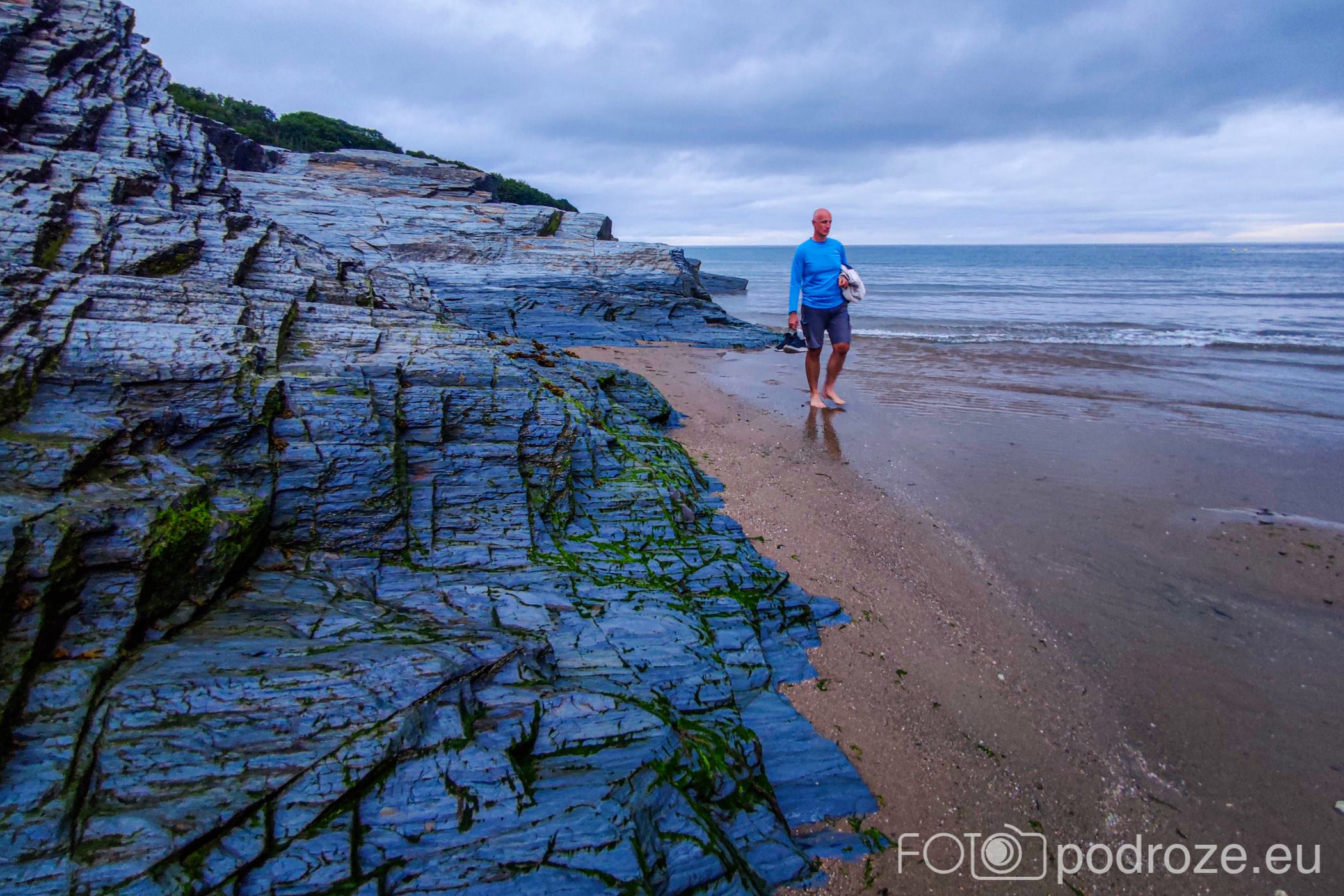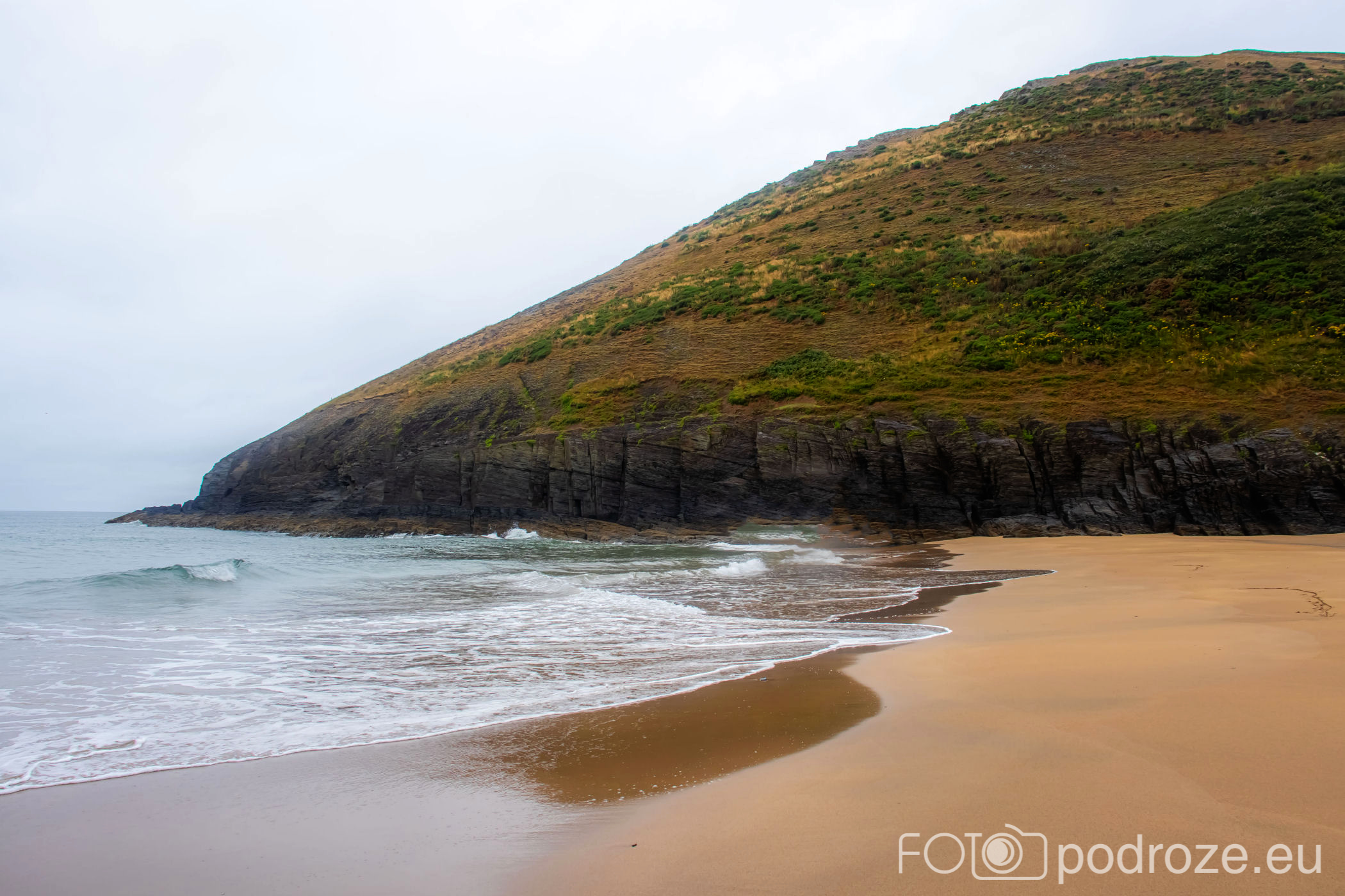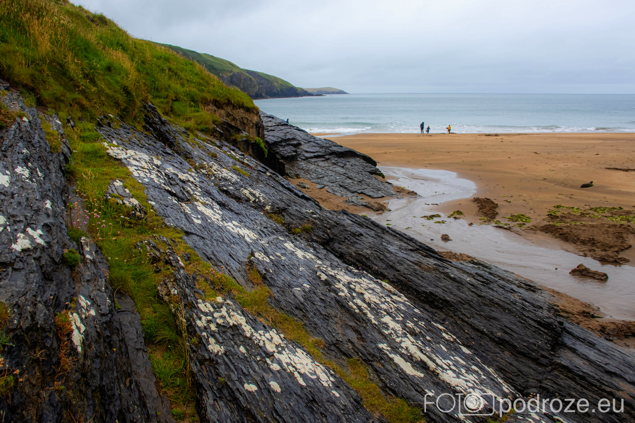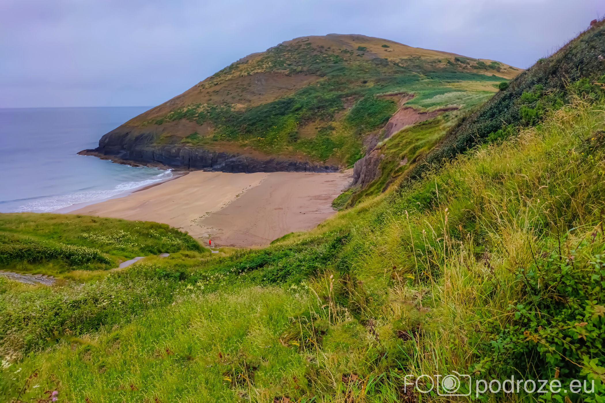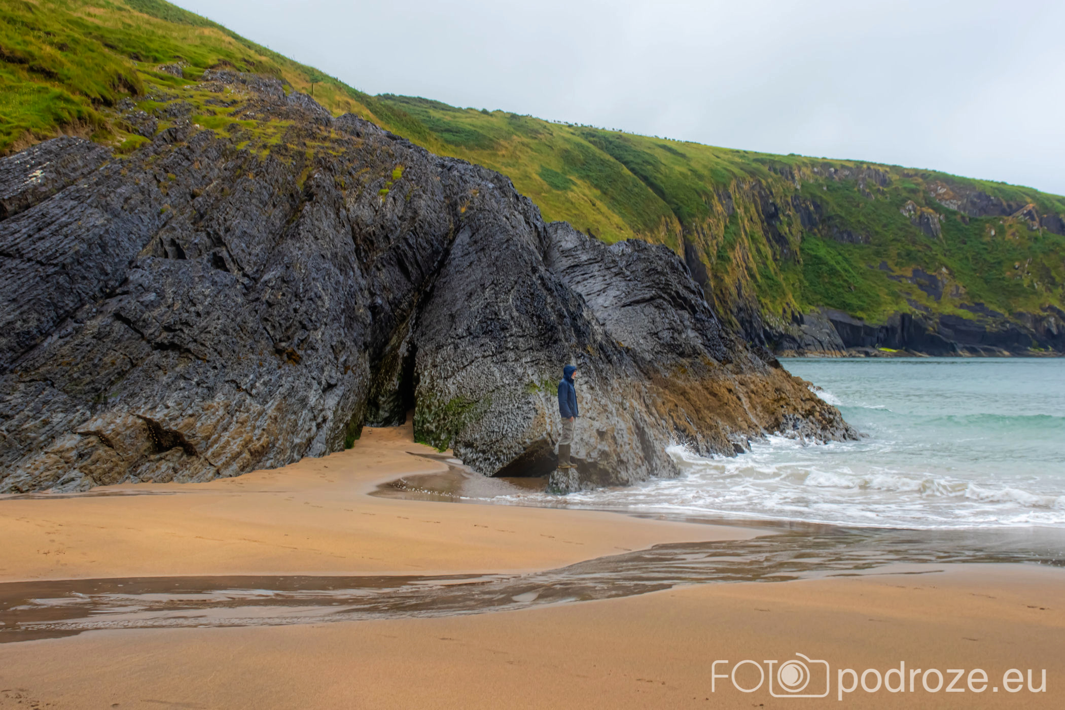 Ostatnie z miejsc w tej części wybrzeża jakie odwiedzamy to plaża Mwnt. tego dnia akurat towarzyszy nam deszcz więc nie jesteśmy w stanie obejrzeć całego uroku tego miejsca. Parking znajduje się na górze przy małej kapliczce – Holy Cross Church, do plaży należy więc zejść po schodach . Wzdłuż nich spływa sobie mały wodospadzik.
