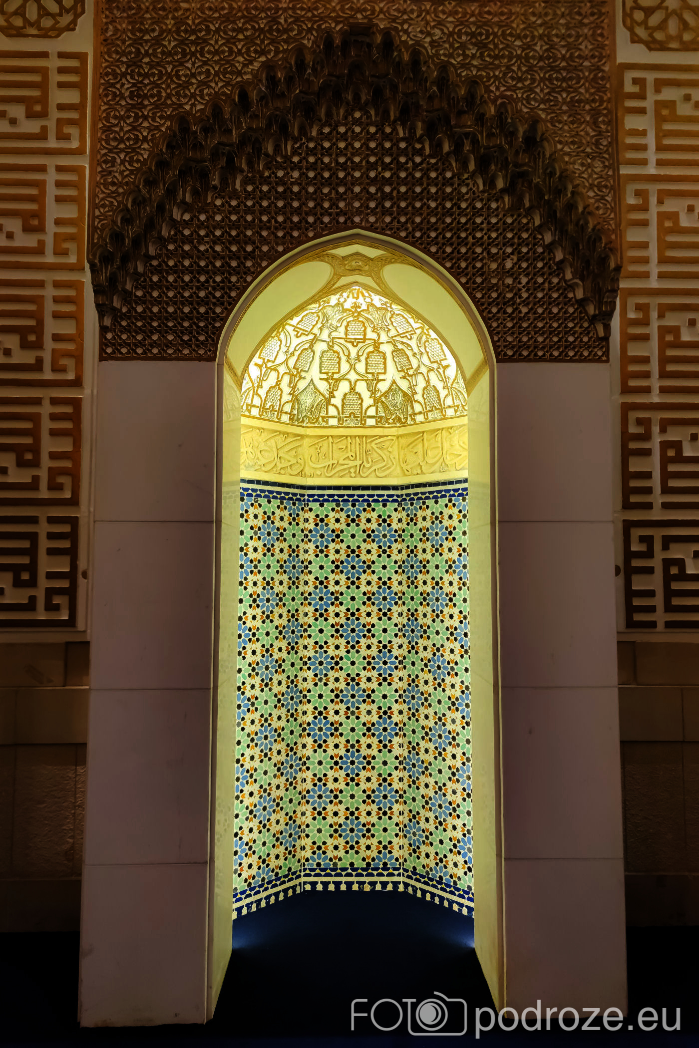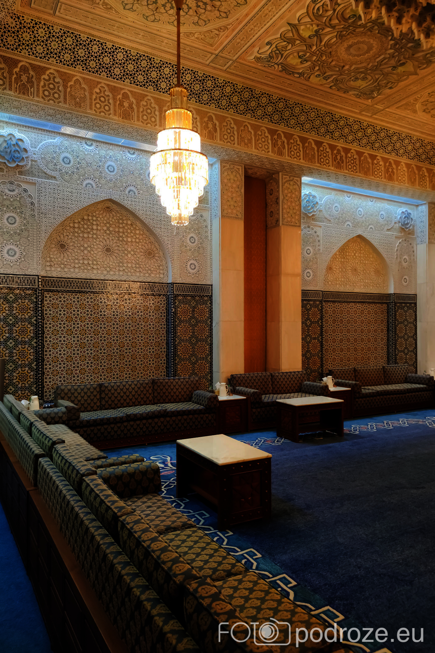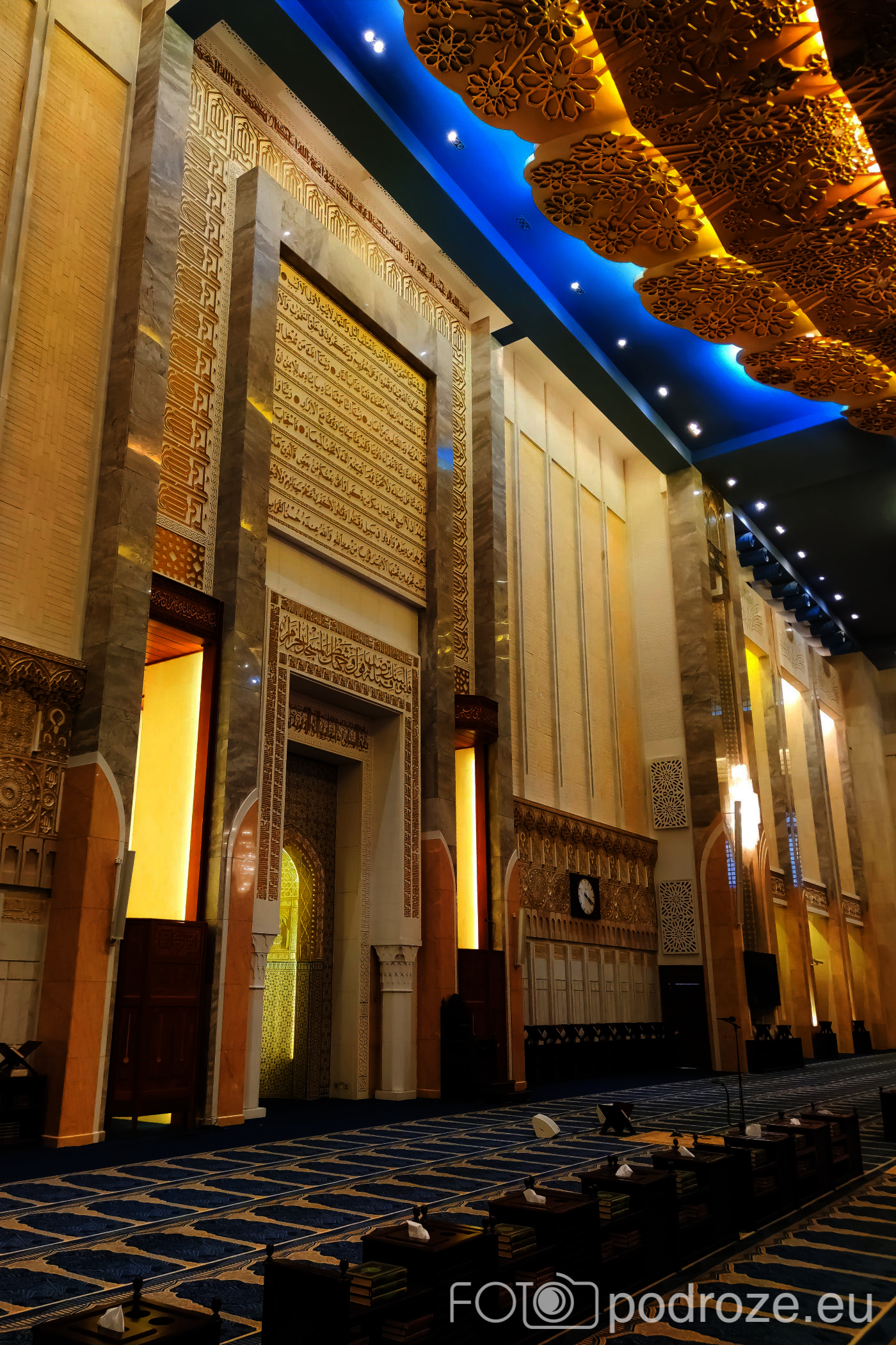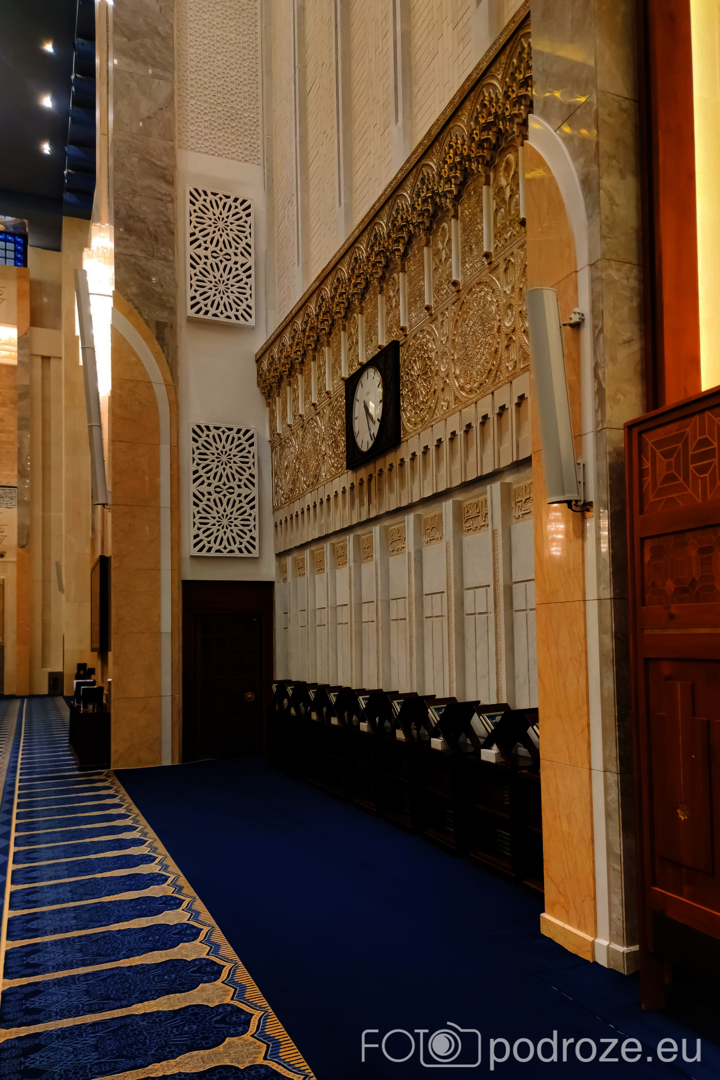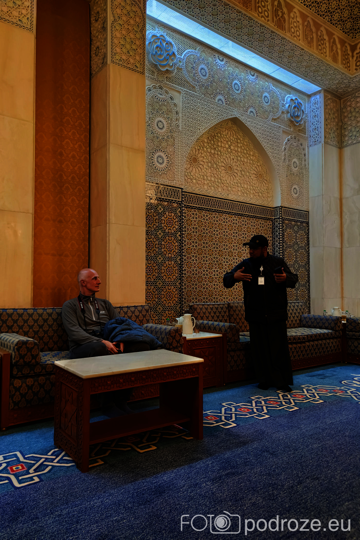 Wnętrze robi niesamowite wrażenie, zarówno kolorystyka, fantastyczne podświetlenie, jak i detale, którym się przyglądamy z bliska. A rzeźbiony jest tu każdy fragment ścian. Przewodnik pozwala wejść na podwyższenie z którego Imam wygłasza modły. Przy okazji zwraca naszą uwagę na ogromny, mięciutki, tkany ręcznie dywan, którego wzór wyznacza wiernym miejsca do stania.