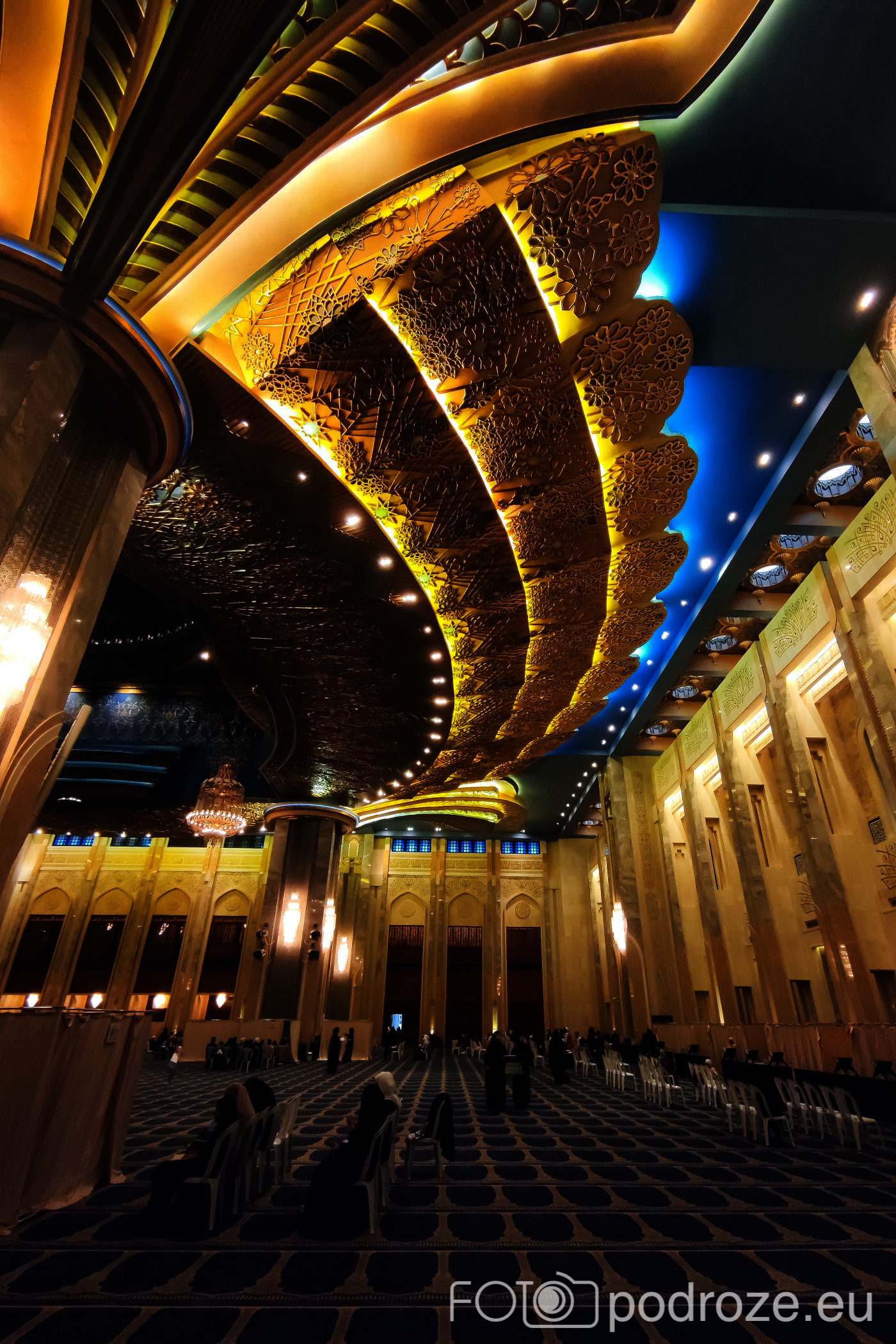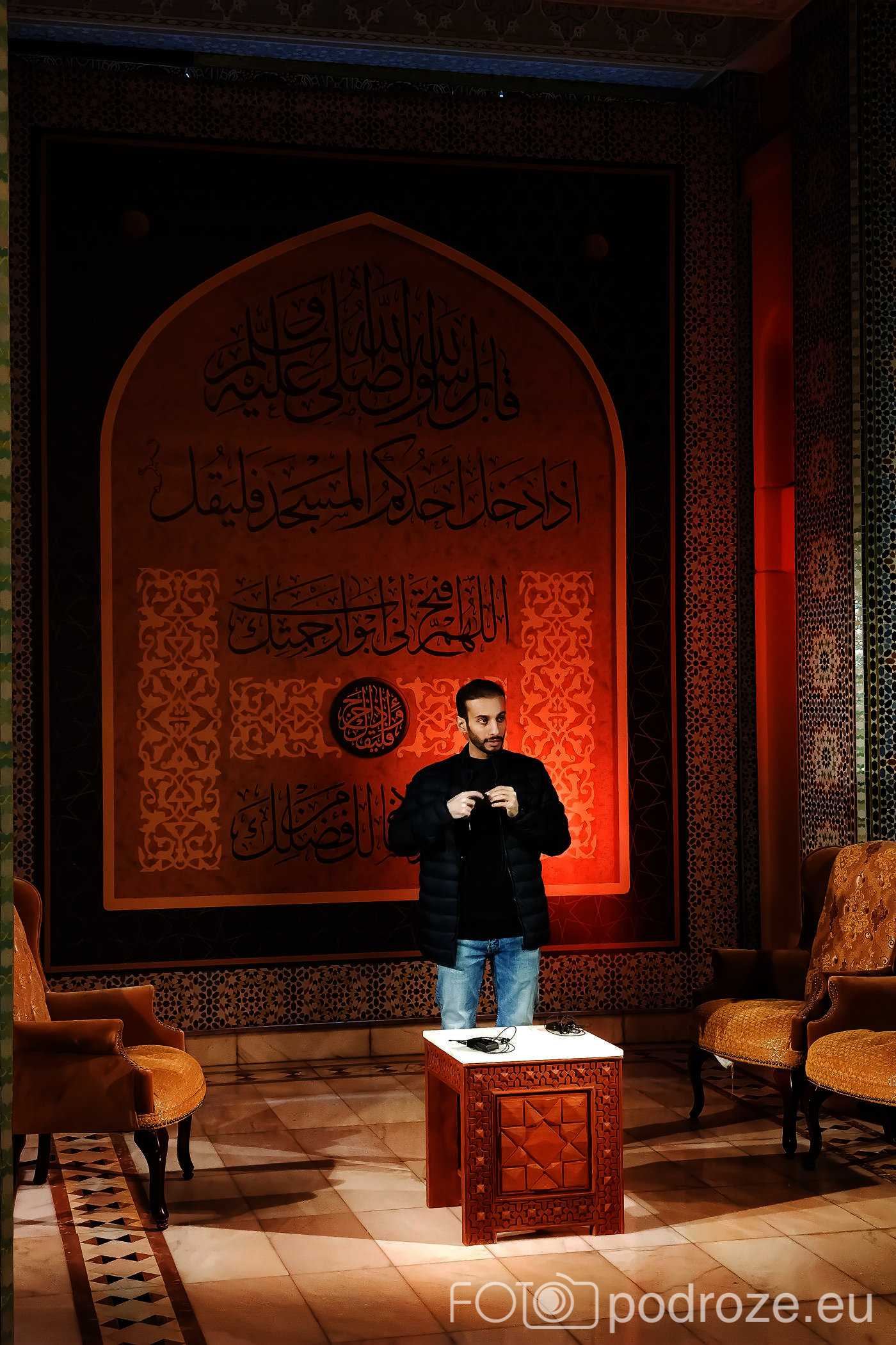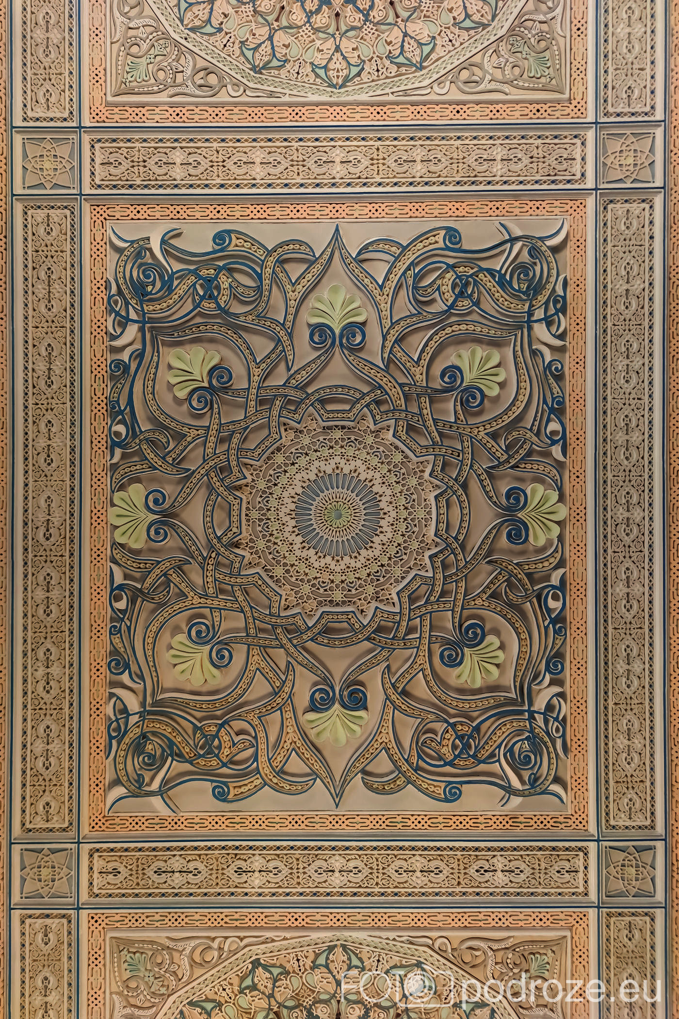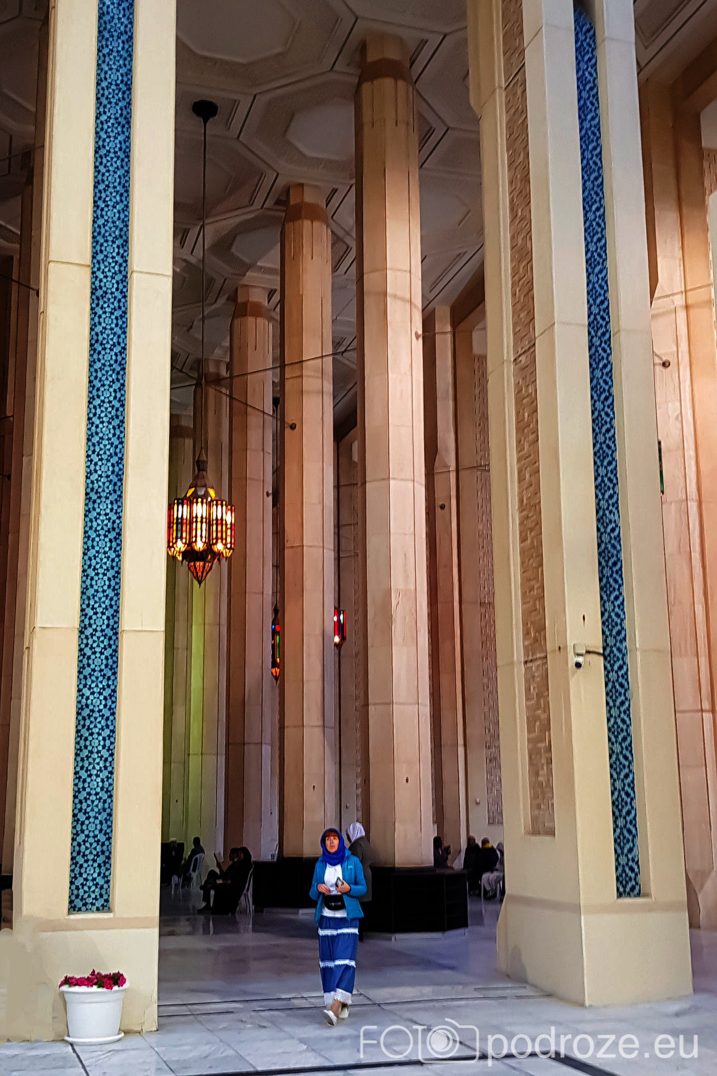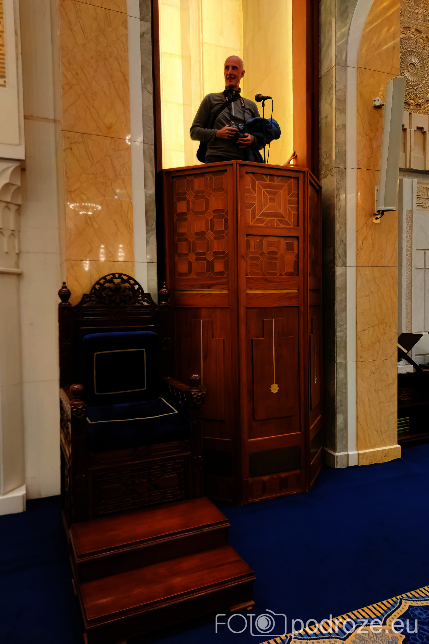 Wnętrze robi niesamowite wrażenie, zarówno kolorystyka, fantastyczne podświetlenie, jak i detale, którym się przyglądamy z bliska. A rzeźbiony jest tu każdy fragment ścian. Przewodnik pozwala wejść na podwyższenie z którego Imam wygłasza modły. Przy okazji zwraca naszą uwagę na ogromny, mięciutki, tkany ręcznie dywan, którego wzór wyznacza wiernym miejsca do stania.