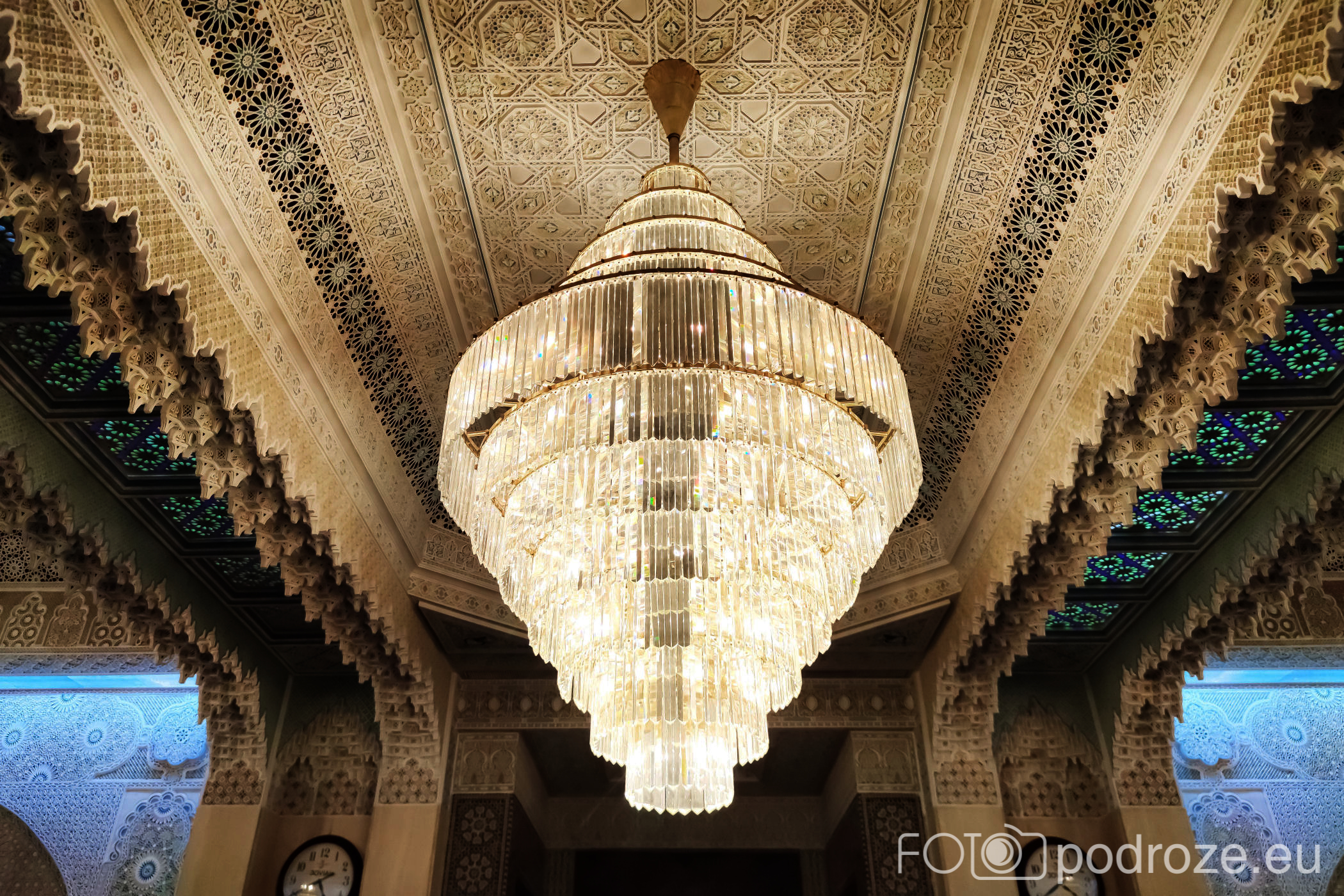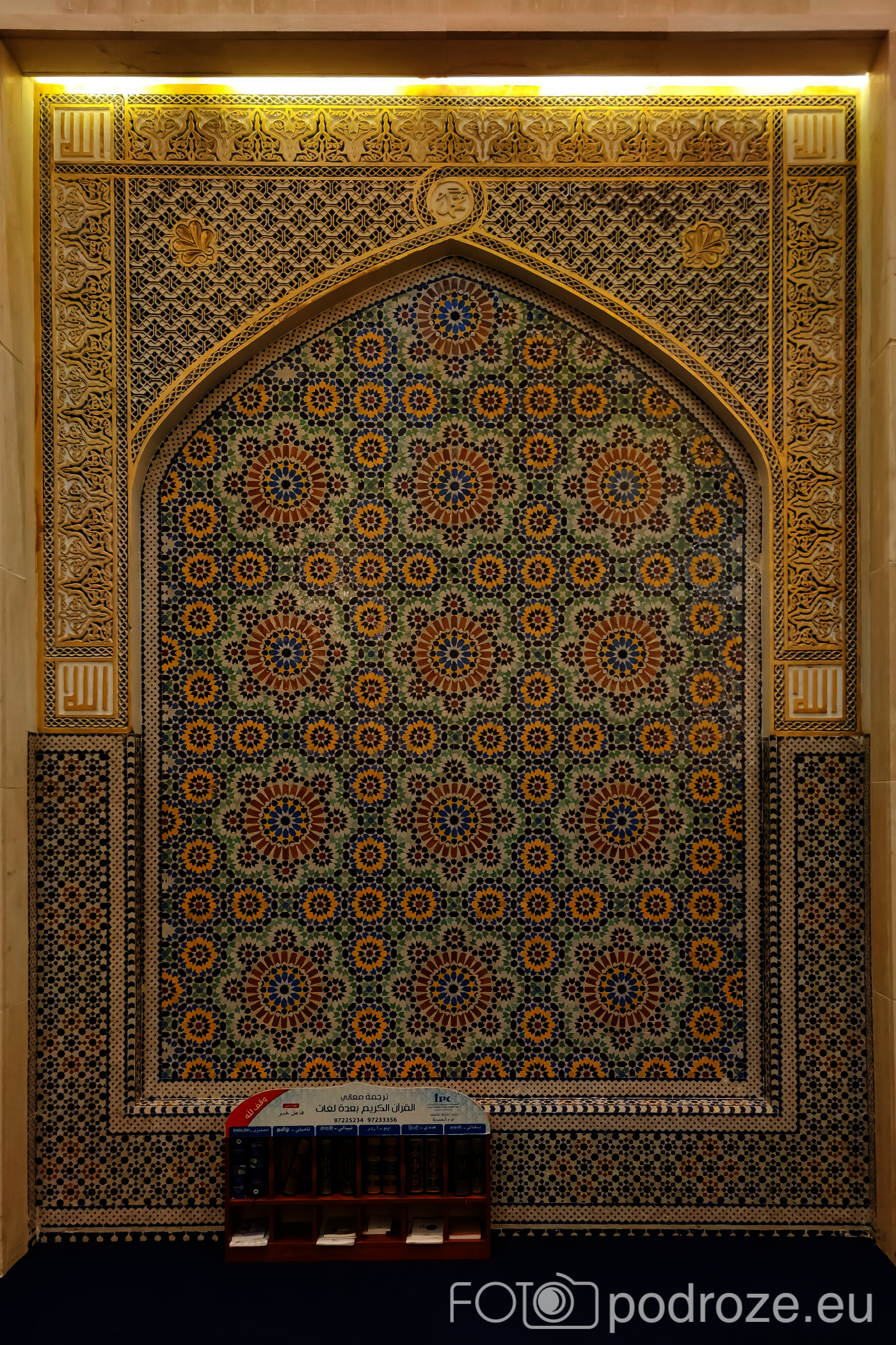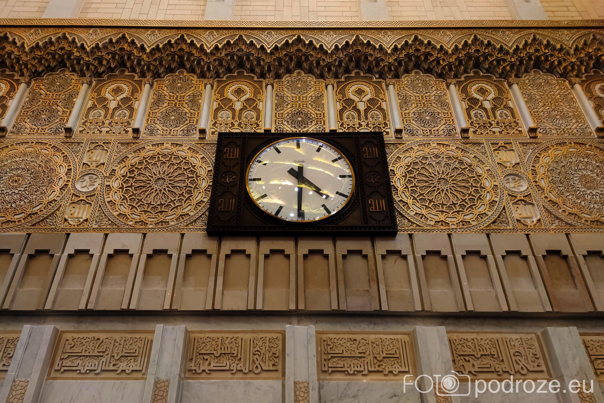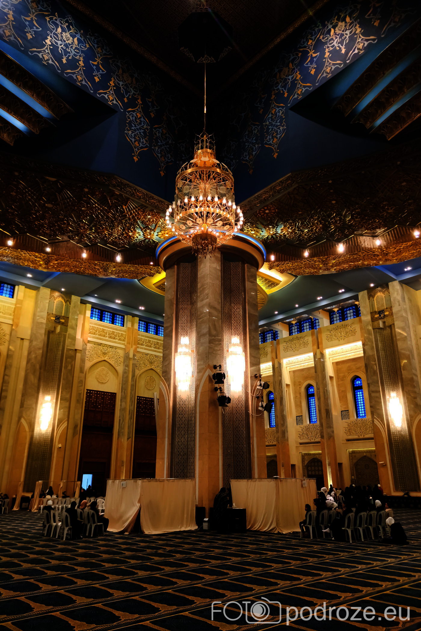 Wnętrze robi niesamowite wrażenie, zarówno kolorystyka, fantastyczne podświetlenie, jak i detale, którym się przyglądamy z bliska. A rzeźbiony jest tu każdy fragment ścian. Przewodnik pozwala wejść na podwyższenie z którego Imam wygłasza modły. Przy okazji zwraca naszą uwagę na ogromny, mięciutki, tkany ręcznie dywan, którego wzór wyznacza wiernym miejsca do stania.