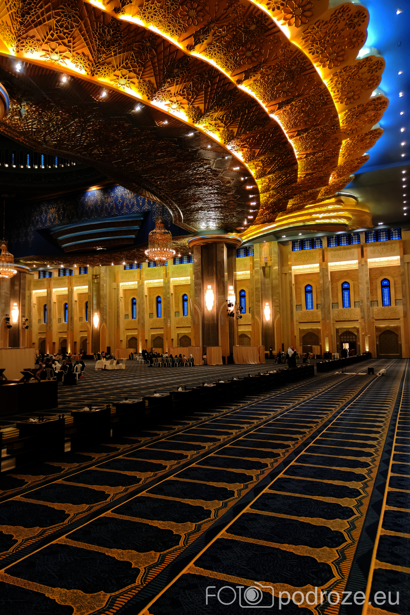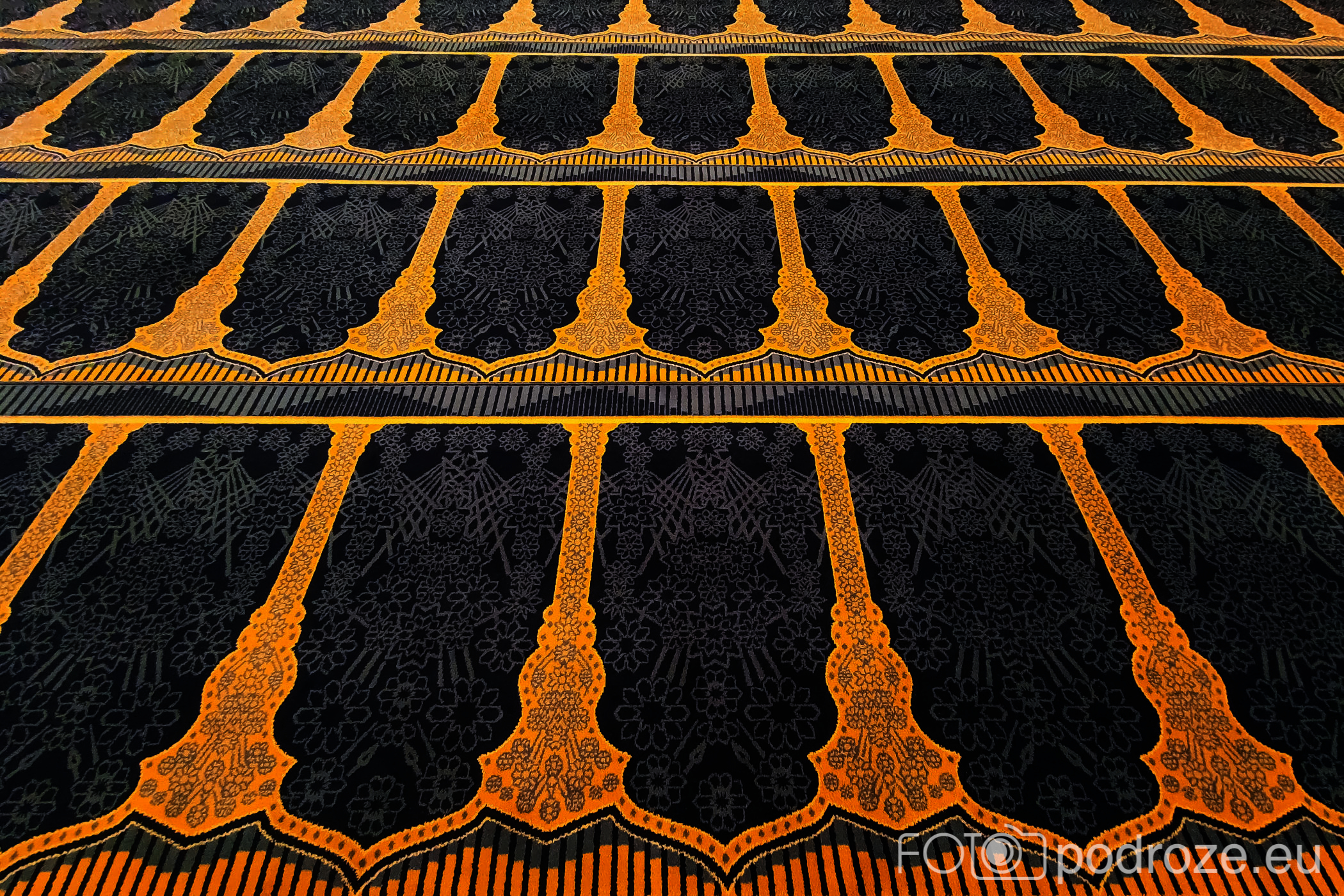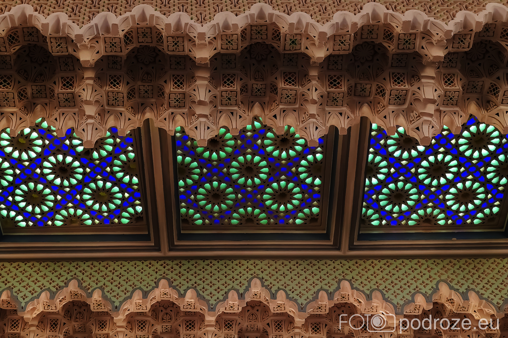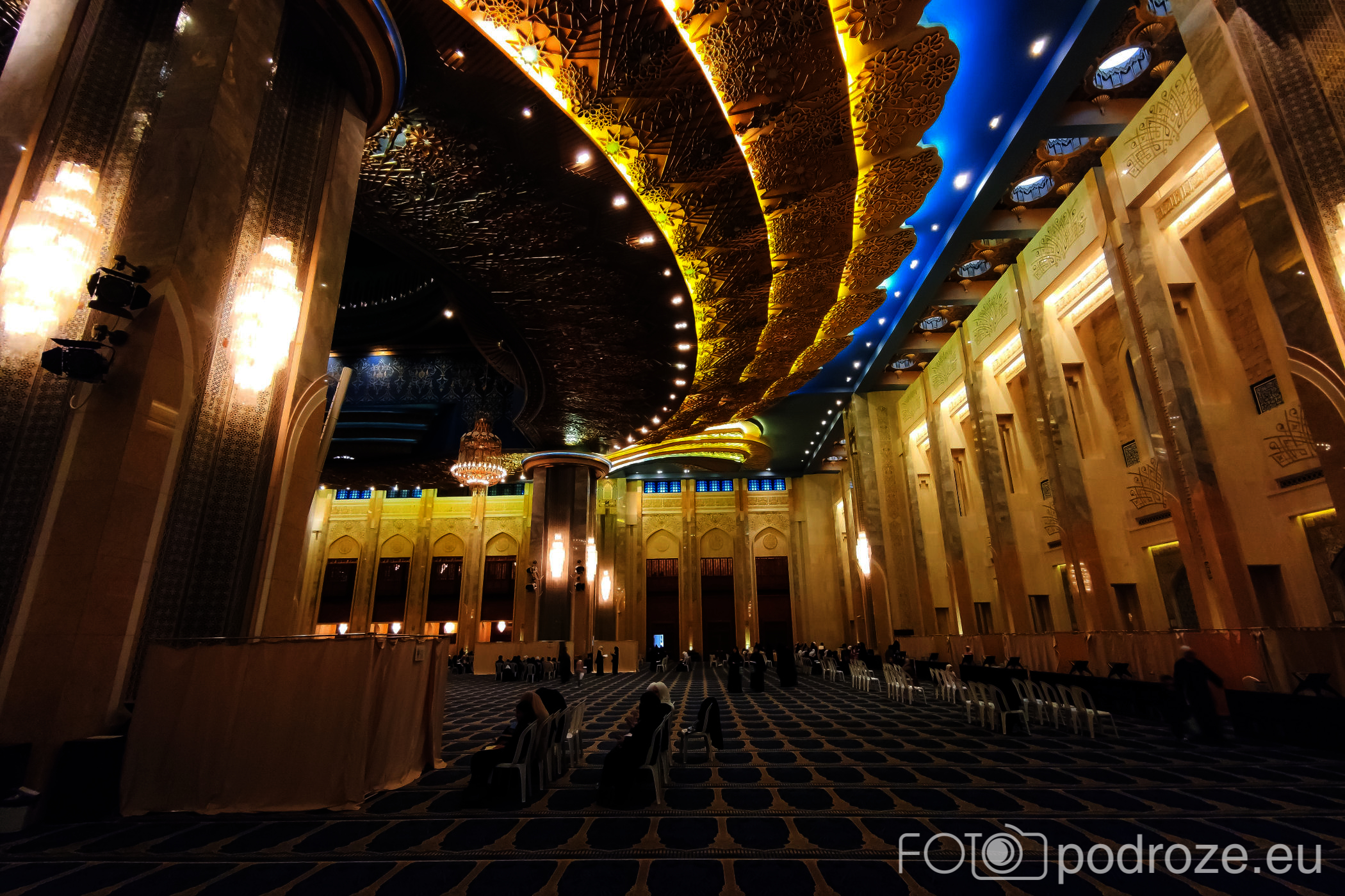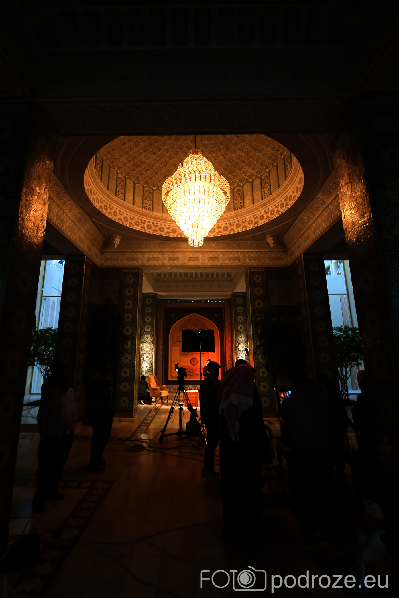 Wnętrze robi niesamowite wrażenie, zarówno kolorystyka, fantastyczne podświetlenie, jak i detale, którym się przyglądamy z bliska. A rzeźbiony jest tu każdy fragment ścian. Przewodnik pozwala wejść na podwyższenie z którego Imam wygłasza modły. Przy okazji zwraca naszą uwagę na ogromny, mięciutki, tkany ręcznie dywan, którego wzór wyznacza wiernym miejsca do stania.