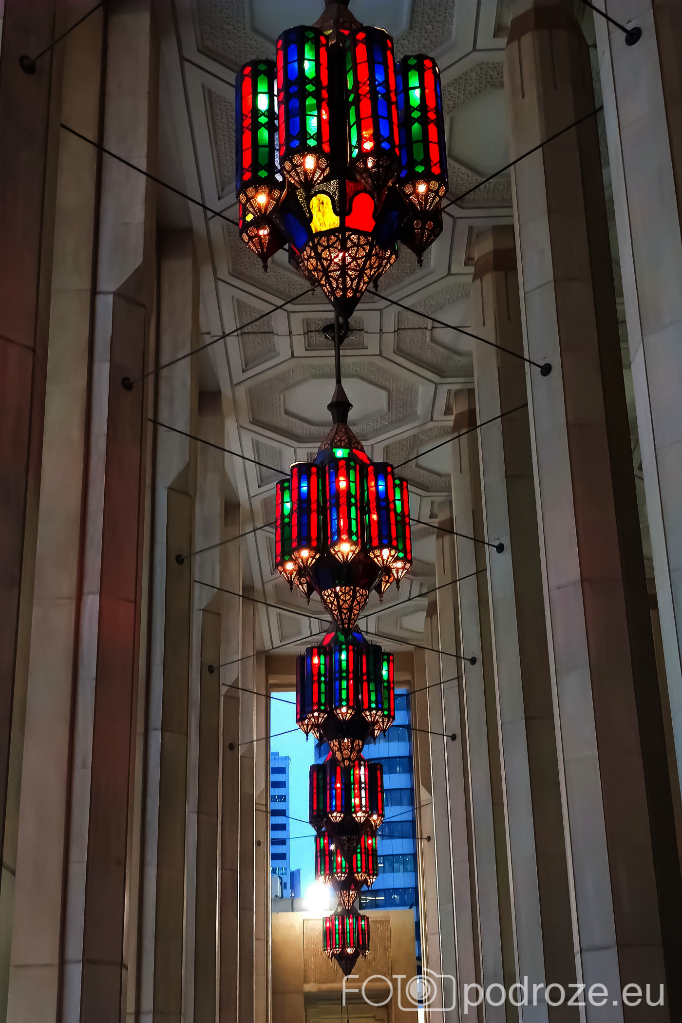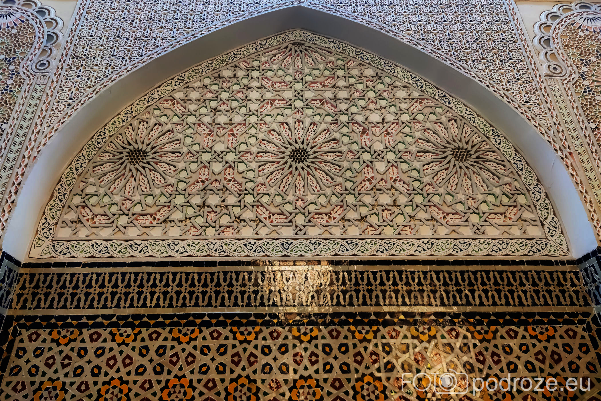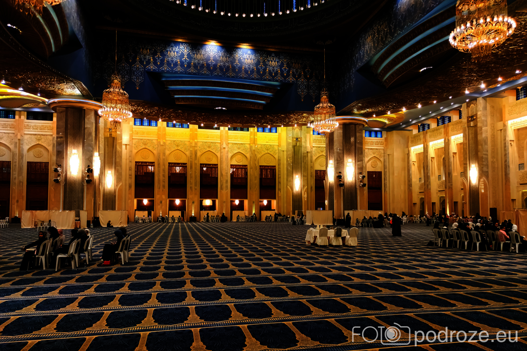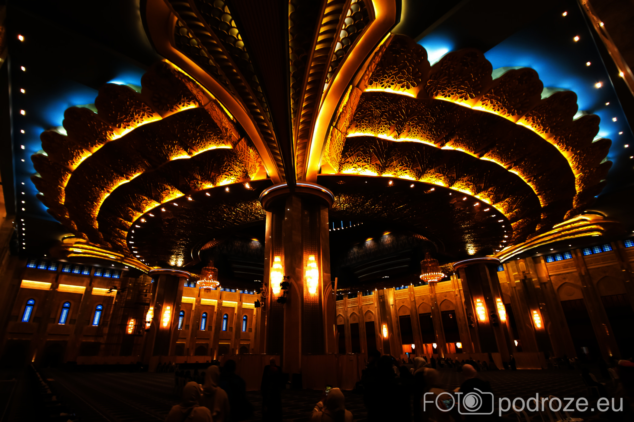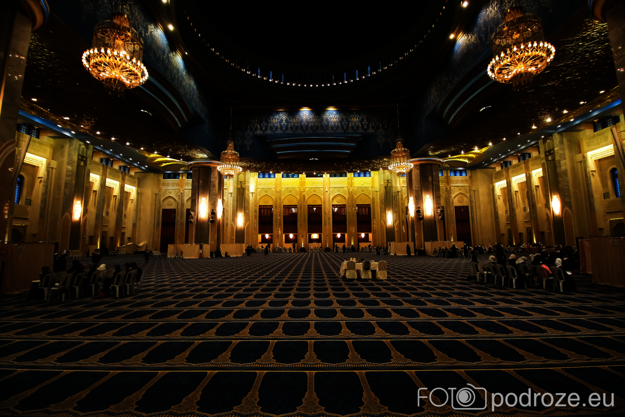 Wnętrze robi niesamowite wrażenie, zarówno kolorystyka, fantastyczne podświetlenie, jak i detale, którym się przyglądamy z bliska. A rzeźbiony jest tu każdy fragment ścian. Przewodnik pozwala wejść na podwyższenie z którego Imam wygłasza modły. Przy okazji zwraca naszą uwagę na ogromny, mięciutki, tkany ręcznie dywan, którego wzór wyznacza wiernym miejsca do stania.