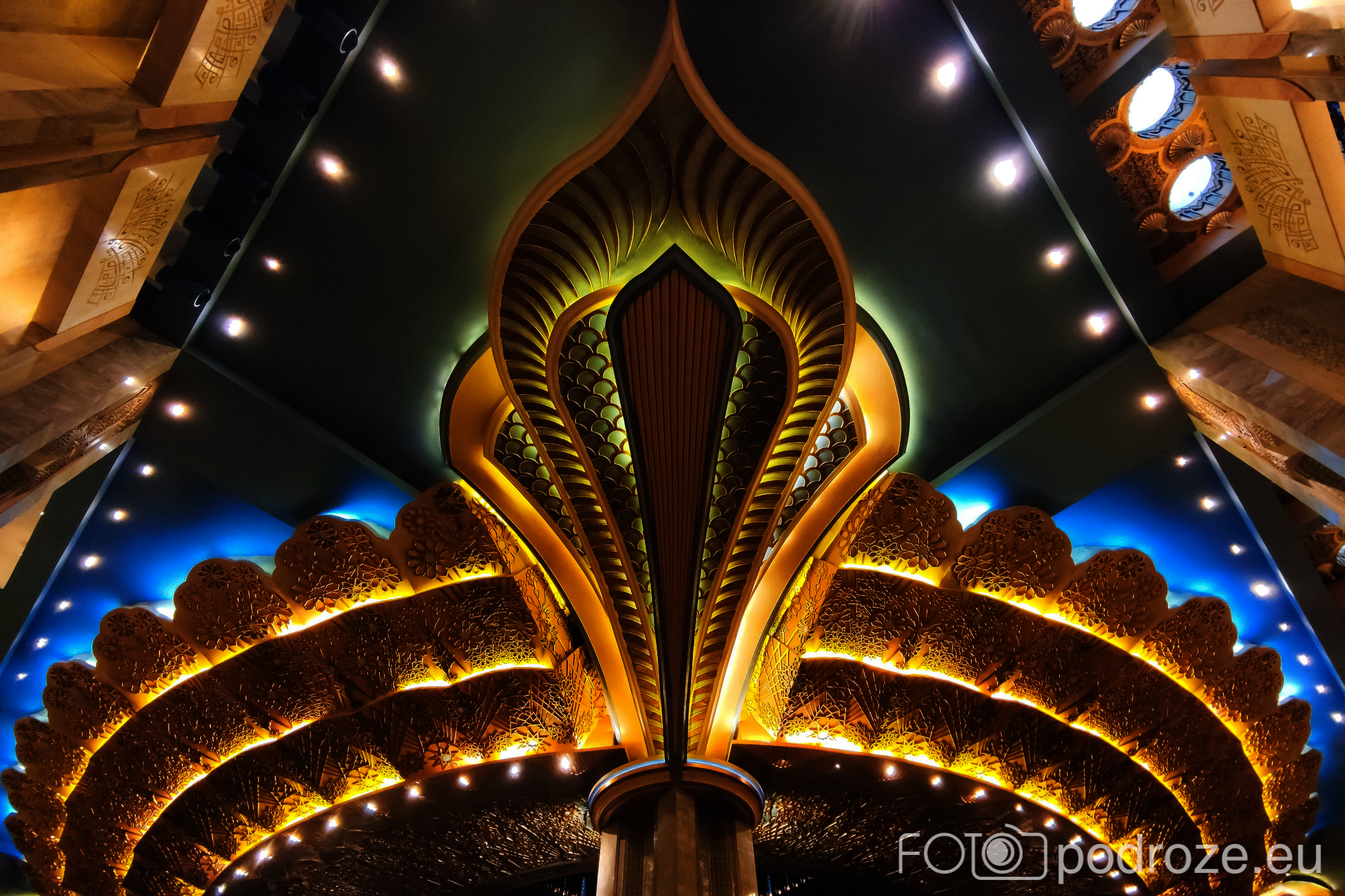 Sufit przyozdobiony jest koronkową rzeźbą w kolorze złota, która przypomina koronę. Wygląda niesamowicie.