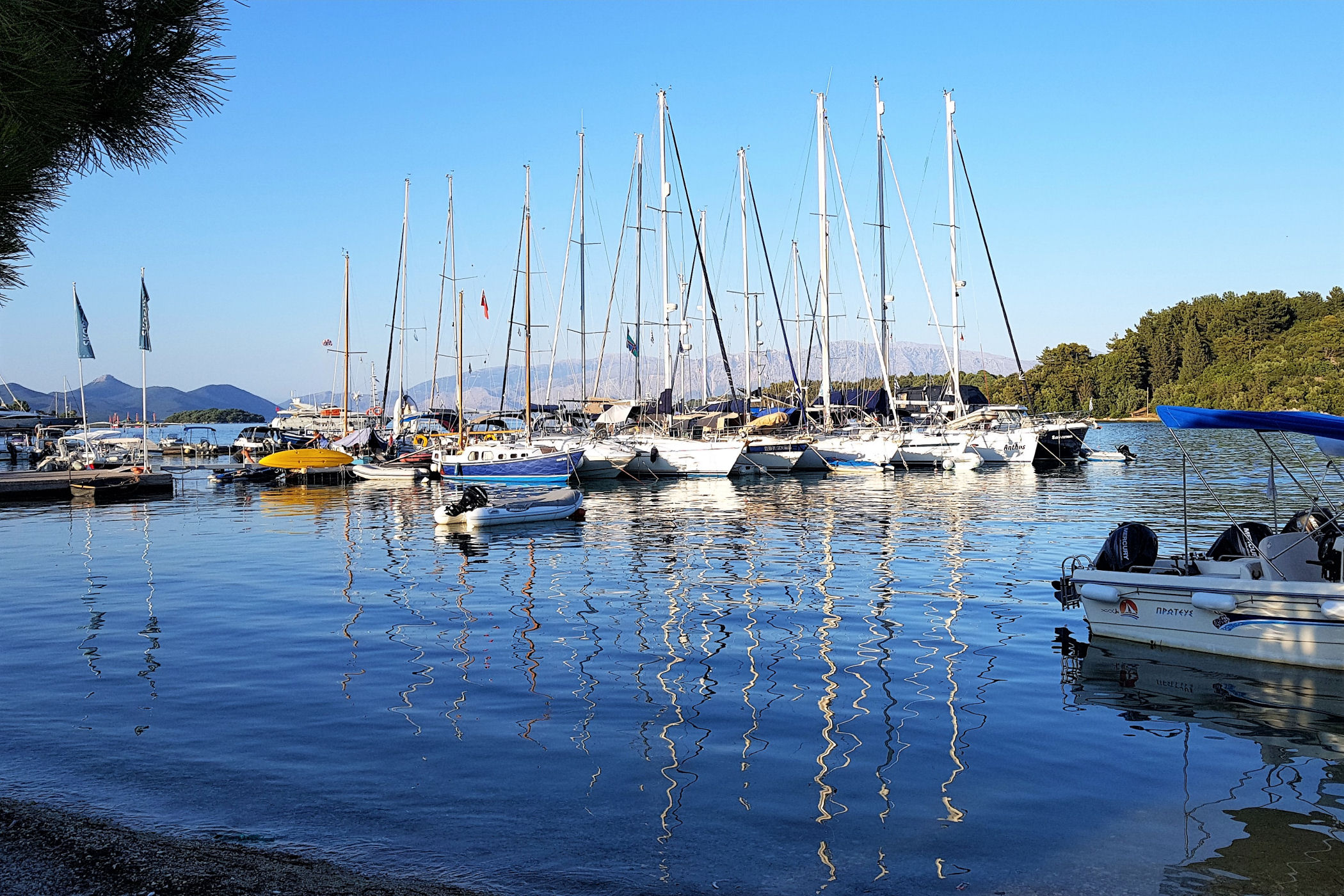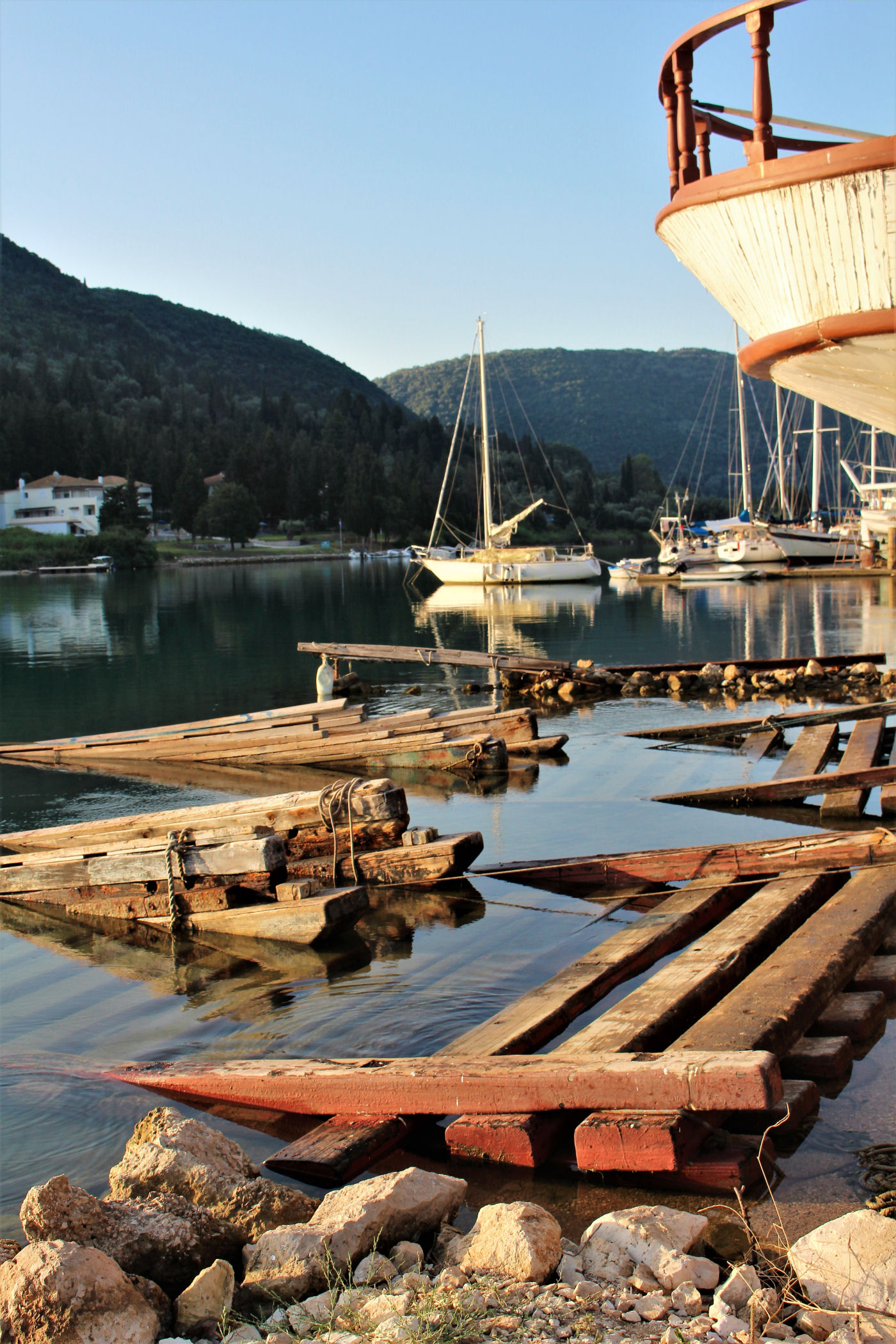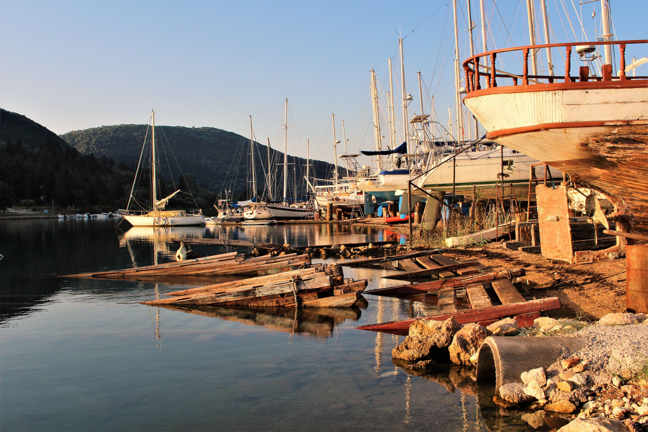 Niestety od hotelu nie da się już zajść zbyt daleko. Wzdłuż kolejnych zacumowanych jachtów dojdziemy do złomowiska łodzi. Szkoda, że nie poprowadzono drogi wzdłuż wybrzeża, bo po drugiej stronie zatoczki znajdują się urocze plaże i można by do nich dojść na piechotę, albo zajechać rowerem ( w Nidri znajdziecie sporo wypożyczalni )