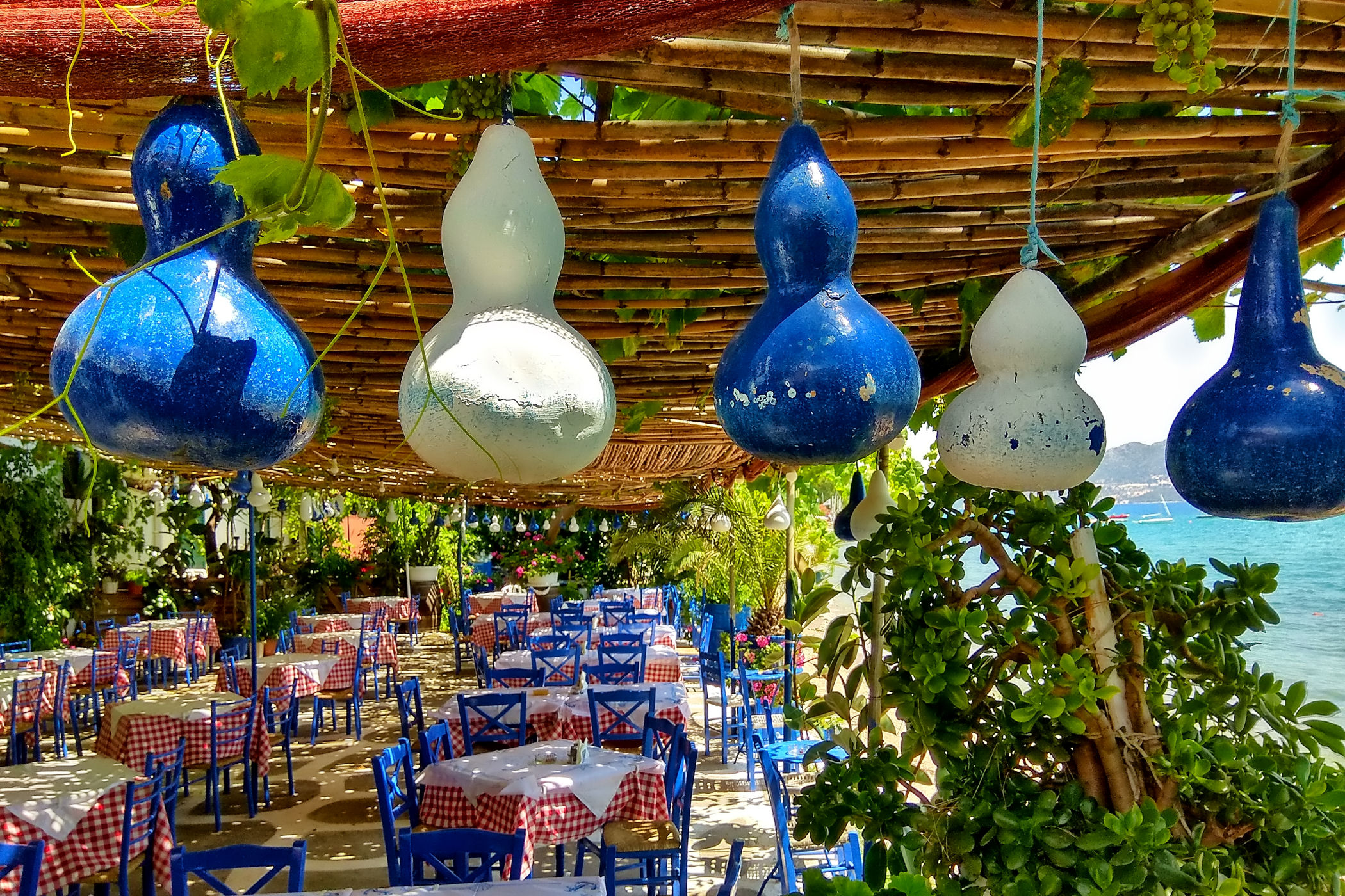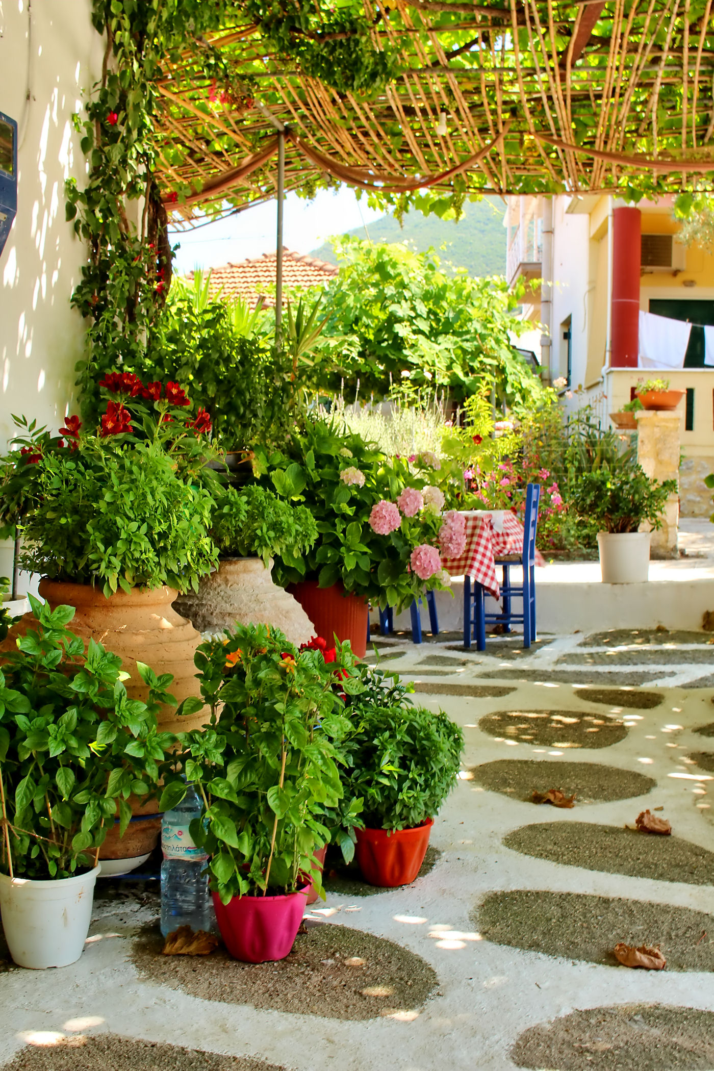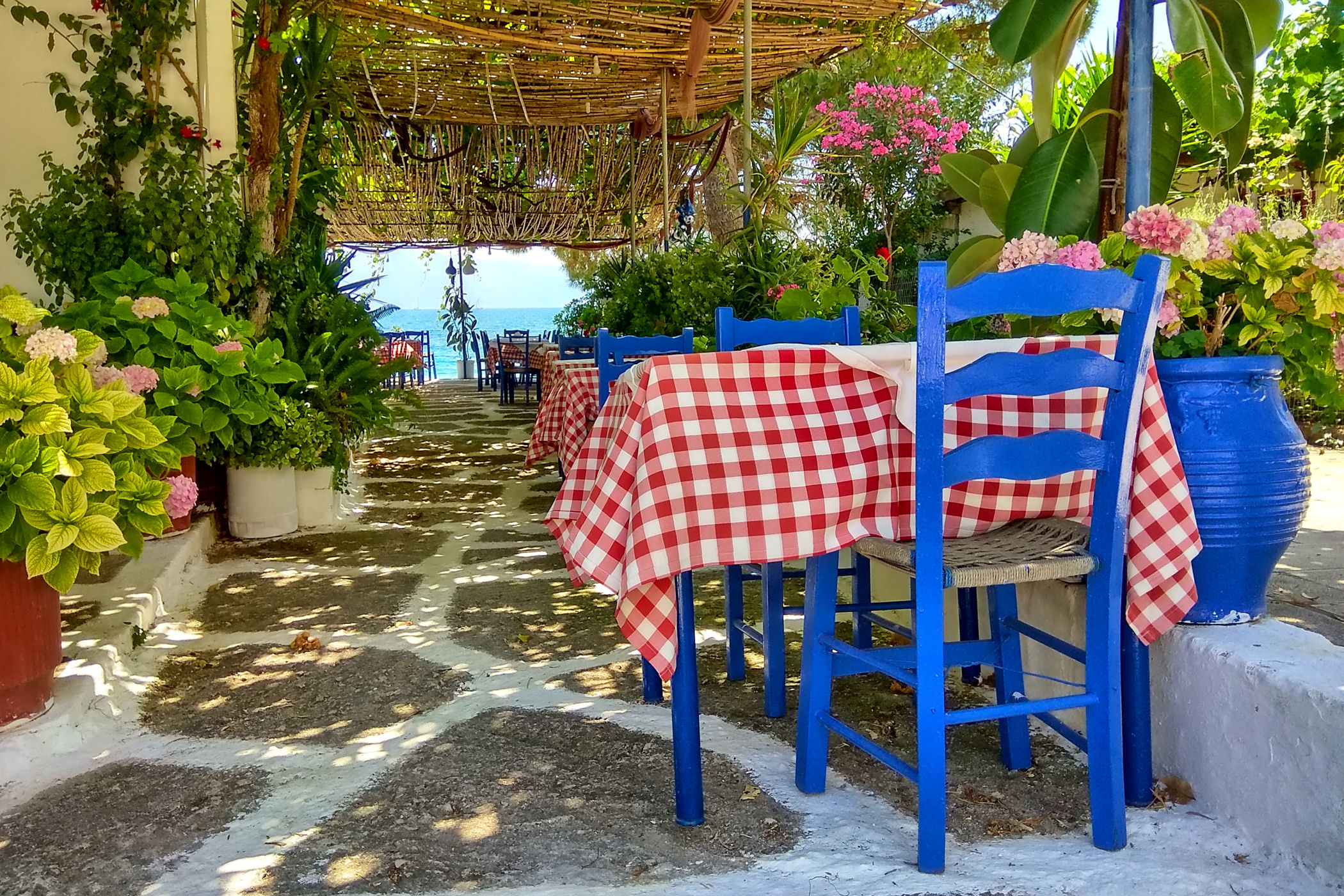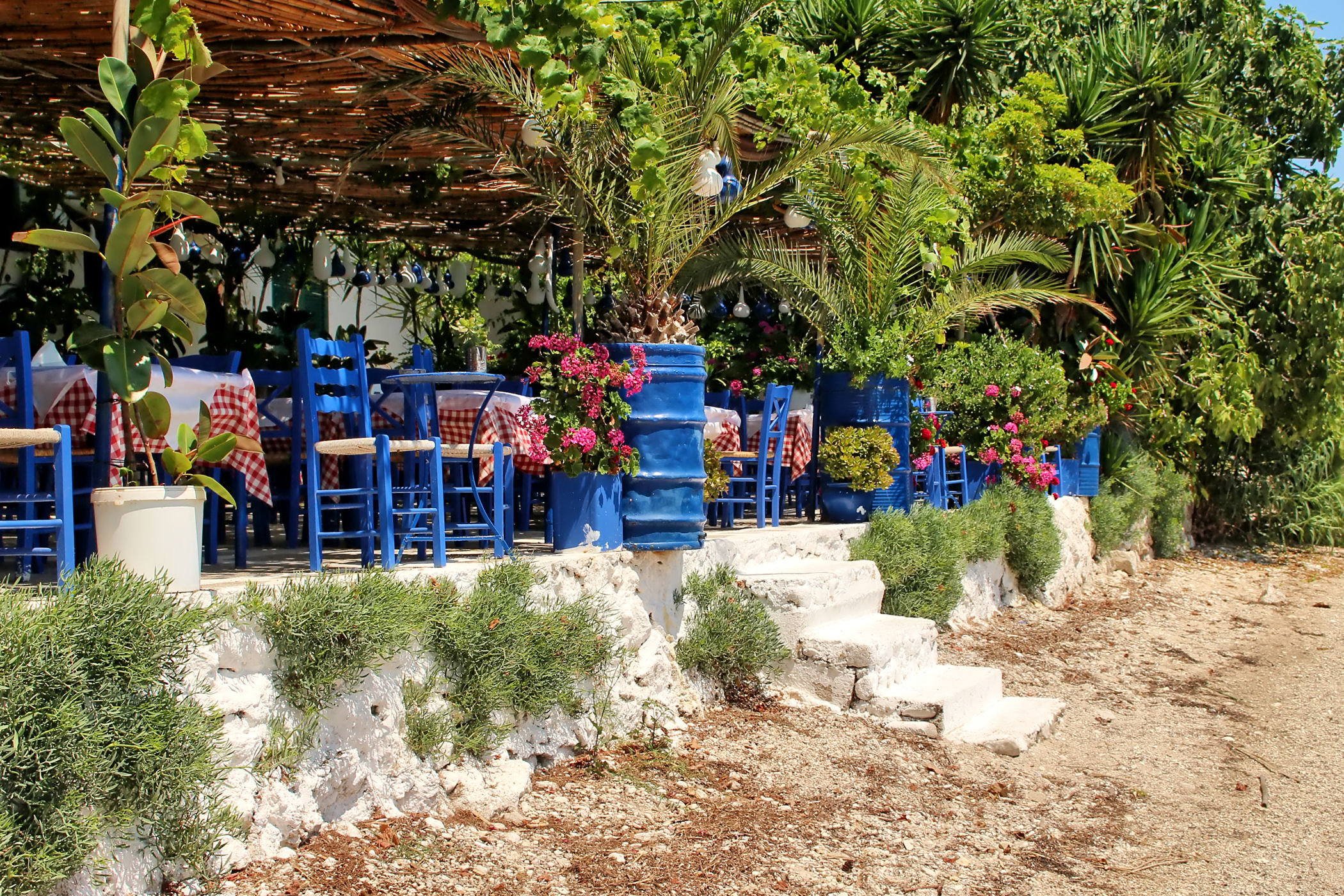 Przechodzę przez hałaśliwą plażę i już kilkaset metrów dalej znajduje kolejna sielankę. To najsympatyczniejsza tawerna jaką widziałam na wyspie . Cała zrobiona w jednym stylu, z mnóstwem kwiatów, dwukolorowymi tykwami zawieszonymi wokół. Trafiam tu jeszcze przez otwarciem, z radością więc fotografuje każdy niemal jej fragment. Po południu prowadzę tu moją rodzinkę na obiad.