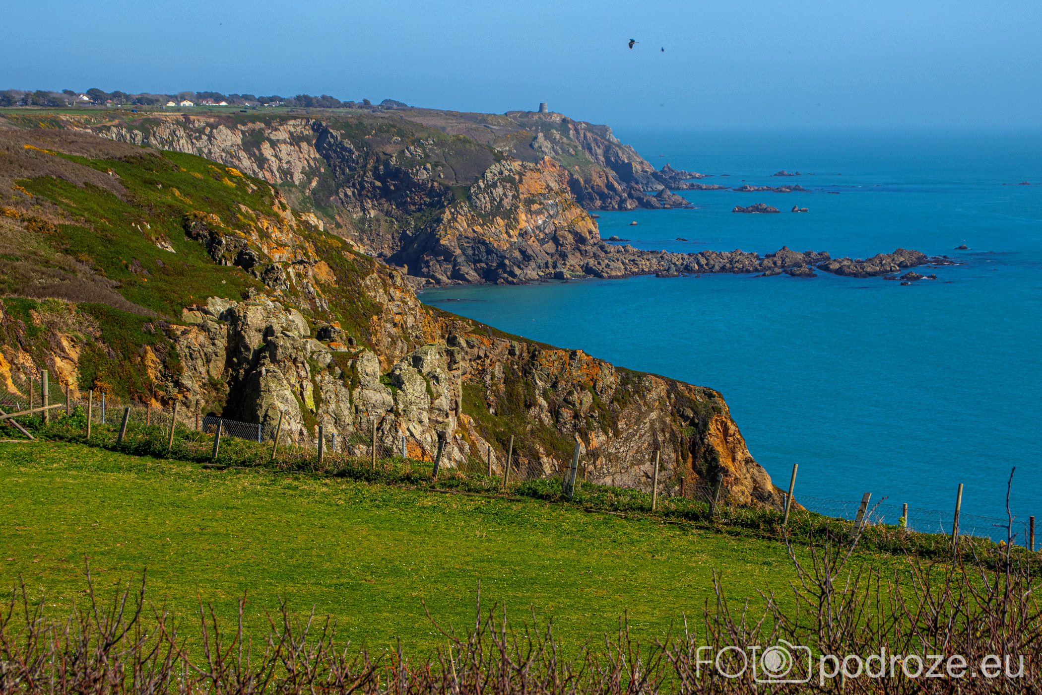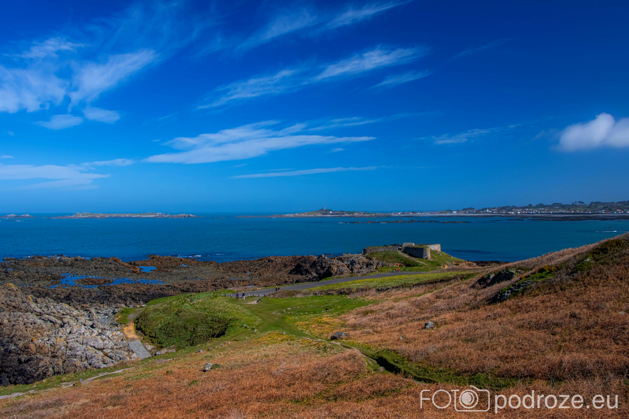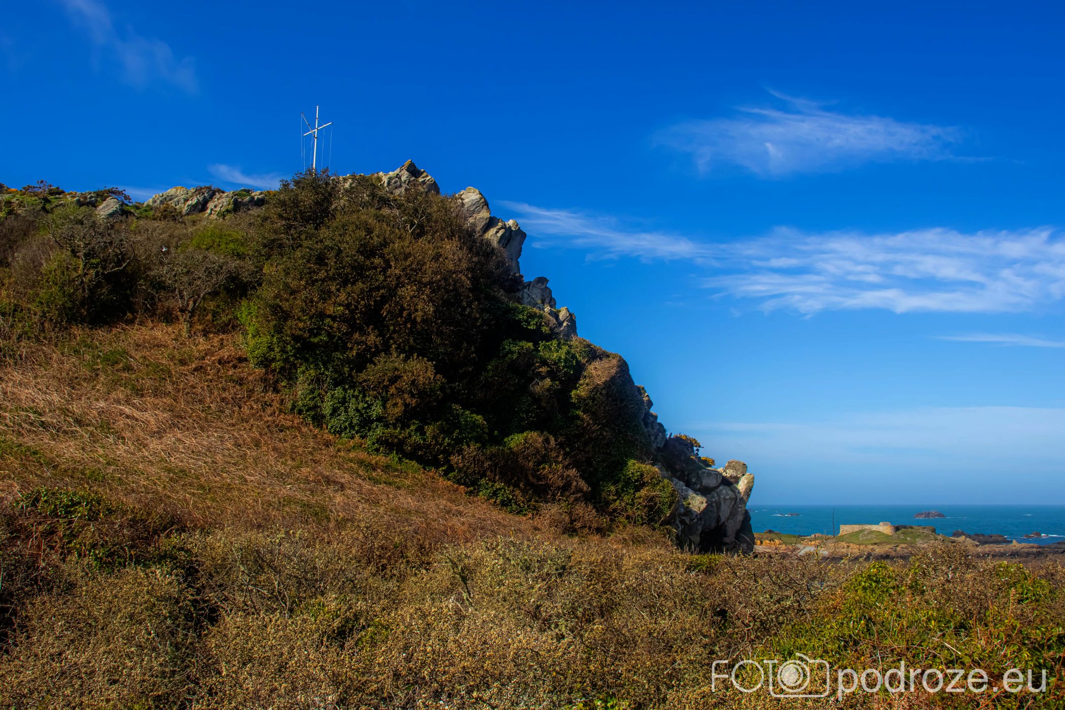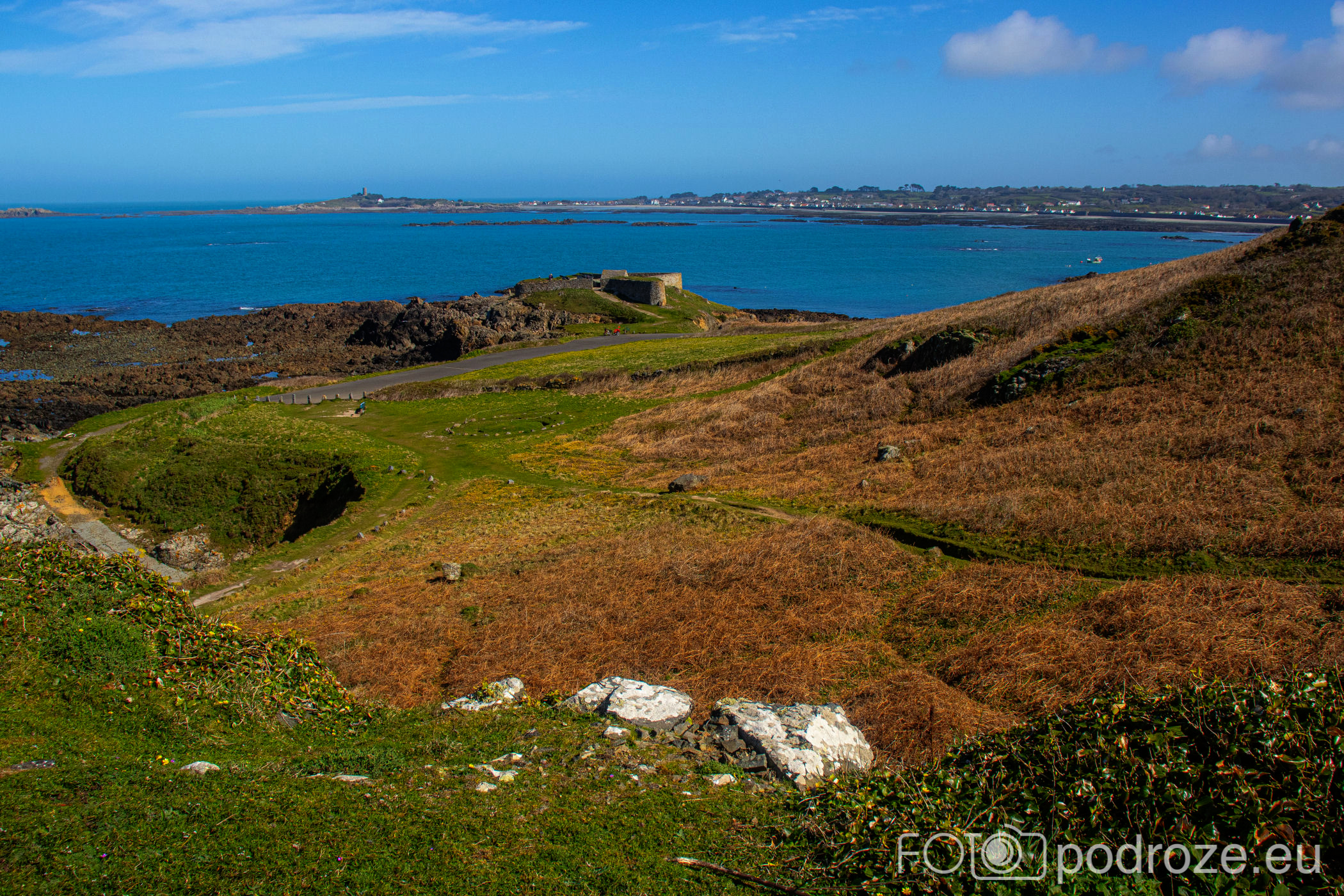 Od Fortu Pezeries warto wybrqać się dalej szlakiem na górę i niesamowity punkt widokowy. Po drodze otwierają się widoki na zatokę Portelet, klify i w oddali Fort Grey. Na szczycie rozciąga się szeroka panorama na ocean i wyspę Lihou.