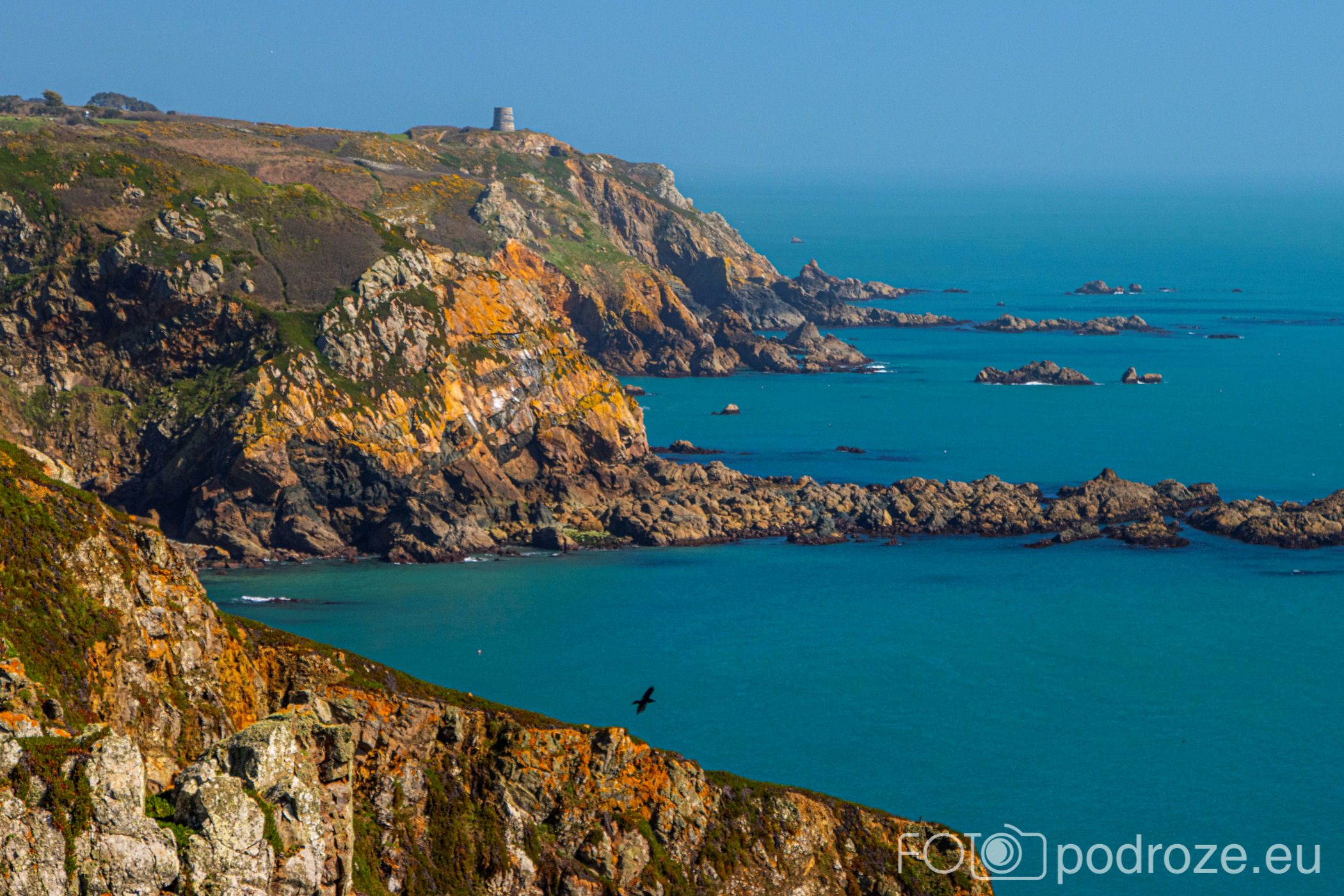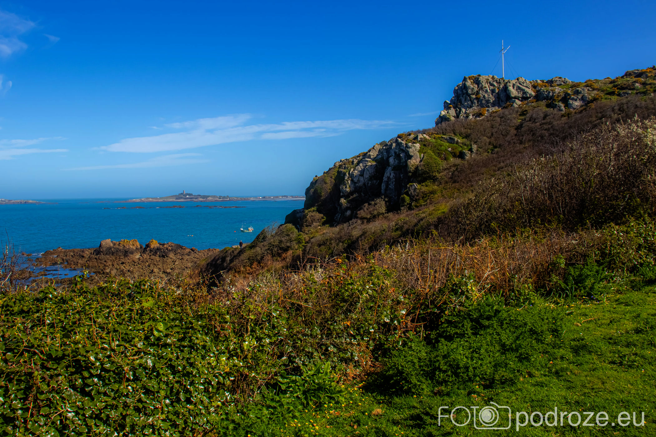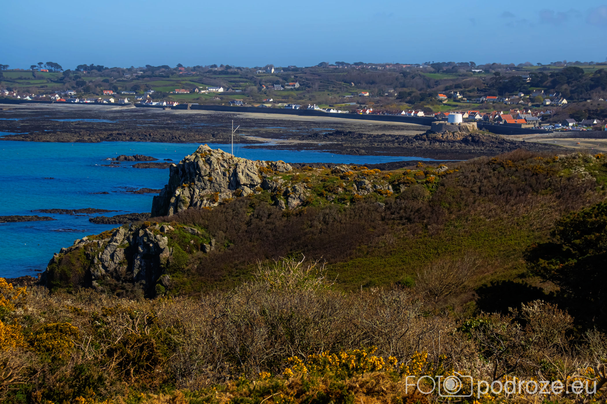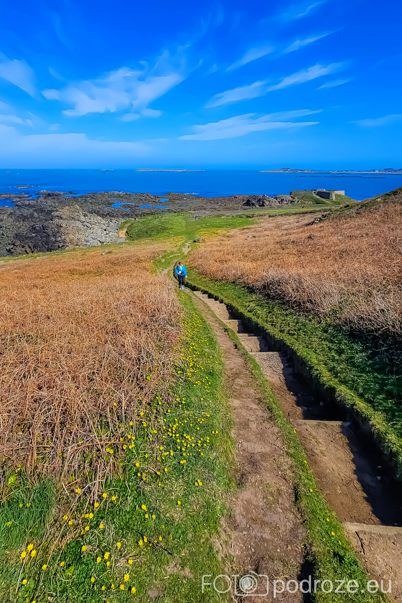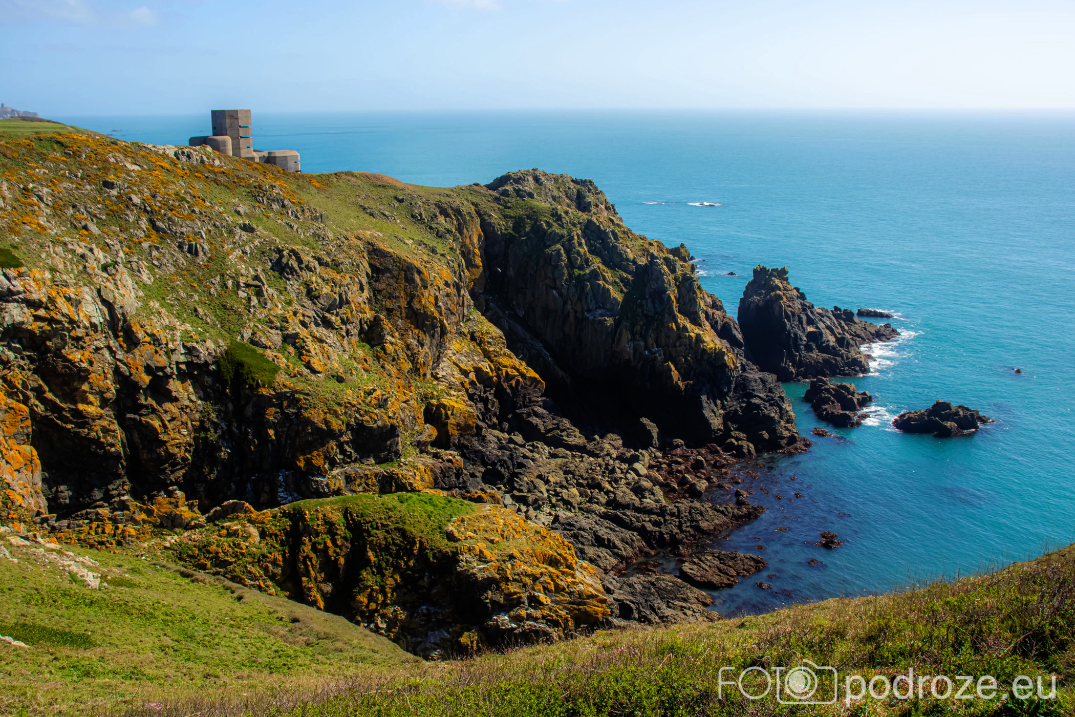 Od Fortu Pezeries warto wybrqać się dalej szlakiem na górę i niesamowity punkt widokowy. Po drodze otwierają się widoki na zatokę Portelet, klify i w oddali Fort Grey. Na szczycie rozciąga się szeroka panorama na ocean i wyspę Lihou.